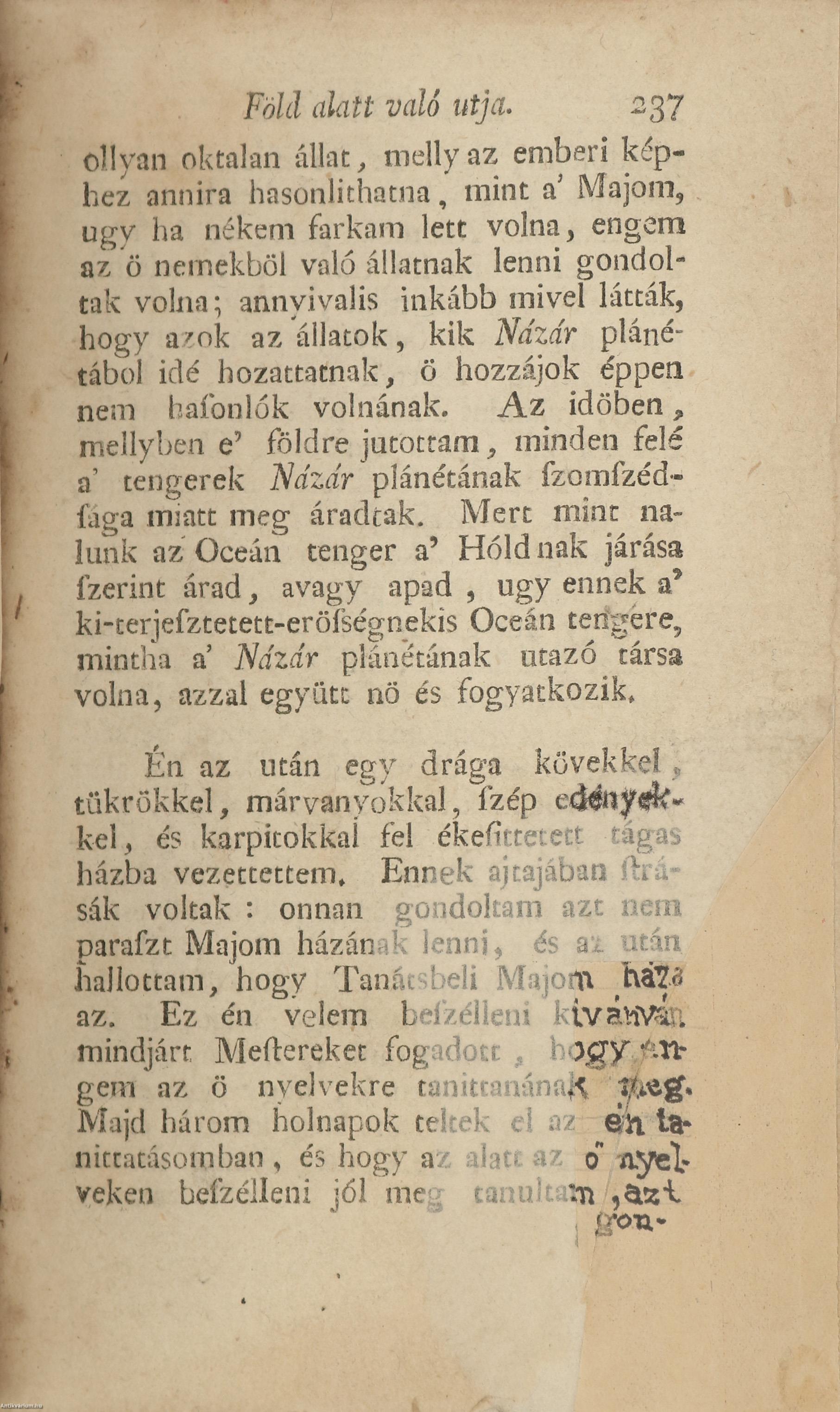 Esvén értesünkre, hogy ezen Historiának igazságát némelly hihetetlen emberek kétségbe vették, következésképpen hogy e' Föld alatt való Utról irtt Könyvben elöl-adattatott dolgok fel's alá bal itélettel és hirekkel hordoztatnak; illendönek találtuk, hogy ezt a ujj nyomtatást a' hireknek meg-elözésére némelly Haza-fiaknak bizonyság tételével meg-erösitsük.