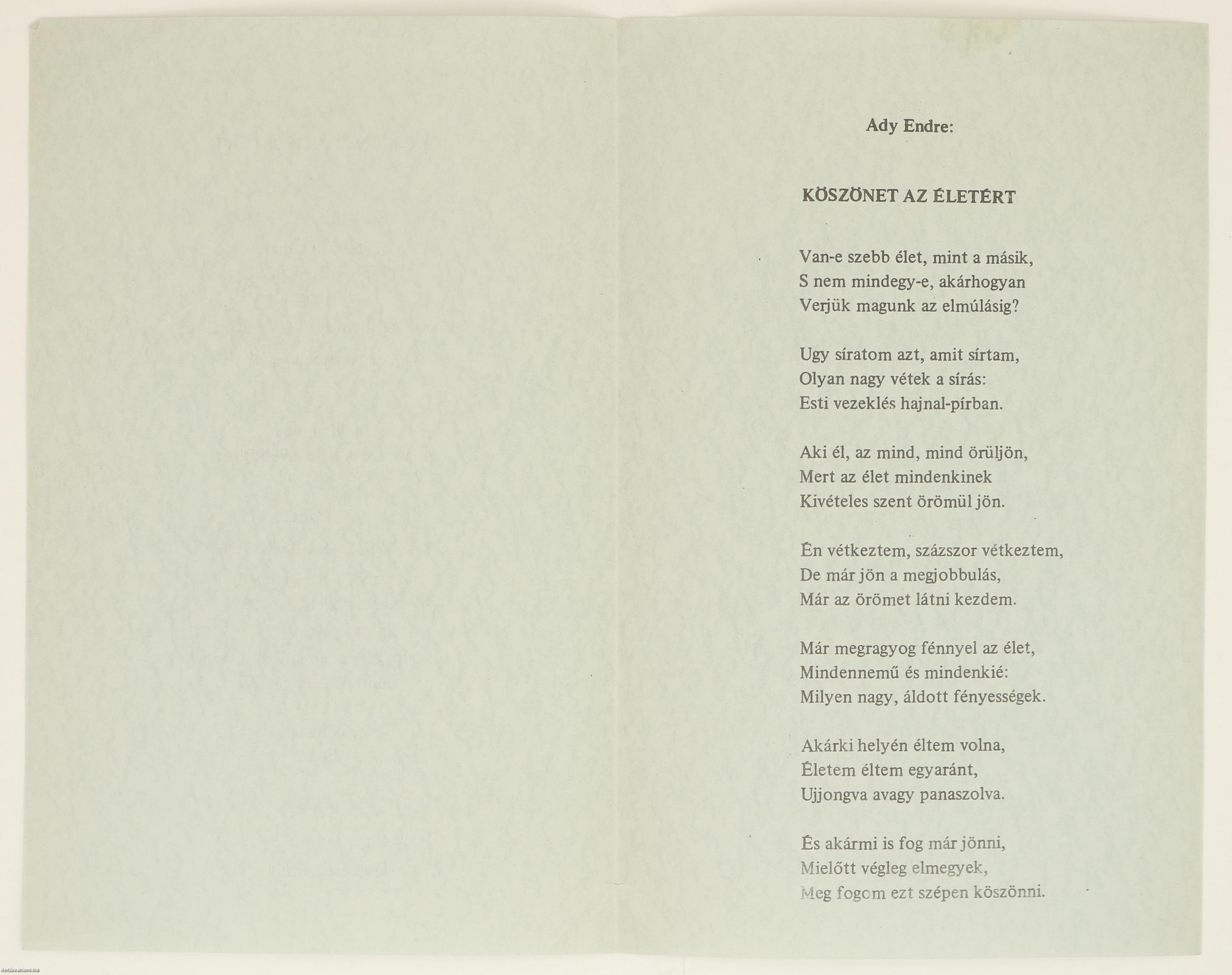 Ady Endre születésének centenáriumára kiadott, kis példányszámú nyomtatvány a költő Köszönet az életért c. versével. A névre szólóan kiállítható kiadvány jelen példányában a névbeírás helye kitöltetlen.