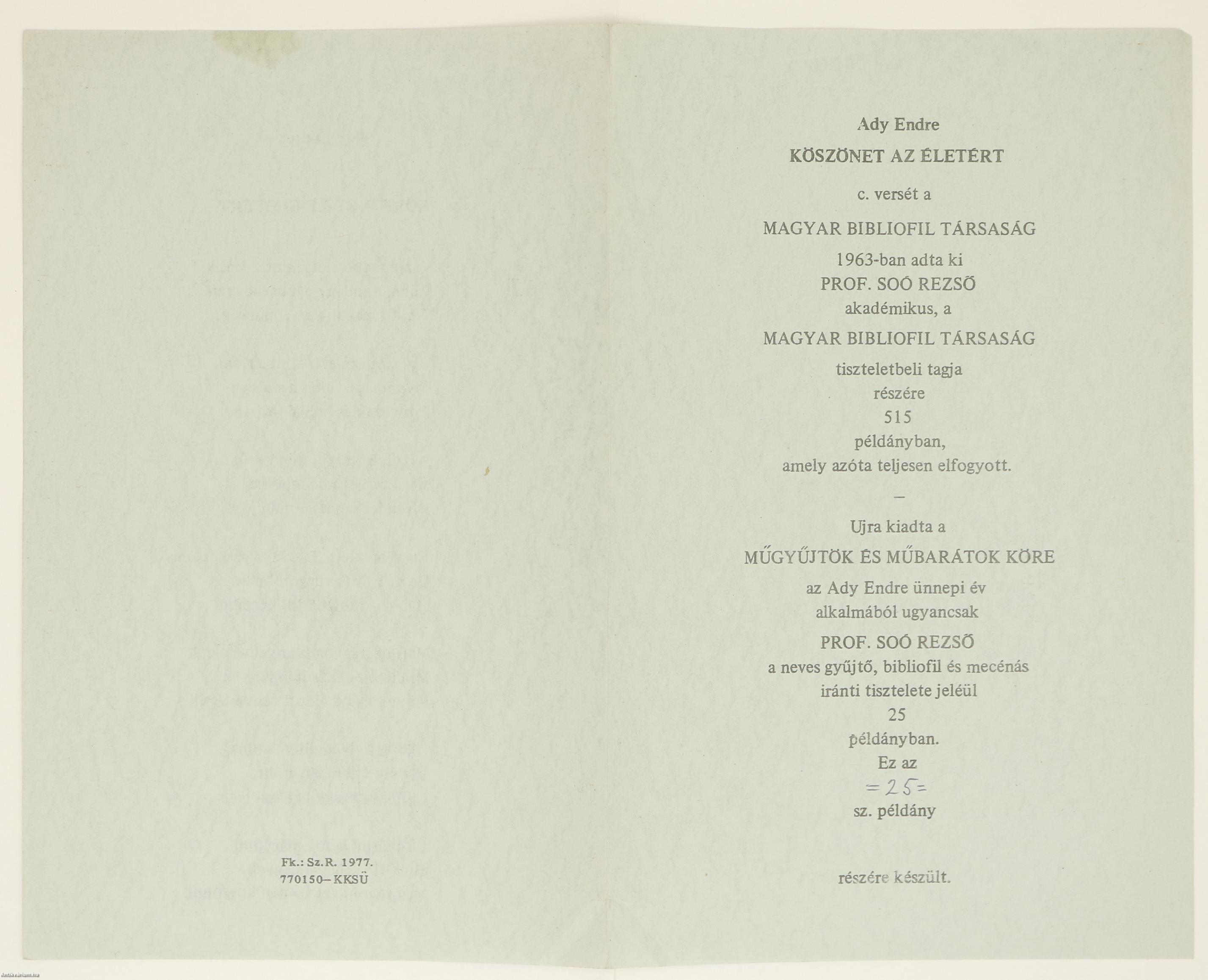 "Ady Endre KÖSZÖNET AZ ÉLETÉRT c. versét a MAGYAR BIBLIOFIL TÁRSASÁG 1963-van adta ki PROF. SOÓ REZSŐ akadémikus, a MAGYAR BIBLIOFIL TÁRSASÁG tiszteletbeli tagja részére 515 példányban, amely azóta teljesen elfogyott. – Ujra kiadta a MŰGYŰJTŐK ÉS MŰBARÁTOK KÖRE az Ady Endre ünnepi év alkalmából ugyancsak PROF. SOÓ REZSŐ a neves gyűjtő, bibliofil és mecénás iránti tisztelete jeléül 25 példányban. Ez az 25. sz. példány ... részére készült."