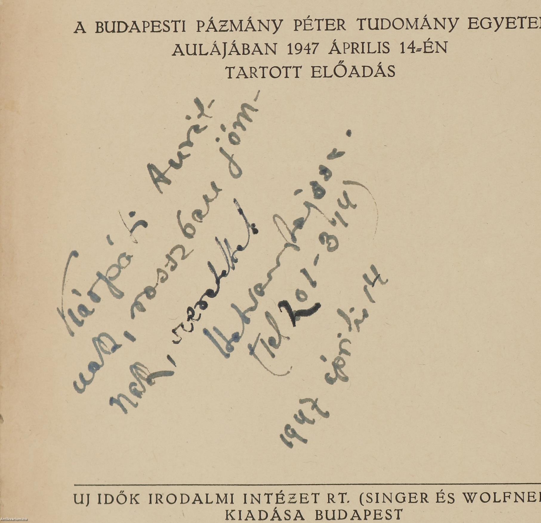 A budapesti Pázmány Péter Tudomány Egyetem aulájában 1947 április 14-én tartott előadás
