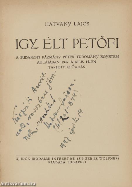 Szerző által dedikált példány. Első kiadás. Így élt Petőfi. A Budapesti Pázmány Péter Tudományegyetem aulájában 1947. április 14.-én tartott előadás. Írta: Hatvany Lajos.