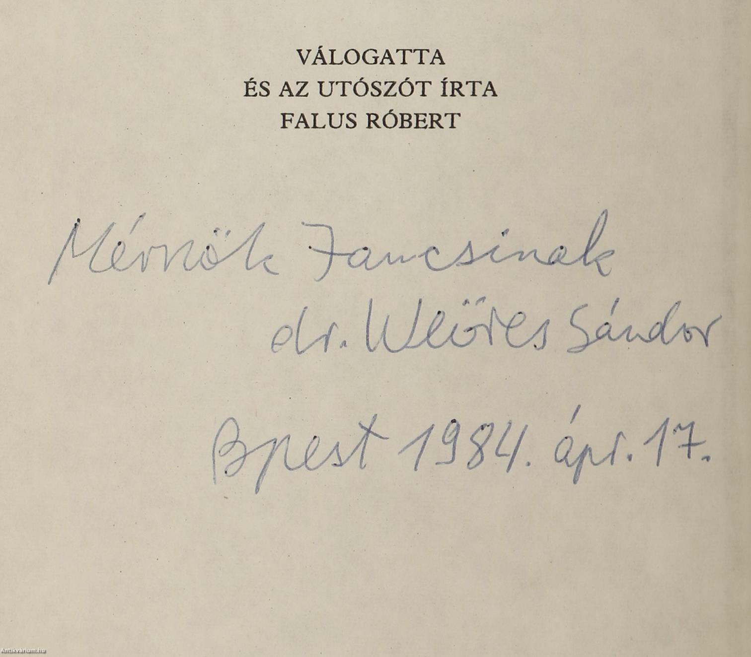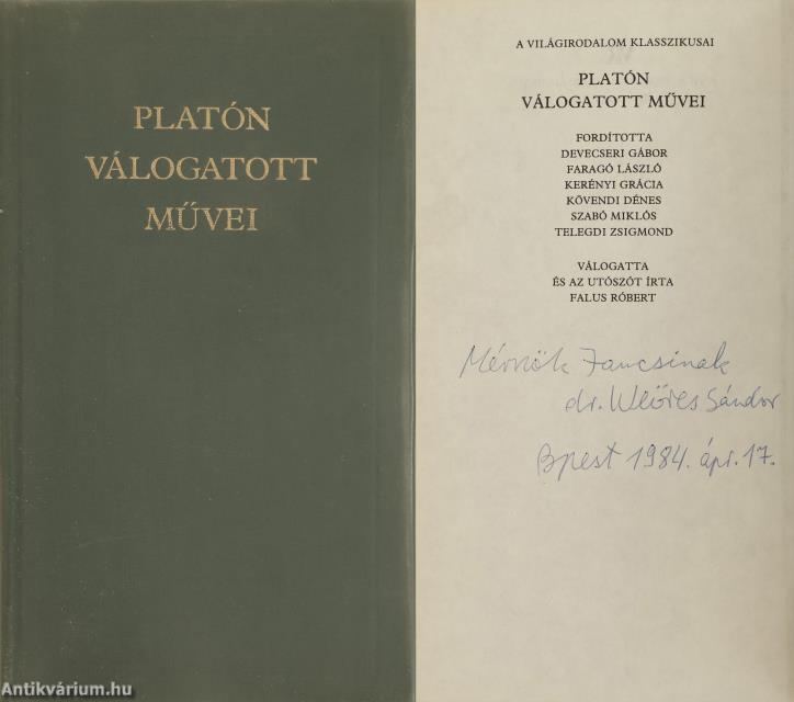 Weöres Sándor ajándékozási bejegyzésével ellátott példány. A világirodalom klasszikusai c. sorozatban (számjelzés nélkül) megjelent mű. A sorozatot Domonkos János szerkeszti. Platon válogatott művei. Fordította: Devecseri Gábor, Faragó László, Kerényi Grácia, Kövendi Dénes, Szabó Miklós és Telegdi Zsigmond. Válogatta és az utószót írta: Falus Róbert. Az előlap hátoldalán, Weöres Sándor Kossuth- és Baumgarten-díjas költő, író tollal beírt ajándékozási bejegyzése olvasható: "M. J.-nak Dr. Weöres Sándor. Bpest 1984. ápr. 17." Utószóval, szövegmagyarázatokkal, jegyzetszótárral és tartalomjegyzékkel kiegészített kötet. A címlapon tollal és ceruzával írt bejegyzés látható. Szedte és nyomta az Alföldi Nyomda, Debrecenben. Kiadói egészvászon kötésben lévő példány aranyozott feliratozású címfedéllel és könyvgerinccel, színes, kiadói előzéklapokkal, hiánytalan, jó állapotban, kiadói nylon borítófedélben. A kötetbe ajándékozási bejegyzést írt, Weöres Sándor (Szombathely, 1913. június 22. – Budapest, 1989. január 22.) Kossuth- és Baumgarten-díjas költő, író, műfordító, irodalomtudós. Az Erzsébet Tudományegyetem filozófia-esztétika szakon szerzett diplomát. Egyetemi évei alatt a Batsányi Kör és a Janus Pannonius Társaság munkájába is bekapcsolódott, valamint megalapította a Pécs jelképére utaló "Öttorony" című folyóiratot. 1934-ben Kárpáti Aurél Új Magyar Líra c. válogatásában már ő is helyet kapott, egy év múlva pedig napvilágot látott a tizenkét fiatal költőt felvonultató "Korunk" c. antológia. A "Nyugat" 1941 augusztusi megszűnése után Weöres a "Sorsunk"-on kívül elsősorban a "Magyar Csillag"-ban, a "Válasz"-ban, később pedig a "Diárium"-ban közölte verseit. 1943 őszén a költő a fővárosba költözött, és az Országos Széchényi Könyvtár munkatársa lett. Később székesfehérvári múzeumi tisztviselőként, a Vörösmarty Társaság tagjaként, illetve az MTA könyvtárosaként tevékenykedett. Weöres Sándor a magyar líra meghatározó, markáns egyénisége. Kifinomult, több rétegű, sokoldalú költészete formabontó és példaértékű lett a magyar lírában. Műfordításait a játékosság, a lényeglátás és a formai szabadság jellemzi.