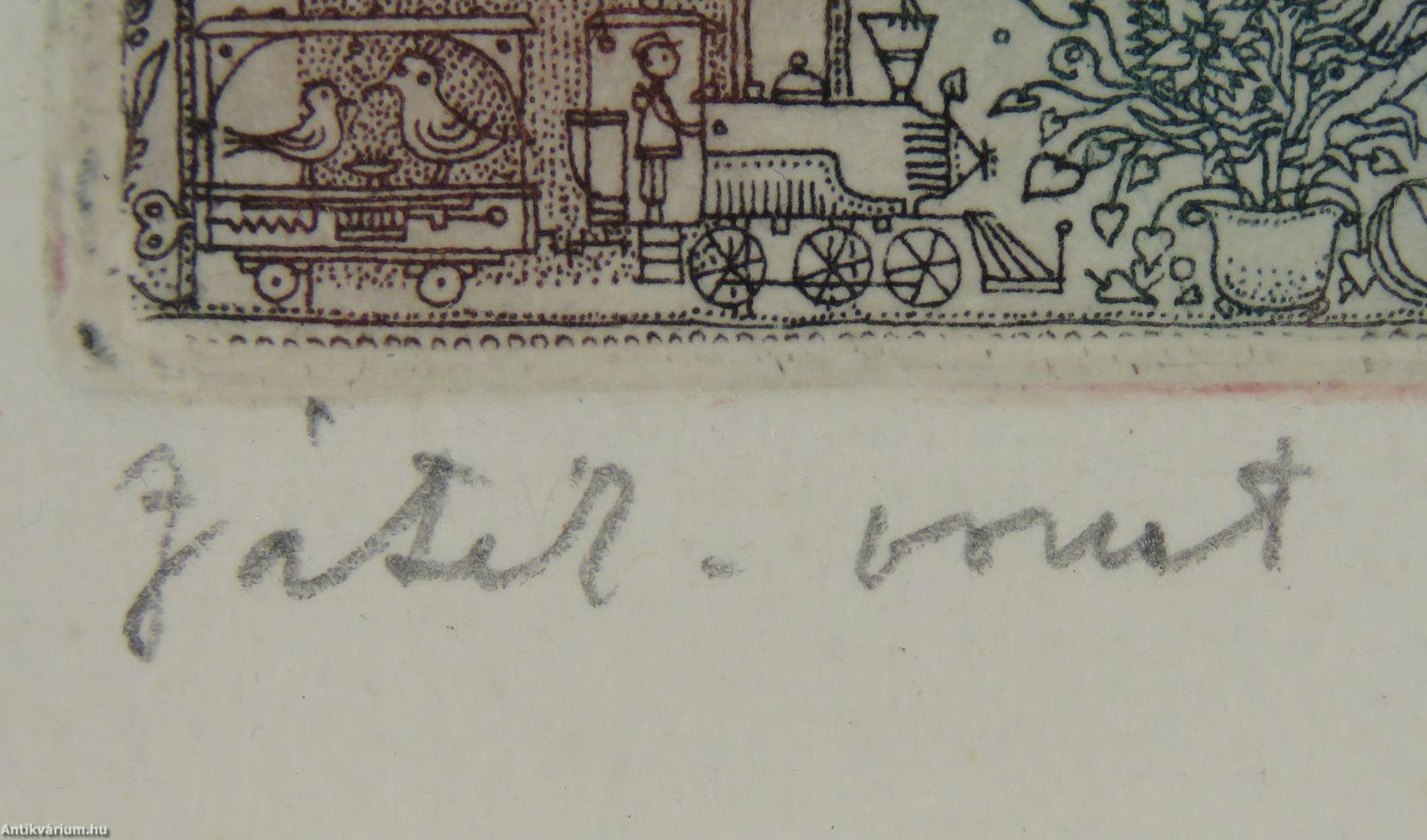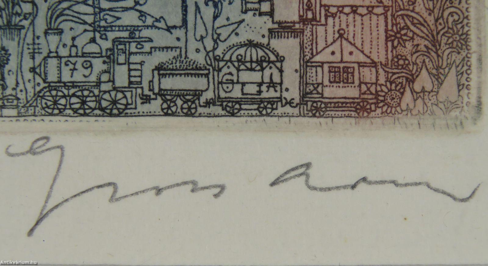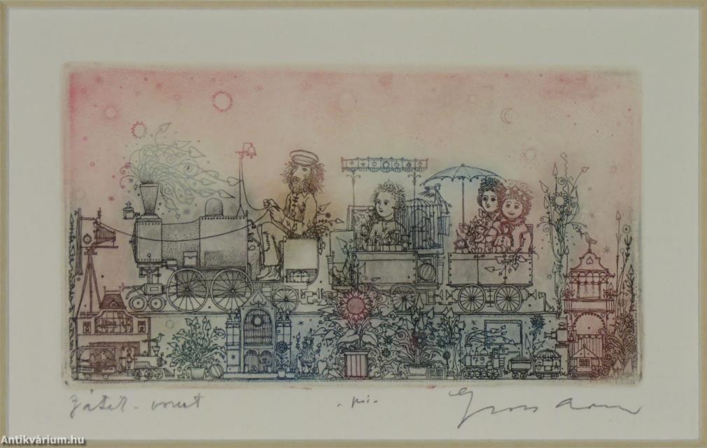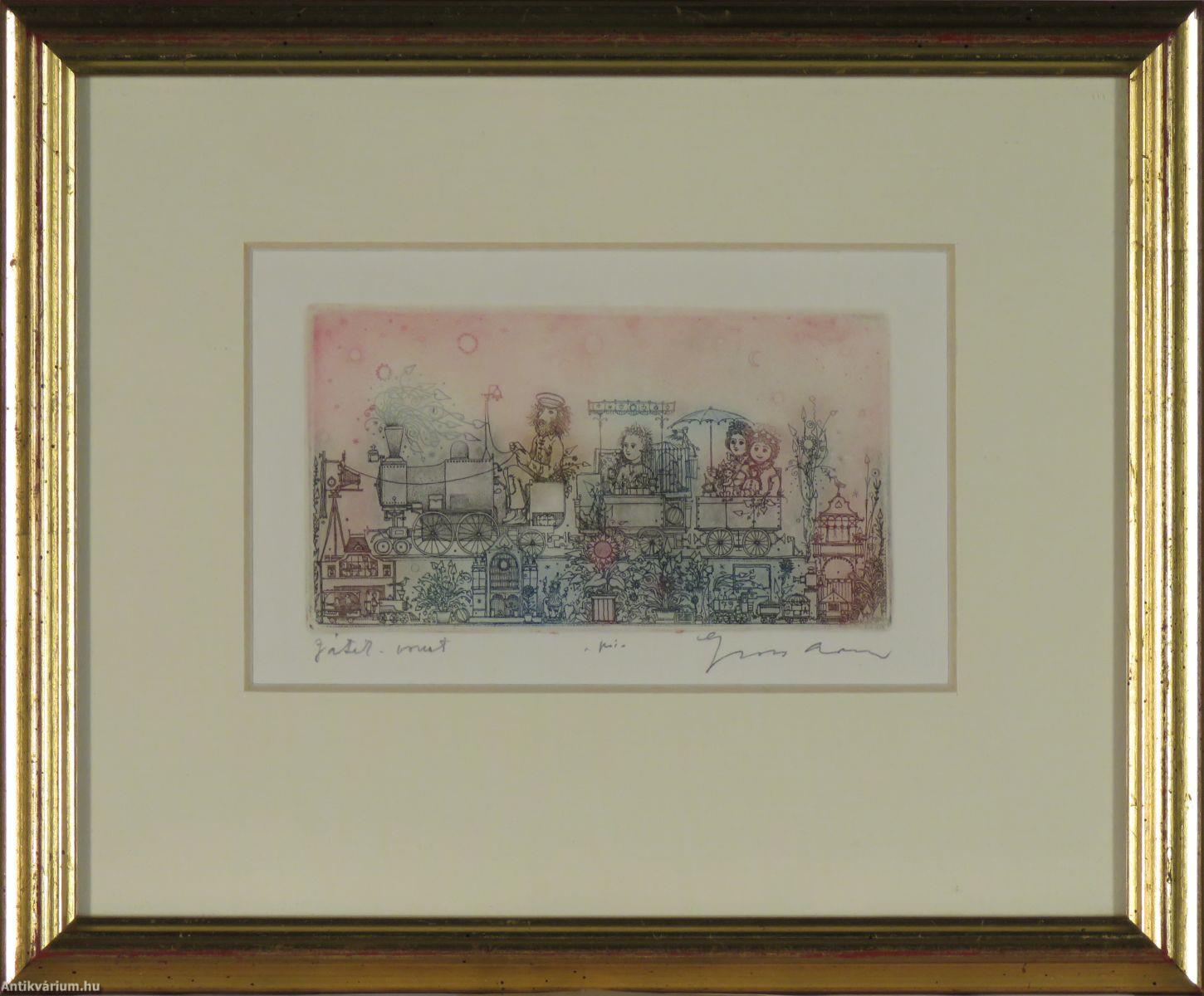 Jelzés balra lent: Játék-vonat, középen lent: grafika, jobbra lent: Gross Arnold, színes rézkarc, papír.