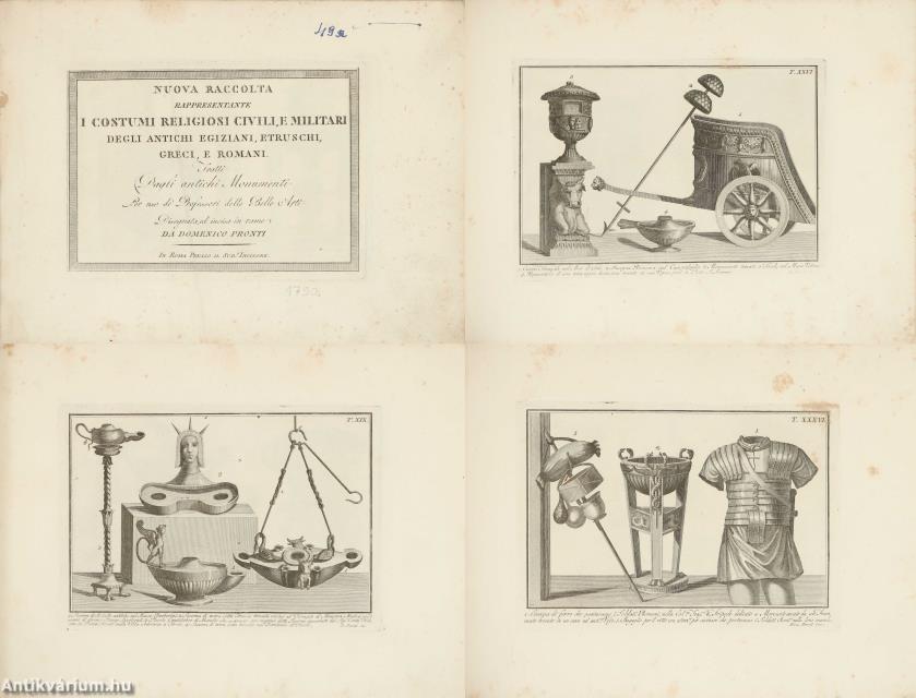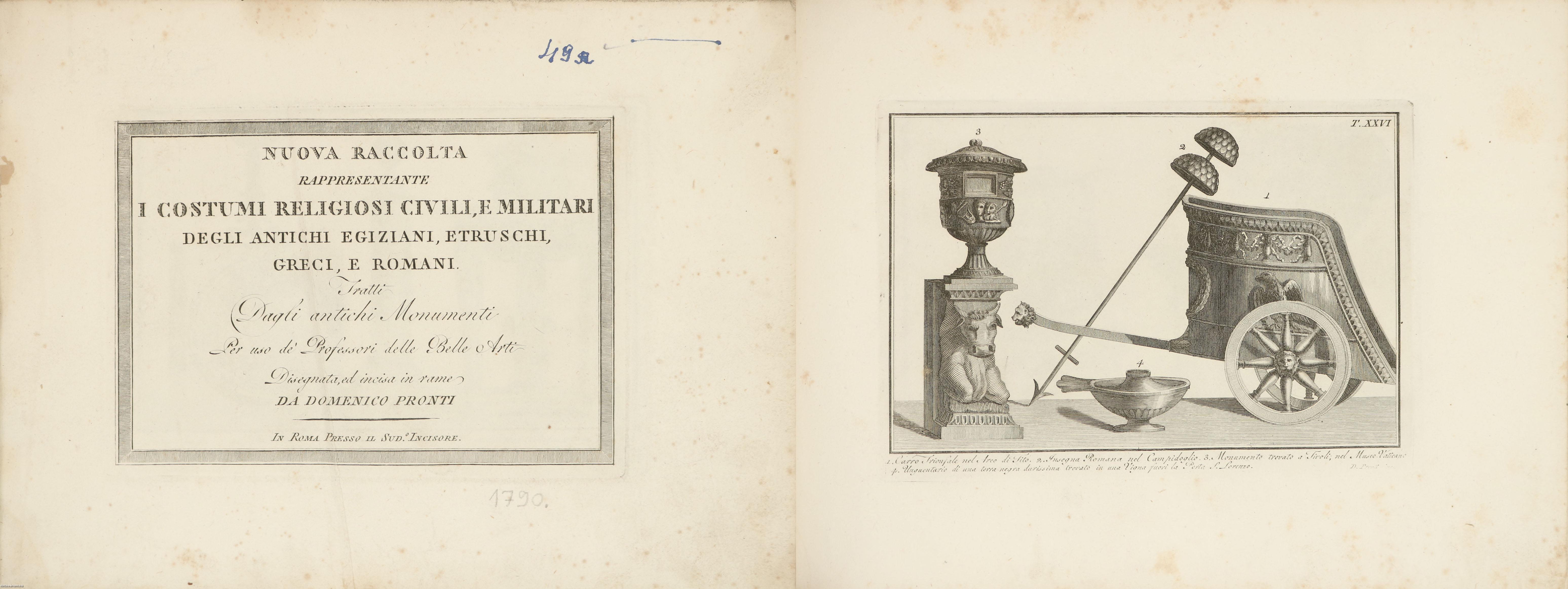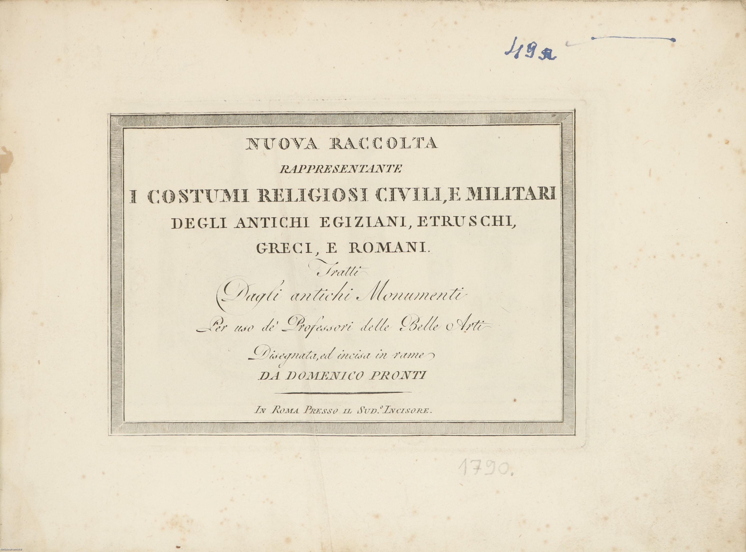 Nuova raccolta rappresentante i costumi religiosi civili, e militari degli antichi Egiziani, Etruschi, Greci, e Romani. ... Disegnata, ed incisa in rame da Domenico Pronti. [Új gyűjtemény, mely az ókori egyiptomiak, etruszkok, görögök és rómaiak vallási, polgári és katonai szokásaihoz kapcsolódó dolgokat hivatott bemutatni. ... Rajzolta és rézbe metszette Domenico Pronti.] A kötet kiadási éve [cca. 1800 körül.]