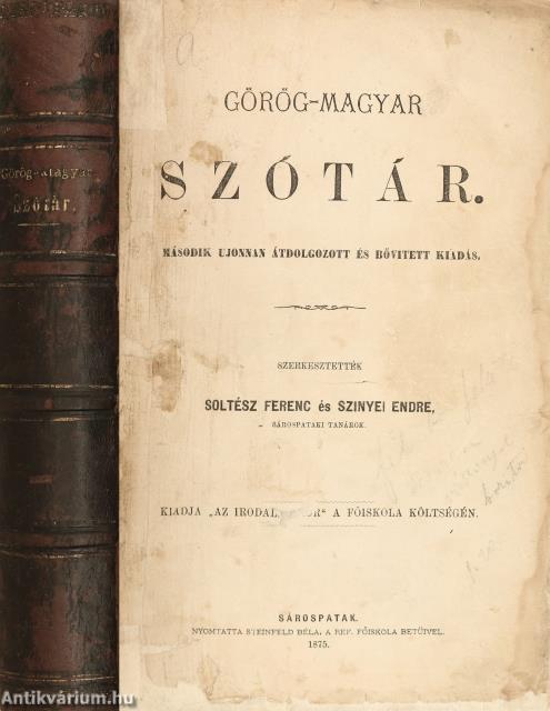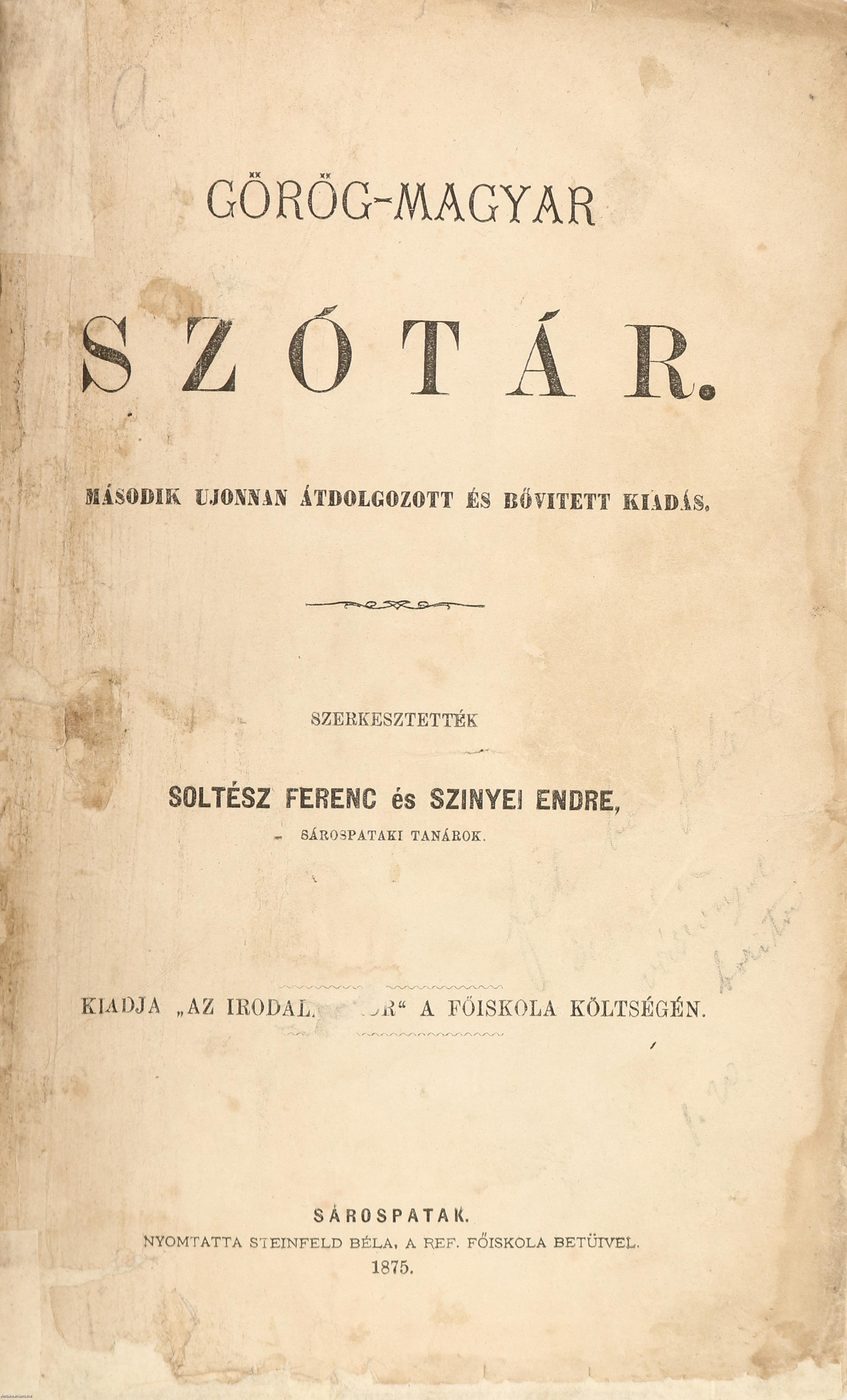 Görög-magyar szótár. Szerkesztették: Soltész Ferenc és Szinyei Endre sárospataki tanárok.