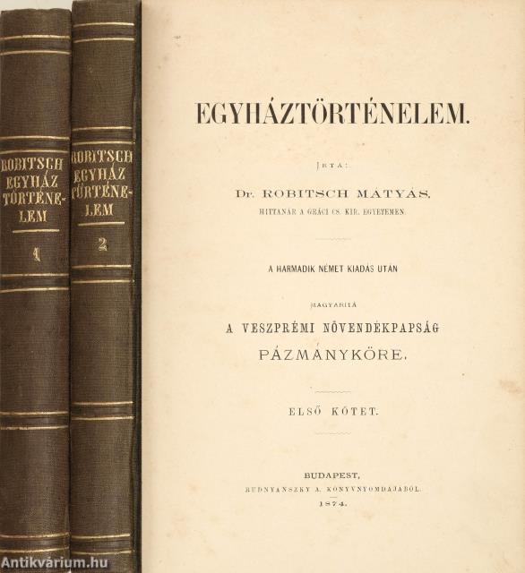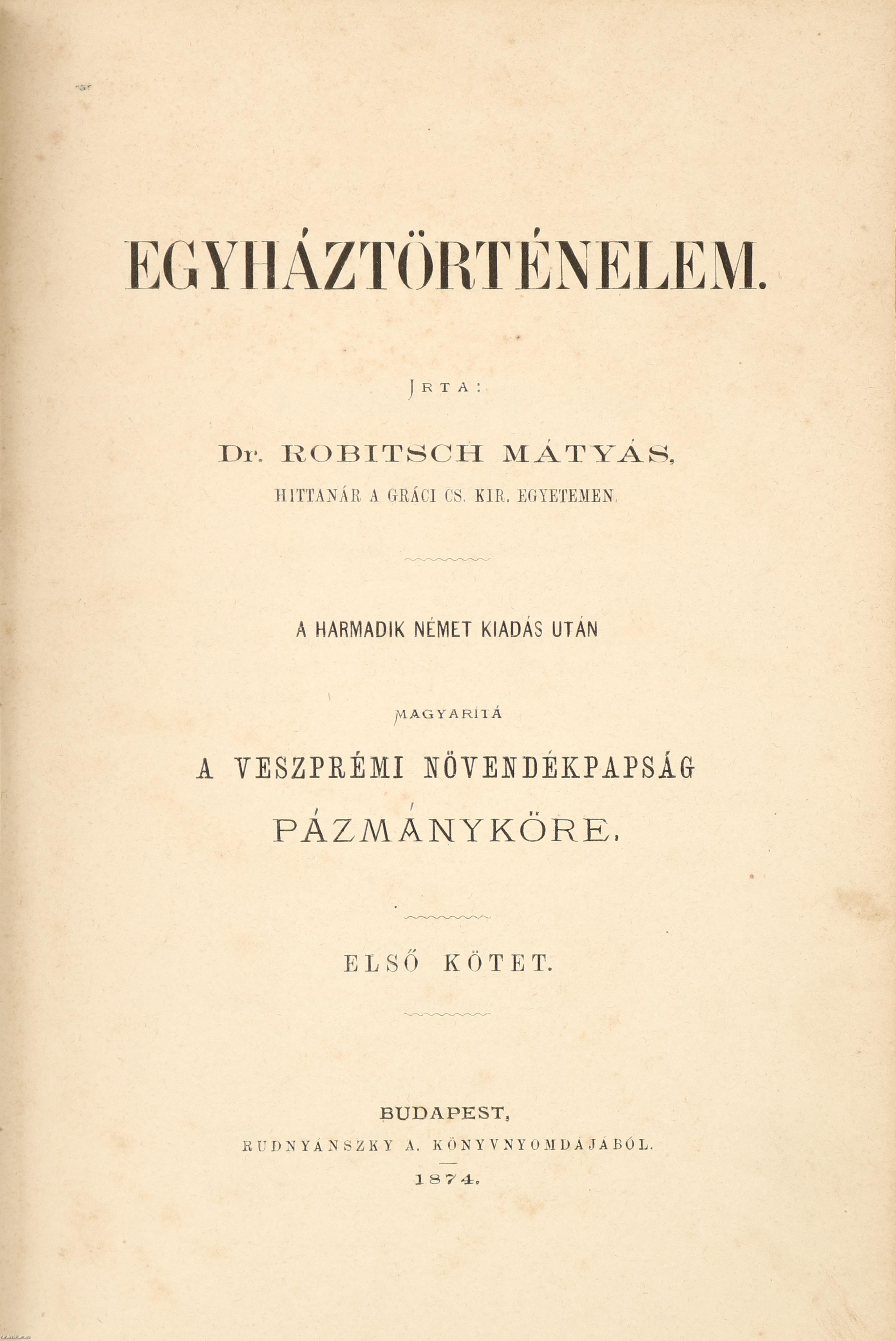 Munkálatok. Kilencedik és tizedik folyam. Kiadja a Veszprémi Növendékpapság Pázmányköre. Első magyar nyelvű kiadás. Egyháztörténelem I-II. (egységes külön kötetekben) Írta: Dr. Robitsch Mátyás. A harmadik német kiadás után magyarítá a Veszprémi Növendékpapság Pázmányköre.