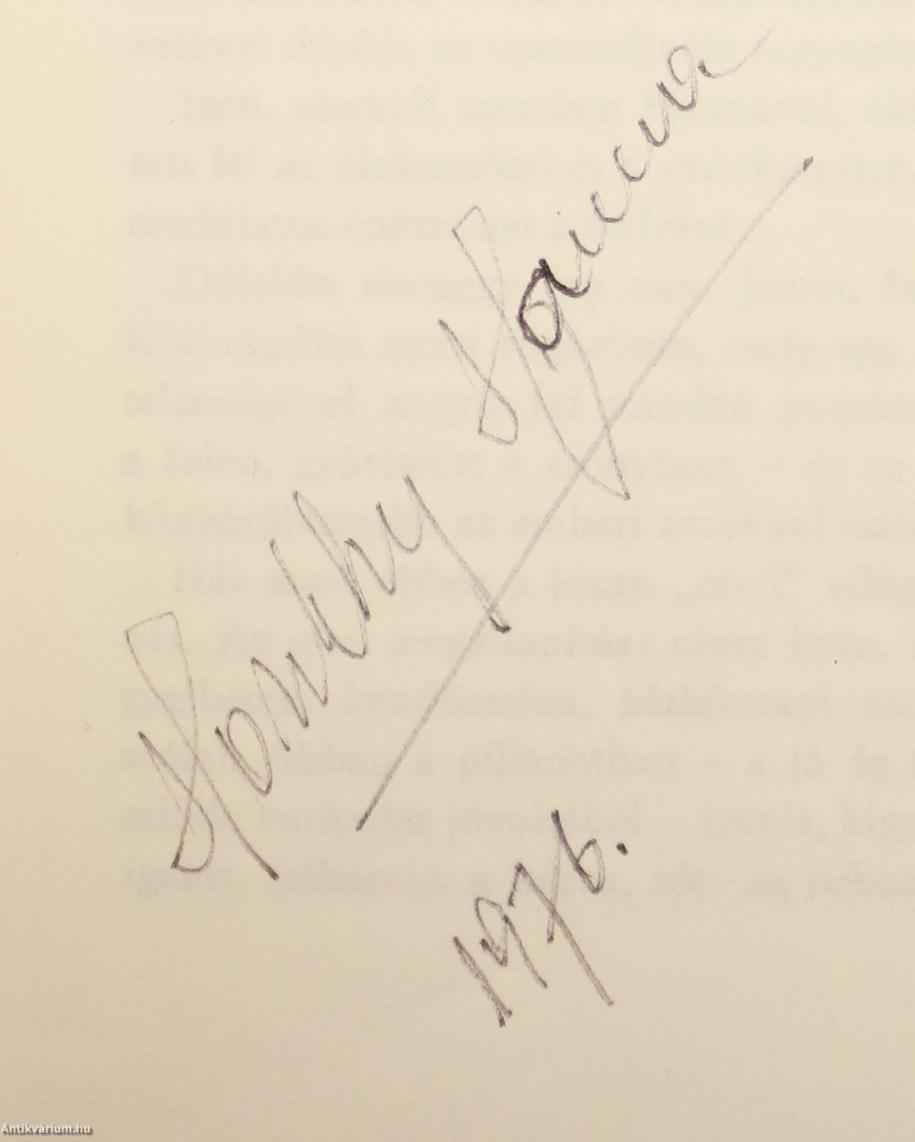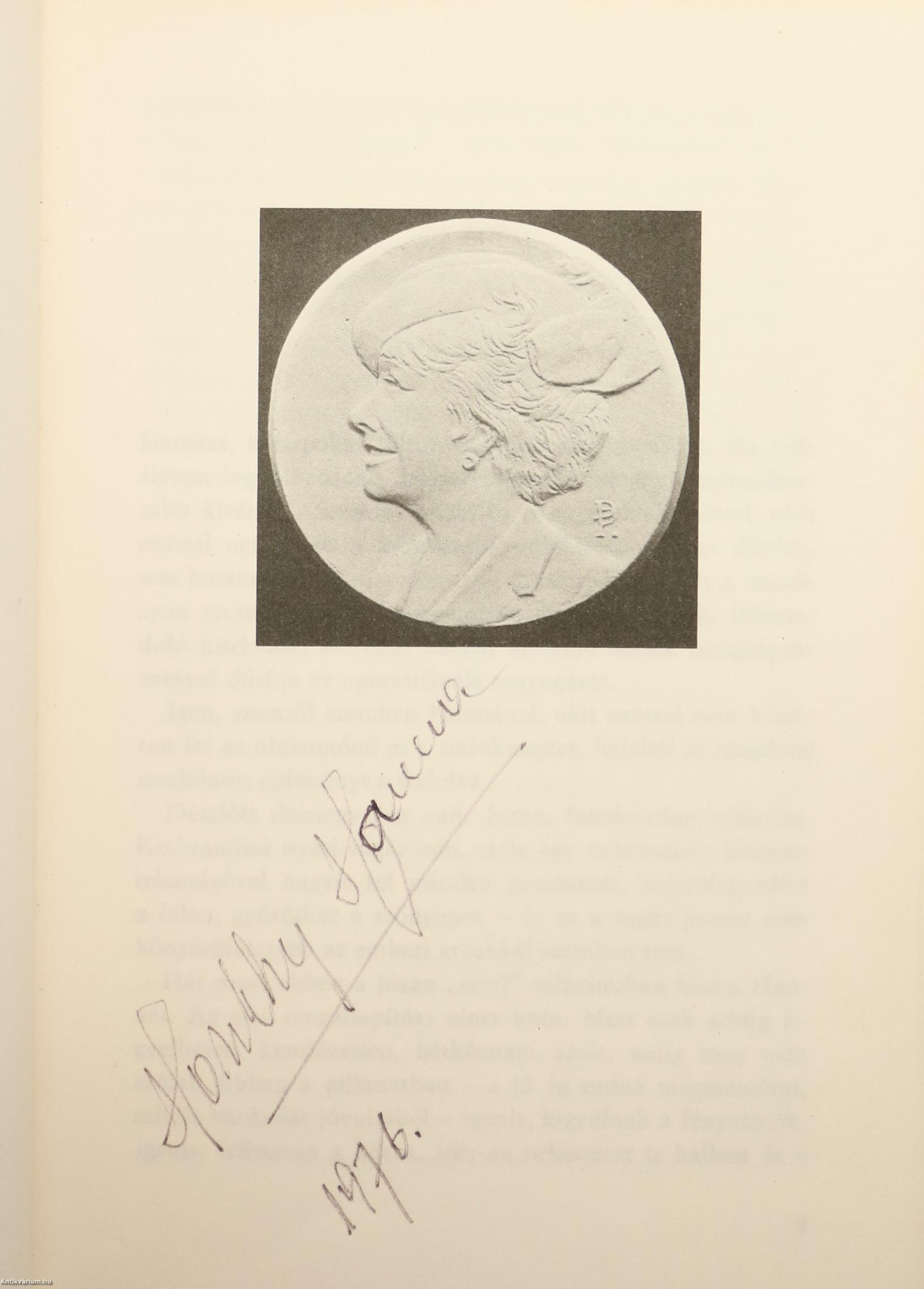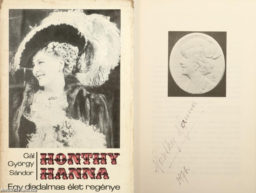 Honthy Hanna színművésznő által aláírt példány.Első kiadás. Honthy Hanna, egy diadalmas élet regénye. Írta: Gál György Sándor. A címlapot követő oldalon a művésznőt ábrázoló plakett fotója alatt Honthy Hanna színésznő tollal beírt aláírása látható. Szövegközti, fekete-fehér, feliratozott fotókkal illusztrált, valamint a szerző bevezetőjével és részletes tartalomjegyzékkel kiegészített kötet. Nyomtatta az Alföldi Nyomda Debrecenben. Kiadói egészvászon kötésben lévő példány kopott aranyozott feliratozású címfedéllel, aranyozott feliratos, elszíneződött könyvgerinccel, hiánytalan állapotban, feliratos, a művésznő fekete-fehér fotójával ellátott, fülszöveges, elszíneződött, kiadói borítófedélben (rajta apróbb sérülésekkel). A kötetet aláírta, Honthy Hanna (Budapest, 1893. február 21. – Budapest, 1978. december 30.) színművésznő, operettprimadonna. 1916-tól a főváros különböző színházaiban – Vígszínház, Revü Színház, Blaha Lujza Színház, Király Színház, Belvárosi Színház – kapott szerződést. 1922-ben A bajadér című Kálmán Imre-operett Király színházi előadásán mérte össze tudását, tehetségét a kor ünnepelt, nála 14 évvel idősebb primadonnájával, Fedák Sárival. Neve ettől kezdve vált igazán ismertté Budapesten. 1925–27-ben és 1949-től a Fővárosi Operettszínház tagja volt, bár csak egyes szerepekre szerződött. A második világháború után Gáspár Margit szerződtette a Fővárosi Operettszínházhoz a már jóval 50-en túli primadonnát, ahol ugyanolyan nagy sikereket aratott, mint fiatal korában.
