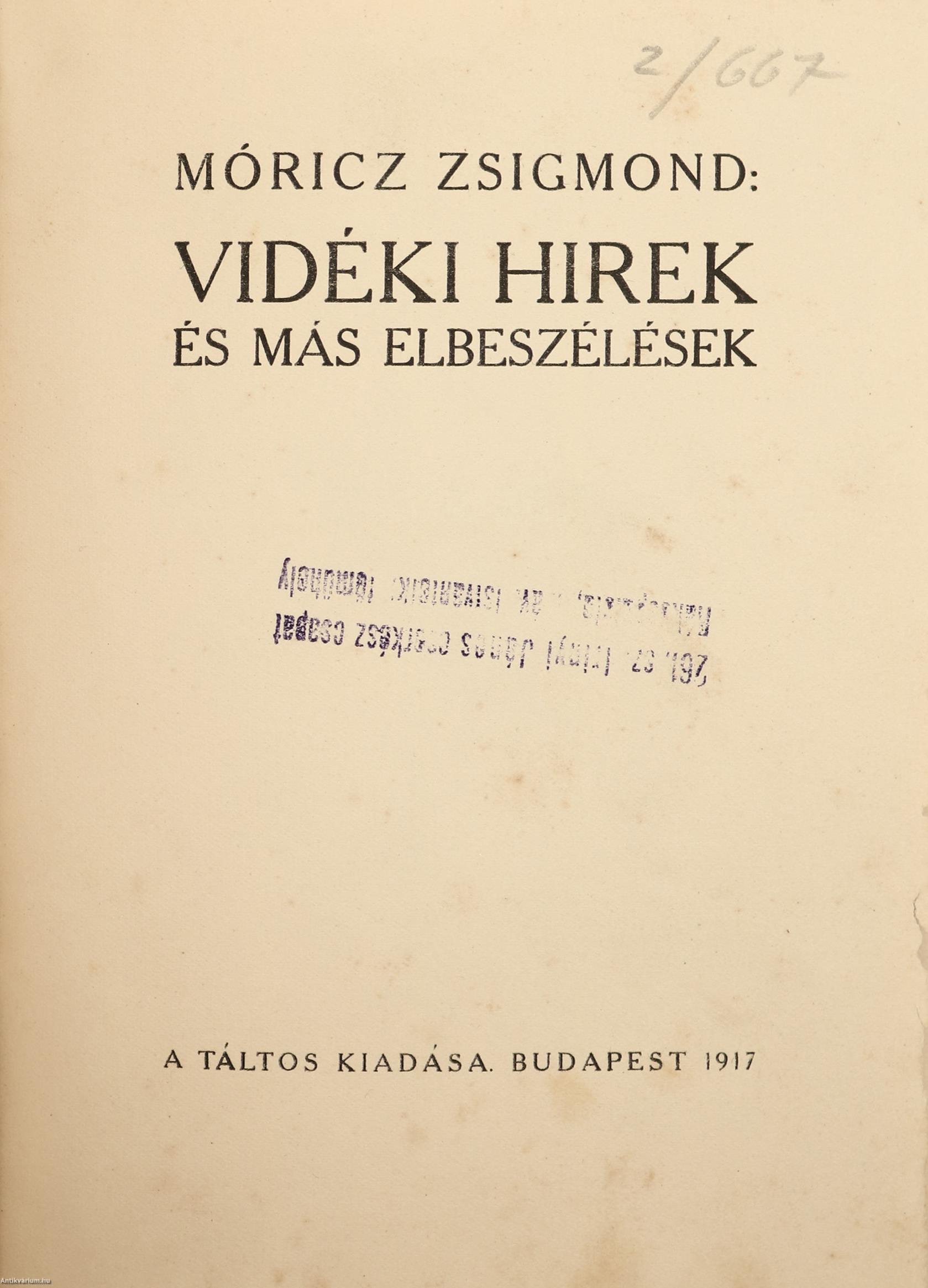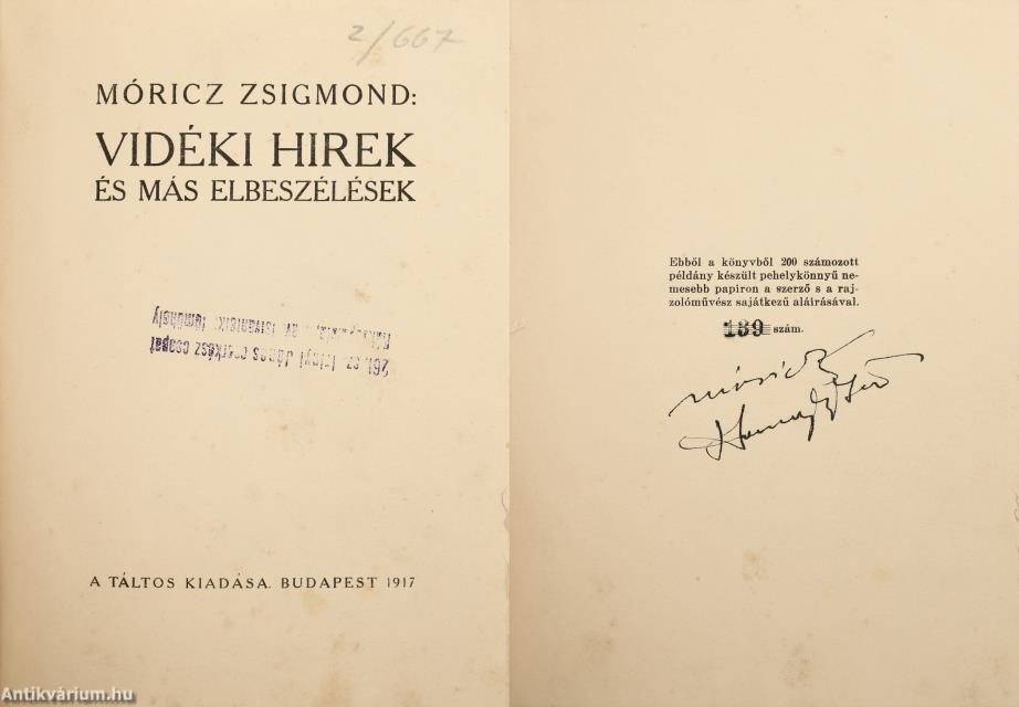 A szerző és a grafikus által aláírt példány. Első, számozott, bibliofil kiadás. Vidéki hírek és más elbeszélések. Írta: Móricz Zsigmond.