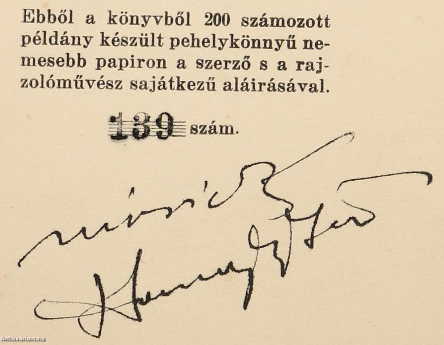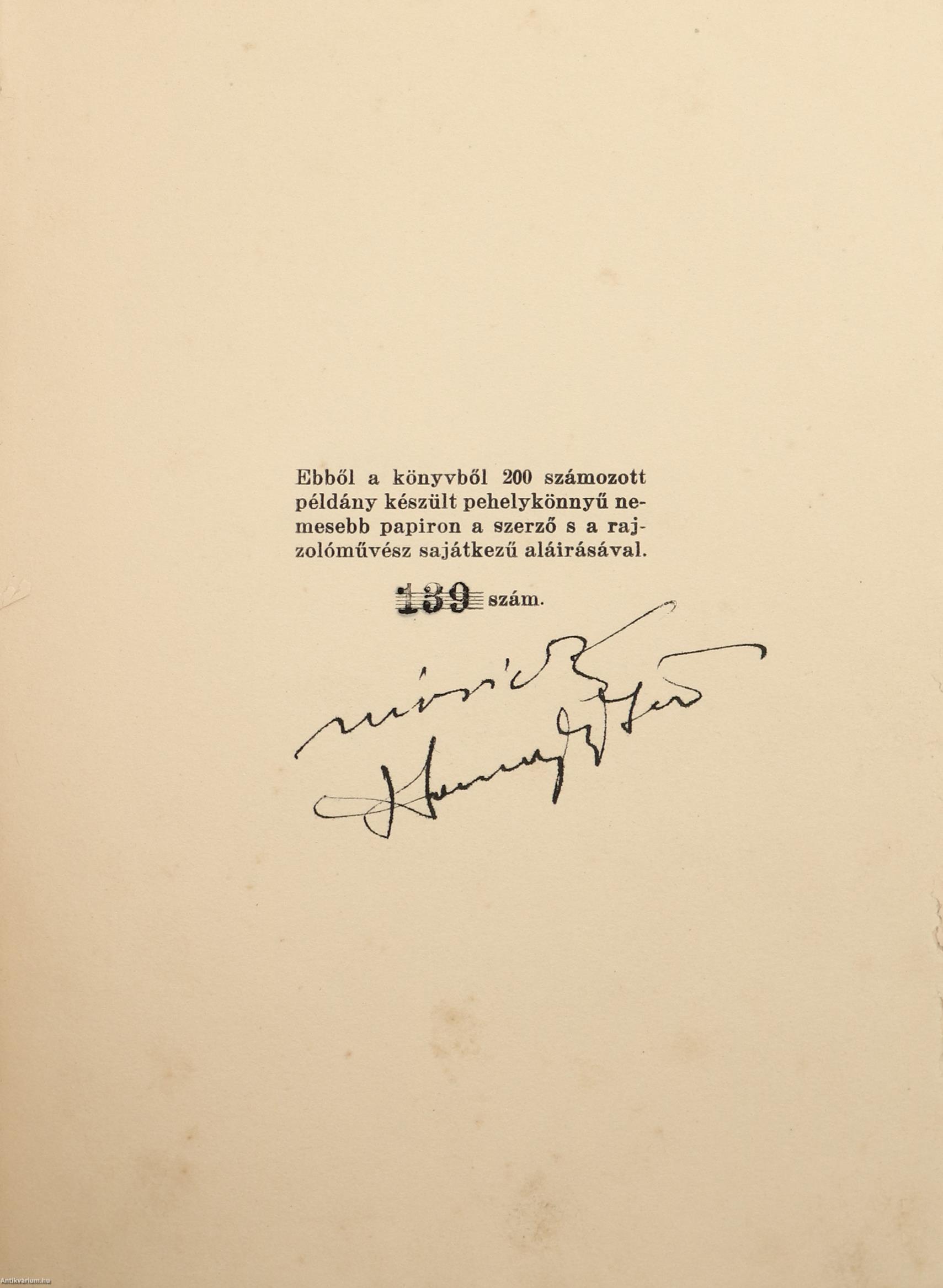 "Ebből a könyvből 200 számozott példány készült pehelykönnyű nemesebb papiron a szerző s a rajzolóművész sajátkezű aláirásával". Ez a 139. számú példány.