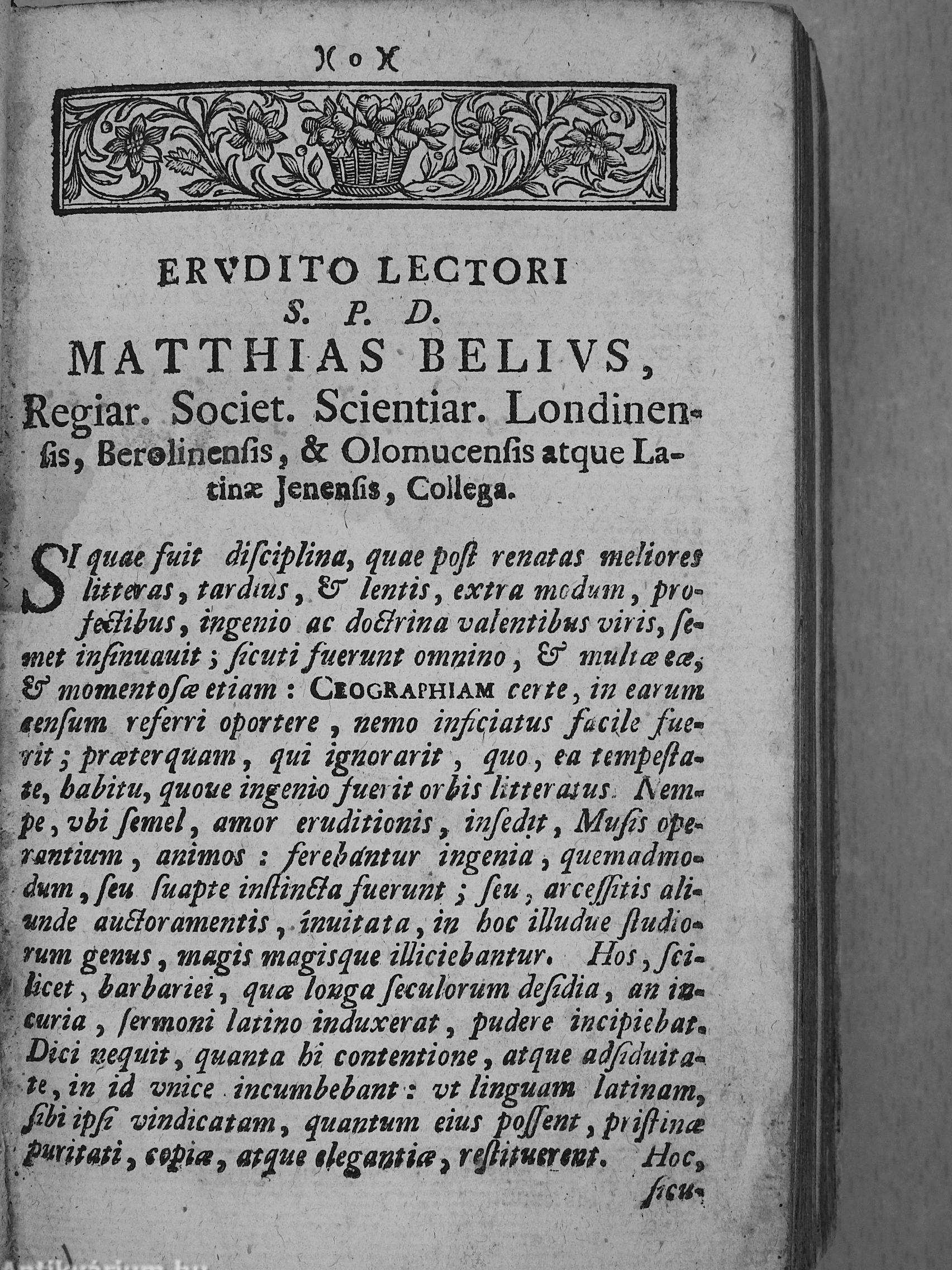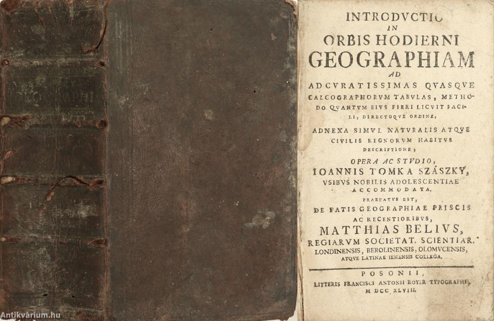Első kiadás. Introdvctio in orbis hodierni geographiam ... adnexa simvl natvralis atqve civilis regnorum habitvs descriptione, opera ac studio, Ioannis Tomka Szászky ... praefatus est ... Matthias Belivs. / Bevezetés a mai világ földrajzába ... az egyes országok természeti és polgári viszonyainak leírásával. Tomka Szászky János munkája Bél Mátyás előszavával.