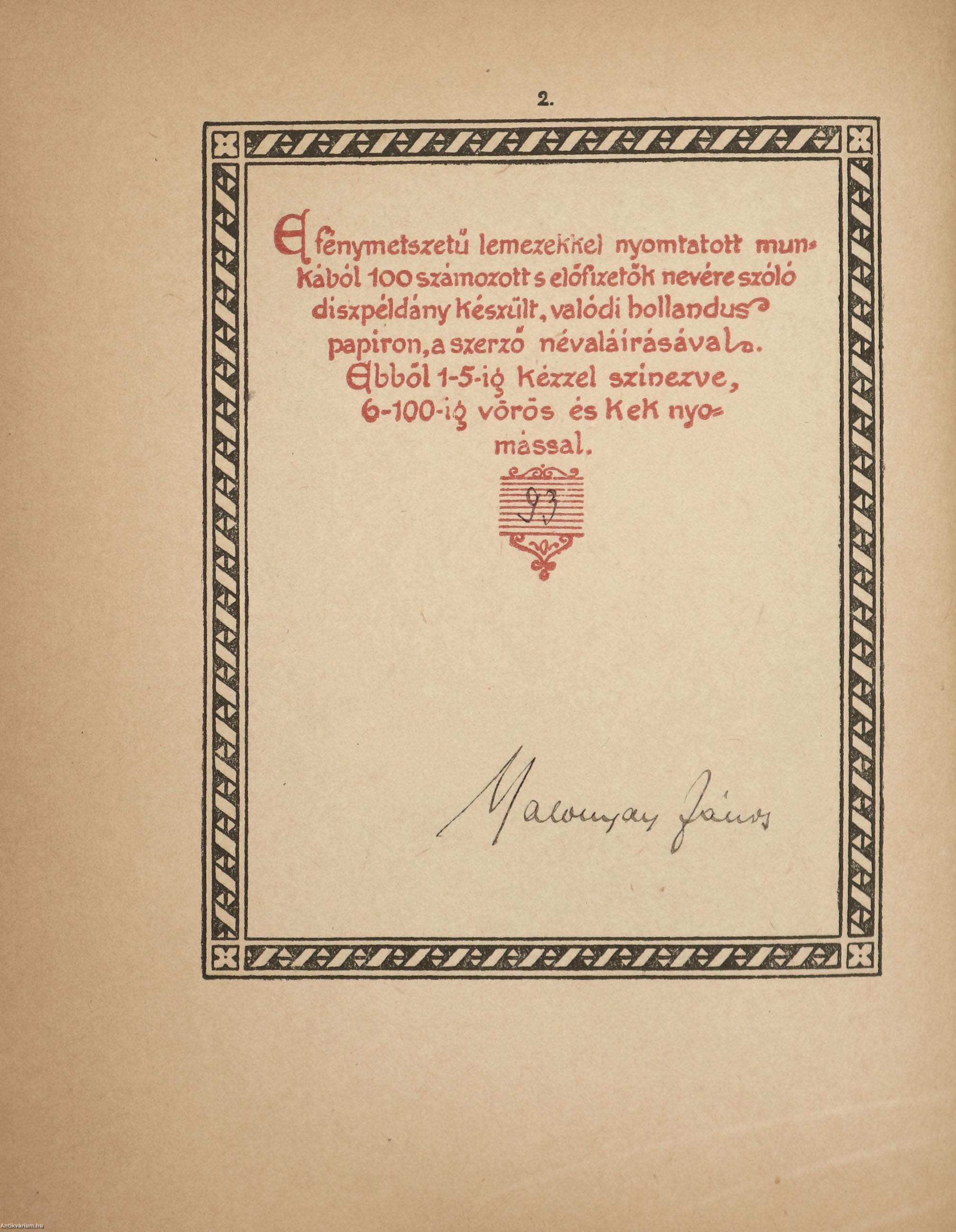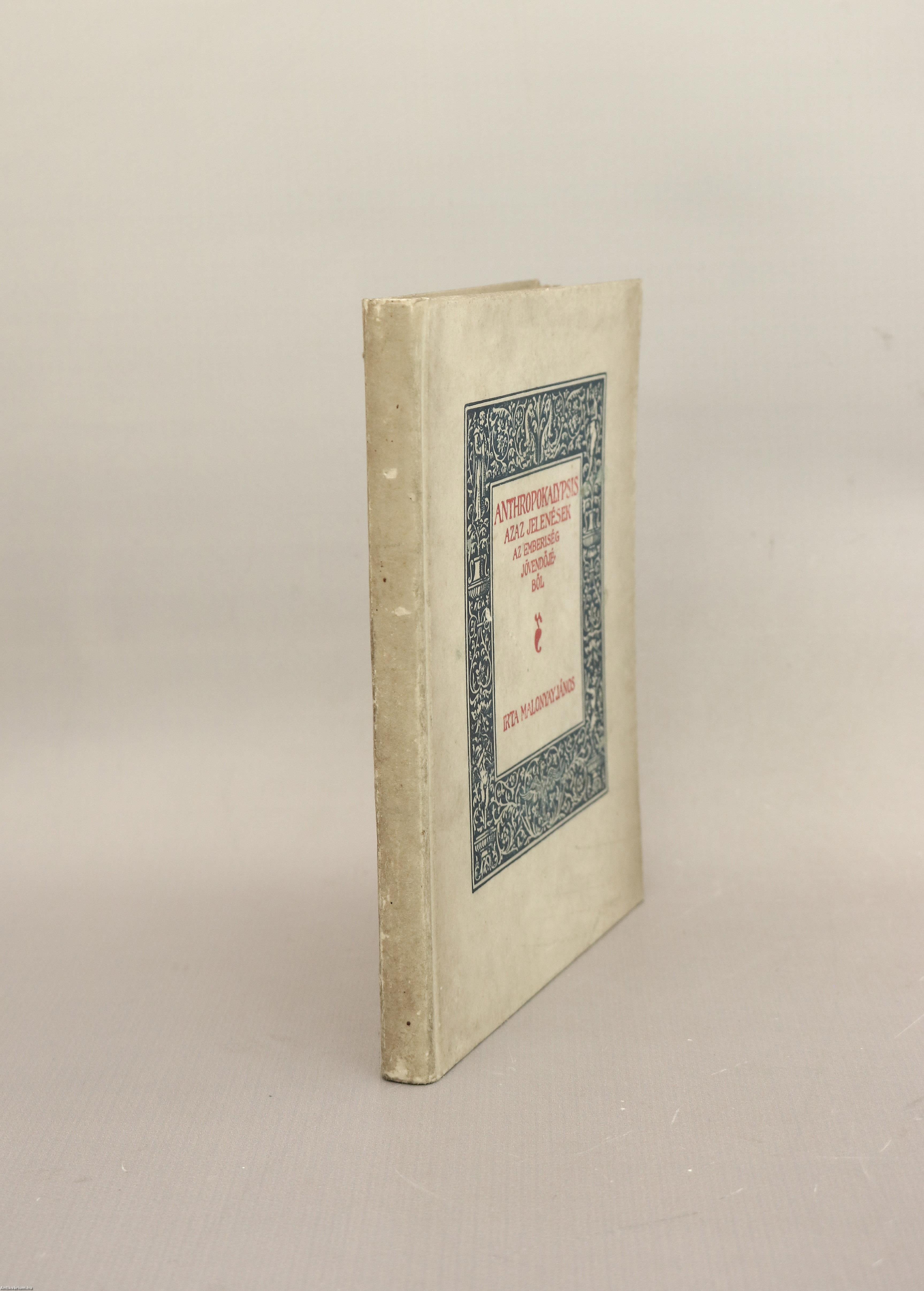 Szerző által aláírt példány. Első, számozott, bibliofil kiadás. Anthropokalypsis azaz jelenések az emberiség jövendőjéből. Írta: Malonyai János. A címlap hátoldalán a számozás alatt a szerző, Malonyai János tollal írt, jól olvasható aláírása látható. "E fénymetszetű lemezekkel nyomtatott munkából 100 számozott s előfizetők nevére szóló díszpéldány készült, valódi hollandus papíron a szerző névaláírásával. Ebből 1–5-ig kézzel színezve, 6–100-ig vörös és kék nyomással."Ez a 93. sz. példány. Leírta és díszítette Akantisz Victor. Fekete-fehér és piros könyvdíszekkel, nagy iniciálékkal illusztrált kötet. A fedlap belső oldalán névvel ellátott Ex-libris bélyegzés található. Nyomtatta Röder C. G. nyomdája Lipcsében. Kiadói papír pergamenkötésben lévő példány, piros feliratos, díszkeretes címfedéllel, feliratozatlan könyvgerinccel, aranyozott felső lapélekkel, körbevágatlan belívekkel, feliratozatlan, foltos hátlappal, hiánytalan állapotban. "Az Anthropokalypsis mély bölcsességei az élet útvesztőiben bolyongó ember számára nagy segítséggel vannak." - írja a kötetről Mollináry Gizella (1896-1978) írónő.