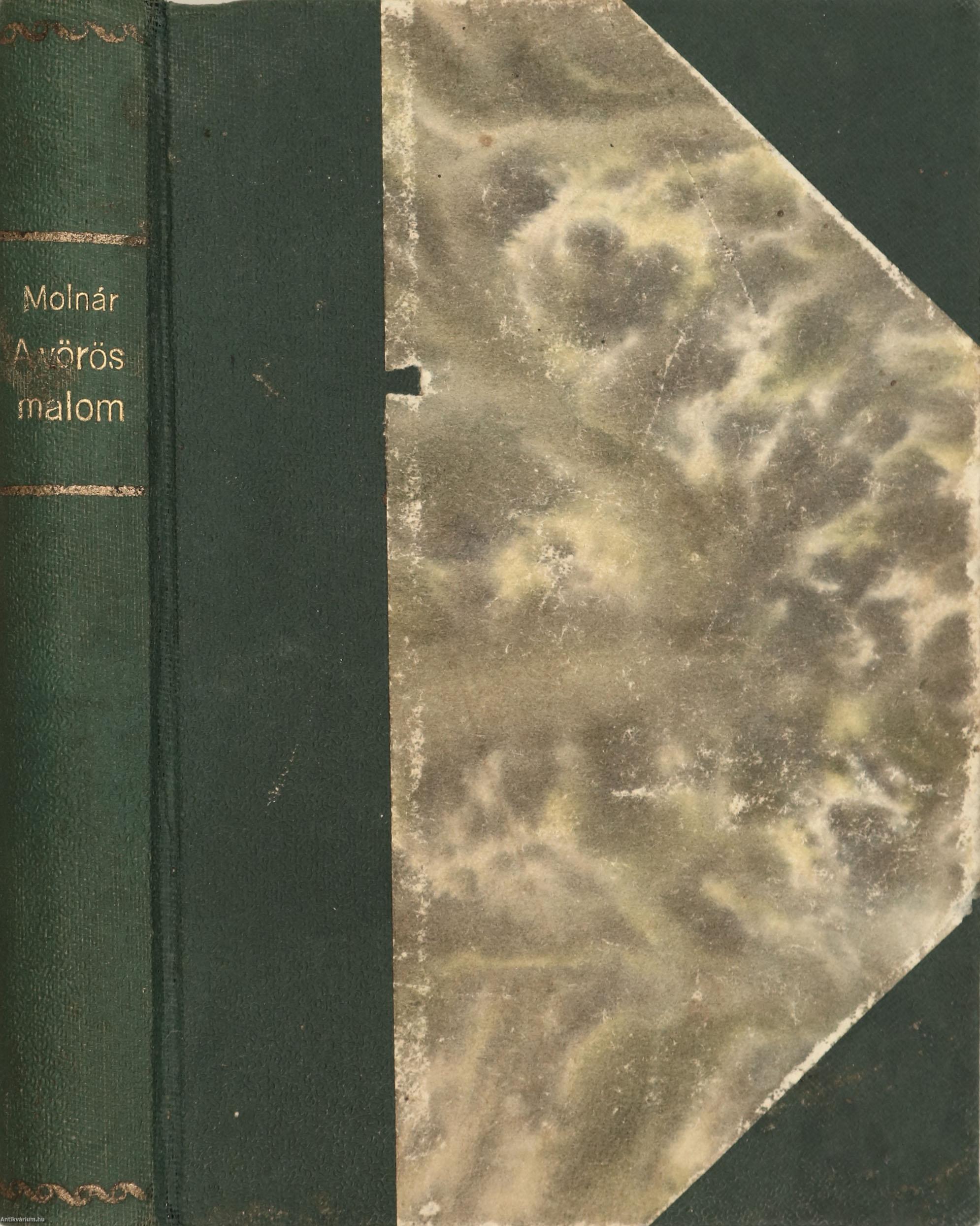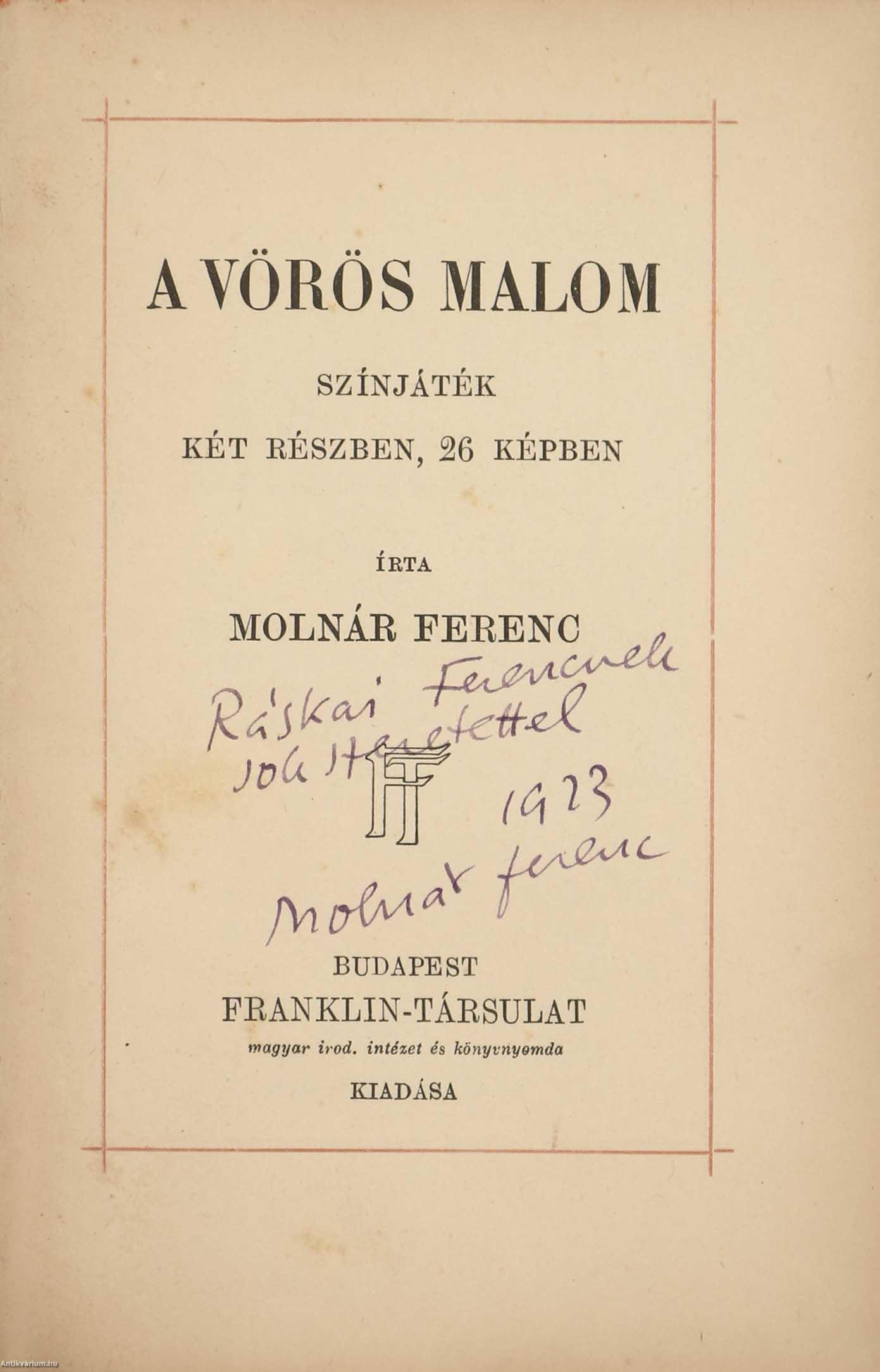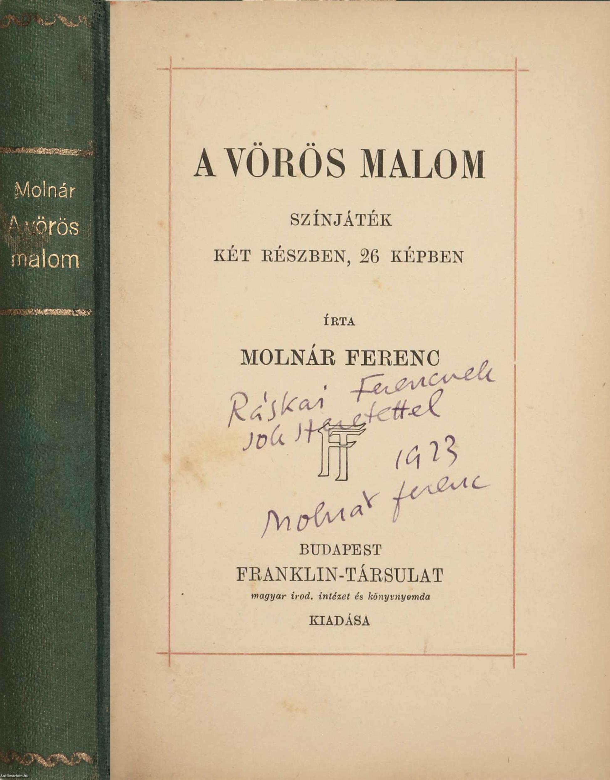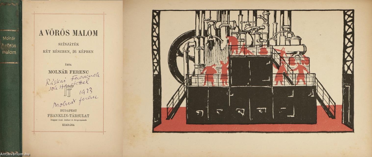 Szerző által dedikált példány. Első kiadás. A vörös malom. Színjáték két részben, 26 képben. Írta: Molnár Ferenc. A címlapon a szerző, Molnár Ferenc tollal írt, névre szóló dedikációja olvasható: "Ráskai Ferencnek sok szeretettel. 1923. Molnár Ferenc". A dedikáció címzettje, Ráskai Ferenc (Komárom, 1880. november 23. – Budapest, 1942. október 29.) író, újságíró, színpadi szerző. Kezdetben a Magyar Közélet című hetilap segédszerkesztője, utána a Pesti Hírlap munkatársa, majd színházi rovatvezetője volt. 1904-től a Magyar Mesemondó c. képes gyermeklap szerkesztőjeként dolgozott. Számos színművet írt. Szövegközti, egy színnel színezett rajzzal illusztrált, valamint a szerző színműveinek és műveinek jegyzékével kiegészített kötet. Nyomtatta a Franklin-Társulat Nyomdája. Könyvkötői félvászon kötésben lévő példány feliratozatlan, mintázott címfedéllel és hátlappal, aranyozott feliratozású könyvgerinccel, néhány foltos, megerősített lappal, színezett felső lapélekkel, hiánytalan állapotban. A kötet szerzője, Molnár Ferenc (született Neumann) Budapest, 1878. január 12.– New York, 1952. április 1.) író, újságíró. A magyar polgári dráma virágkorában alkotott, legnagyobb hazai vetélytársa Herczeg Ferenc volt. Külföldön Molnár olyan sikereket aratott, amelyről magyar író álmodni sem mert. Senkit sem utánzott, a kezdetektől birtokában van a színpadi hatáskeltésnek. Nagyon jó szemű író, gyönyörűségét a formai tökély, a cselekmény biztonságos gördülékenysége adja. Képes volt egy semmitmondó anekdotából is mindvégig lebilincselő három felvonásost kreálni. A módos polgár mulattatójaként bírálta az úri világot, a polgári fejlődésben elmaradt Magyarországon. Ugyanakkor érzékenyen ábrázolta a pesti kisemberek életét.