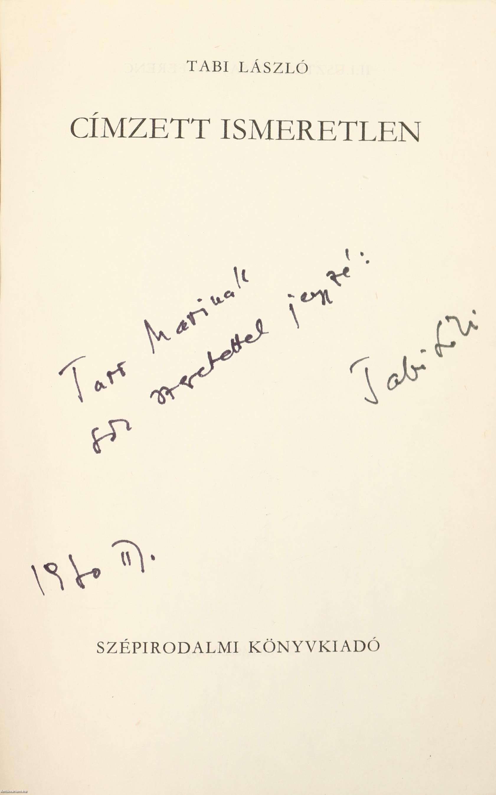 Tabi László: Címzett ismeretlen (Tarr Marinak dedikált példány) (A borító-, kötésterv és az illusztrációk Sajdik Ferenc munkája)