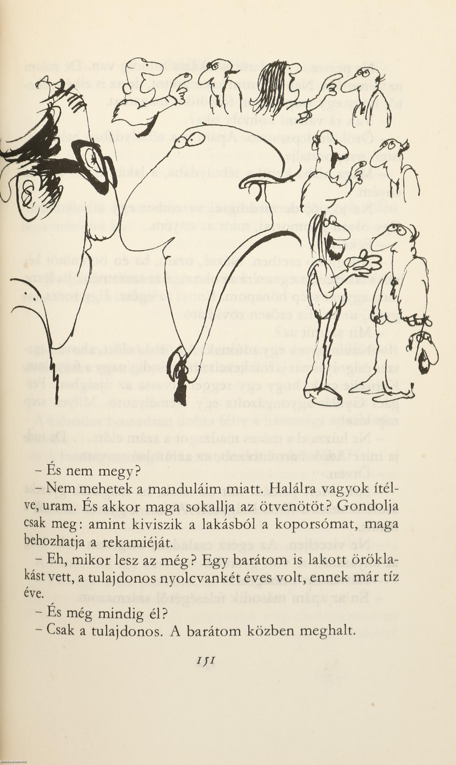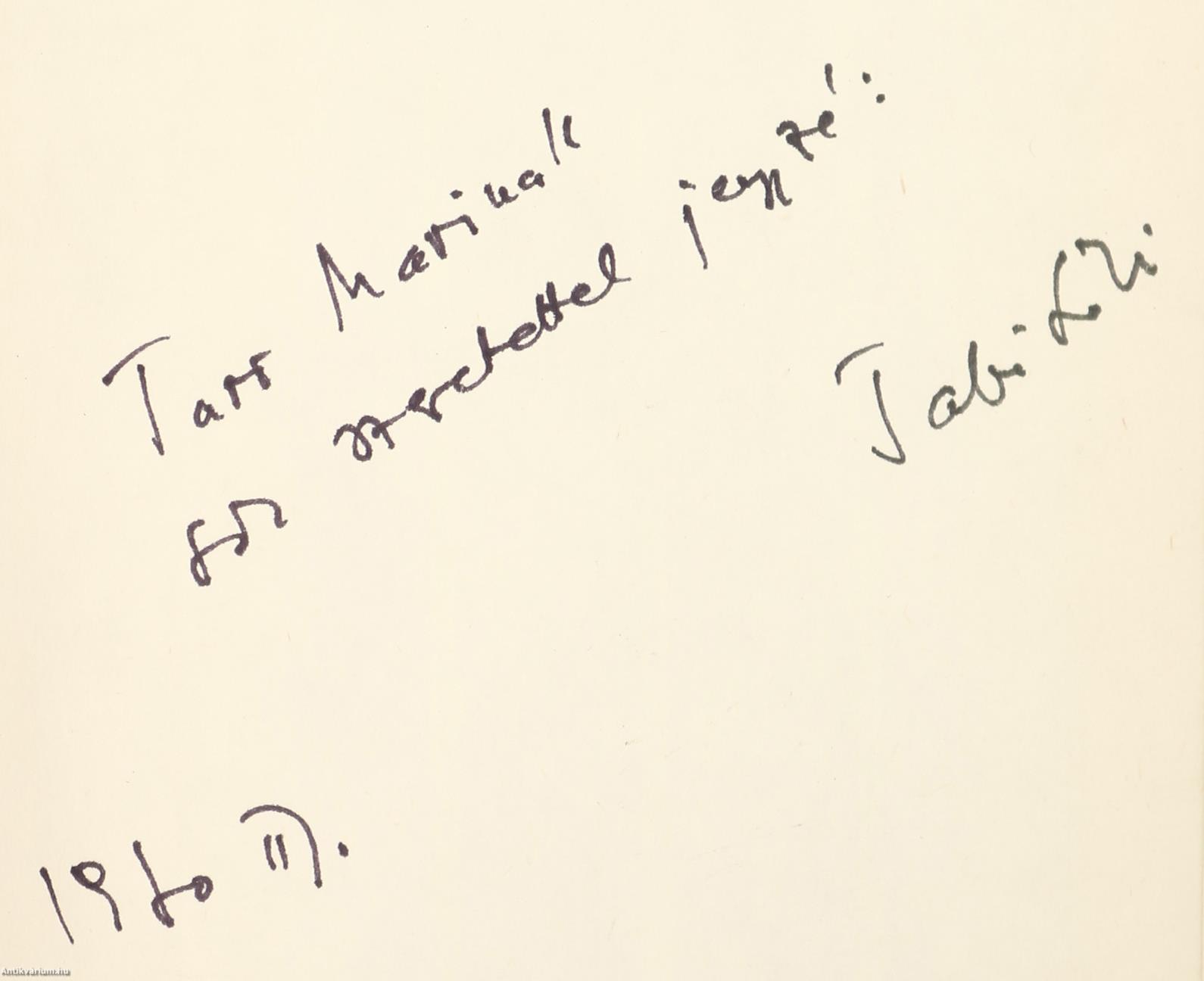 Szerző által dedikált példány. Első kiadás. Címzett ismeretlen. Írta: Tabi László. A címlapon a szerző, Tabi László tollal beírt, névre szóló dedikációja olvasható: "Tarr Marinak sok szeretettel jegyzé: Tabi Laci. 1980. II." A dedikáció címzettje, Tarr Mária, a Magyar Köztársaság Ezüst Érdemkereszt kitüntetettje, akit a legismertebb színházi súgóként tartottak számon. Tarr Mária 55 éven át dolgozott a Madách Színházban. Nagy sikereket ért el Mesék a súgólyukból című estjével, melynek keretén belül megismertette a nézőket a súgó mesterséggel, valamint a kulisszák világával és szereplőivel. Sajdik Ferenc szövegközti, fekete-fehér rajzaival illusztrált, valamint tartalomjegyzékkel kiegészített kötet. A szerző fényképét Koffán Károly készítette. A borító- és kötésterv Sajdik Ferenc munkája. Nyomtatta az Alföldi Nyomda, Debrecenben. Kiadói egészvászon kötésben lévő példány feliratozatlan, illusztrációval ellátott címfedéllel, feliratos könyvgerinccel, kiadói előzéklapokkal, hiánytalan, jó állapotban, feliratozott, illusztrációval és a szerző portréjával ellátott, fülszöveges, kiadói borítófedélben. A szerző, Tabi László /szül. Taub László/ (Budapest, 1910. október 7. – Budapest, 1989. április 28.) kétszeres József Attila-díjas író, újságíró, szerkesztő, publicista, humorista. 1932-től a "Nemzeti Sport" rejtvényrovatának vezetője, majd a "Magyar Rejtvény Újság" munkatársa volt. Részben saját nevén, részben különböző álneveken szórakoztató kisregényeket írt. Később a "Ludas Matyi" vicclap szerkesztőjeként, majd főszerkesztőjeként tevékenykedett. Íróként, humoristaként és újságíróként is a szellemes, árnyalt humort tartotta magáénak. Humoristaként (mert önmagát mindig humoristának tartotta) örök mottójának vallotta, hogy „Nincsenek régi viccek, csak öreg emberek vannak. Egy újszülöttnek minden vicc új”.