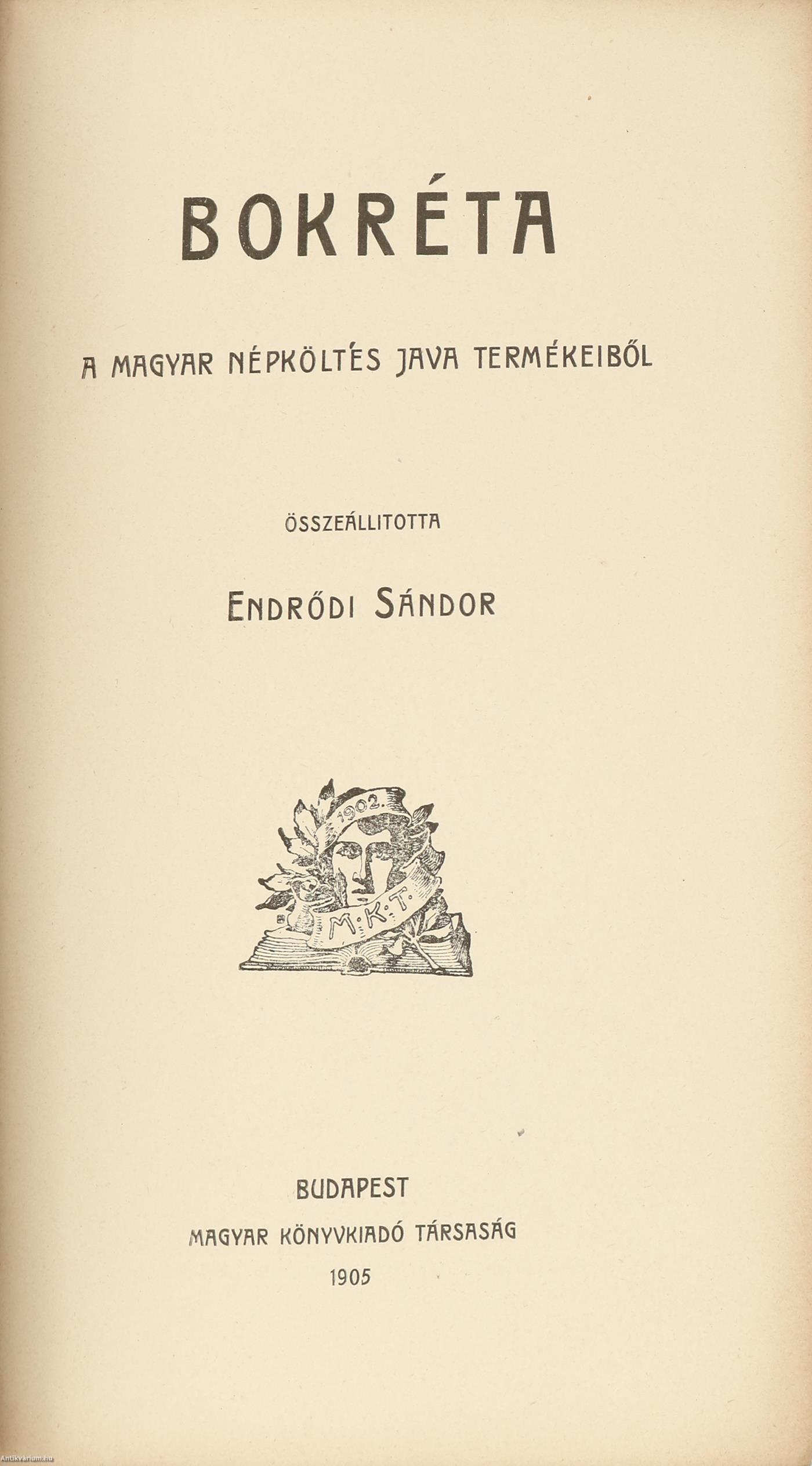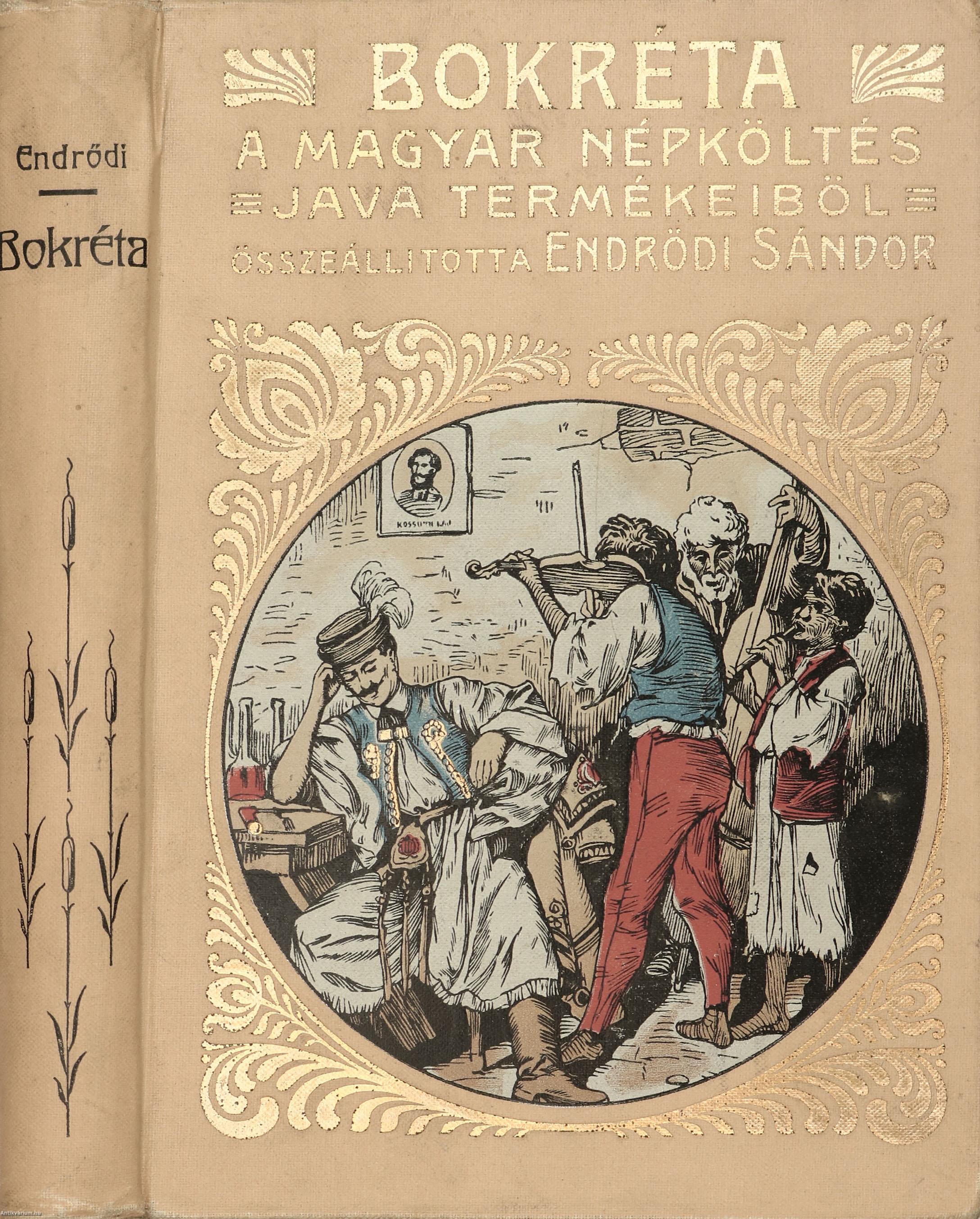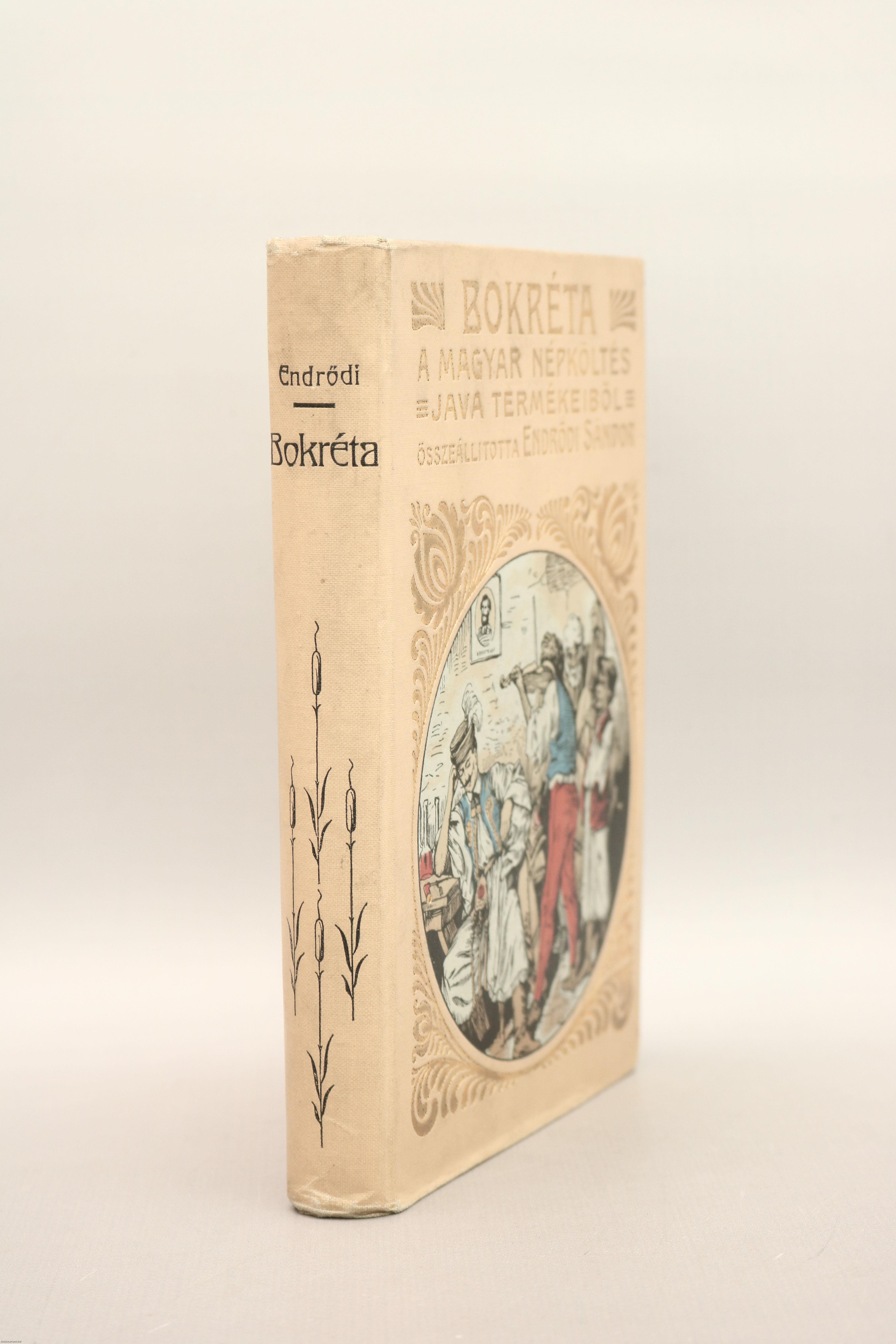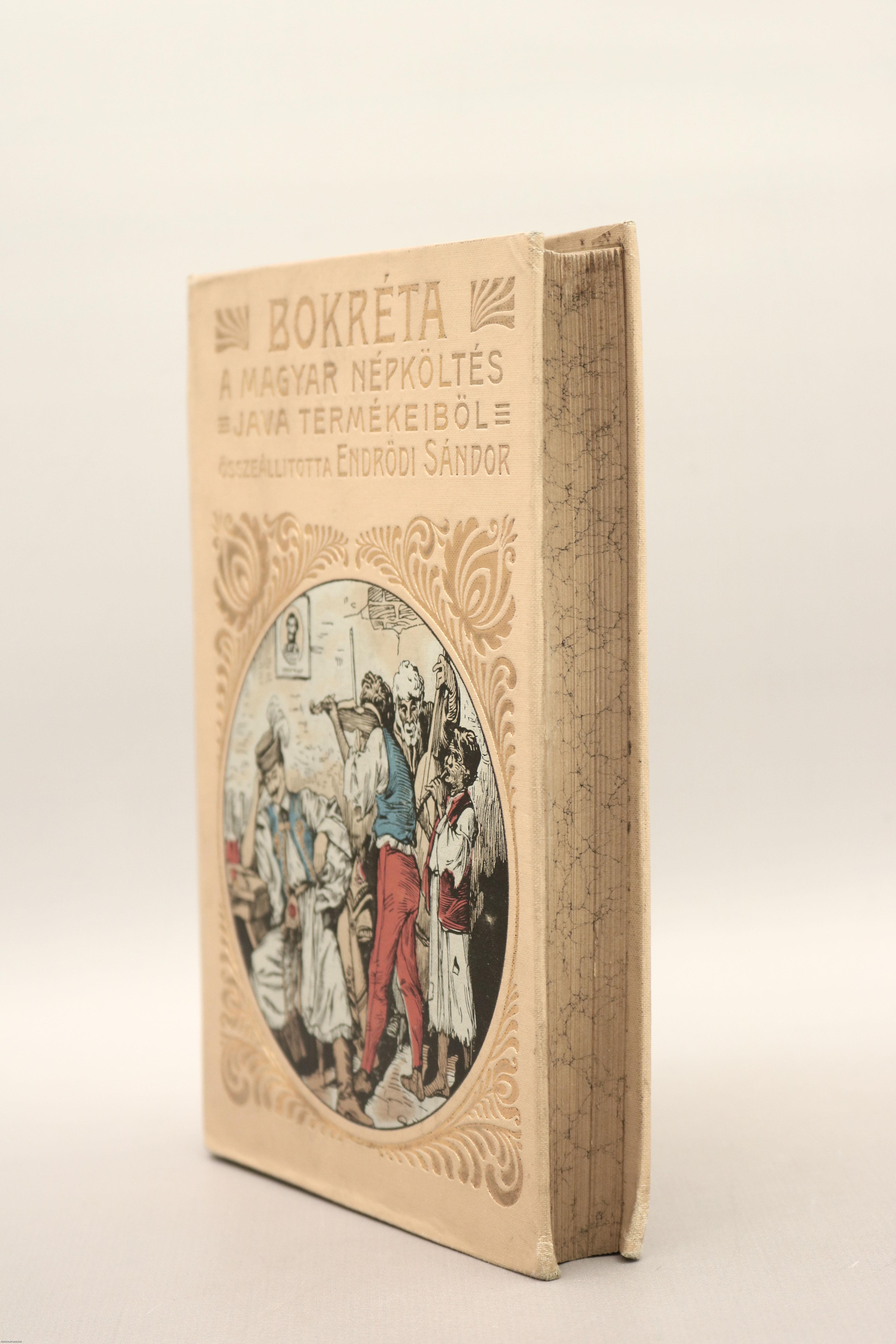 Bokréta. A magyar népköltés java termékeiből. Összeállította: Endrődi Sándor. Előszóval, a dalok betűrendes mutatójával és részletes tartalomjegyzékkel kiegészített kötet. A könyvet a Révai és Salamon Könyvnyomdája nyomtatta és Dörner és Heimberg Könyvkötészete kötötte Budapesten. Kiadói egészvászon kötésben lévő példány aranyozott feliratozású, aranyozott díszítéssel és színes illusztrációval ellátott címfedéllel, feliratos, díszes könyvgerinccel, mintás előzéklapokkal, mintázott lapélekkel, az illusztrációval ellátott hátlapon a kötészet feltüntetésével, hiánytalan állapotban. A kötetet összeállította, Endrődi Sándor (Veszprém, 1850. január 16. – Budapest, 1920. november 7.) költő, író, a Magyar Tudományos Akadémiai levelező tagja. Tanulmányait Nagyszombaton, Veszprémben, Kecskeméten és a székesfehérvári katolikus gimnáziumban végezte. Az önképzőkörben, melynek elnöke akkor Wekerle Sándor volt, már kitűnt költői tehetségével. Pozsonyban és Pesten színészettel próbálkozott, majd Pápán leérettségizett. Ezt követően Berlinben és Lipcsében esztétikai és irodalmi előadásokat hallgatott. Visszatérve Budapestre előbb a jogra, később a bölcsészetre iratkozott be. Miután első verse megjelent a Nefelejtsben (1868), csakhamar a Fővárosi Lapok, a Hazánk, a Külföld, a Magyarország, a Nagyvilág, a Figyelő, az Athenaeum és az Otthon is közölte az írásait. A Csávolszky-féle Baloldal és a Fővárosi Lapok belső munkatársaként is működött.