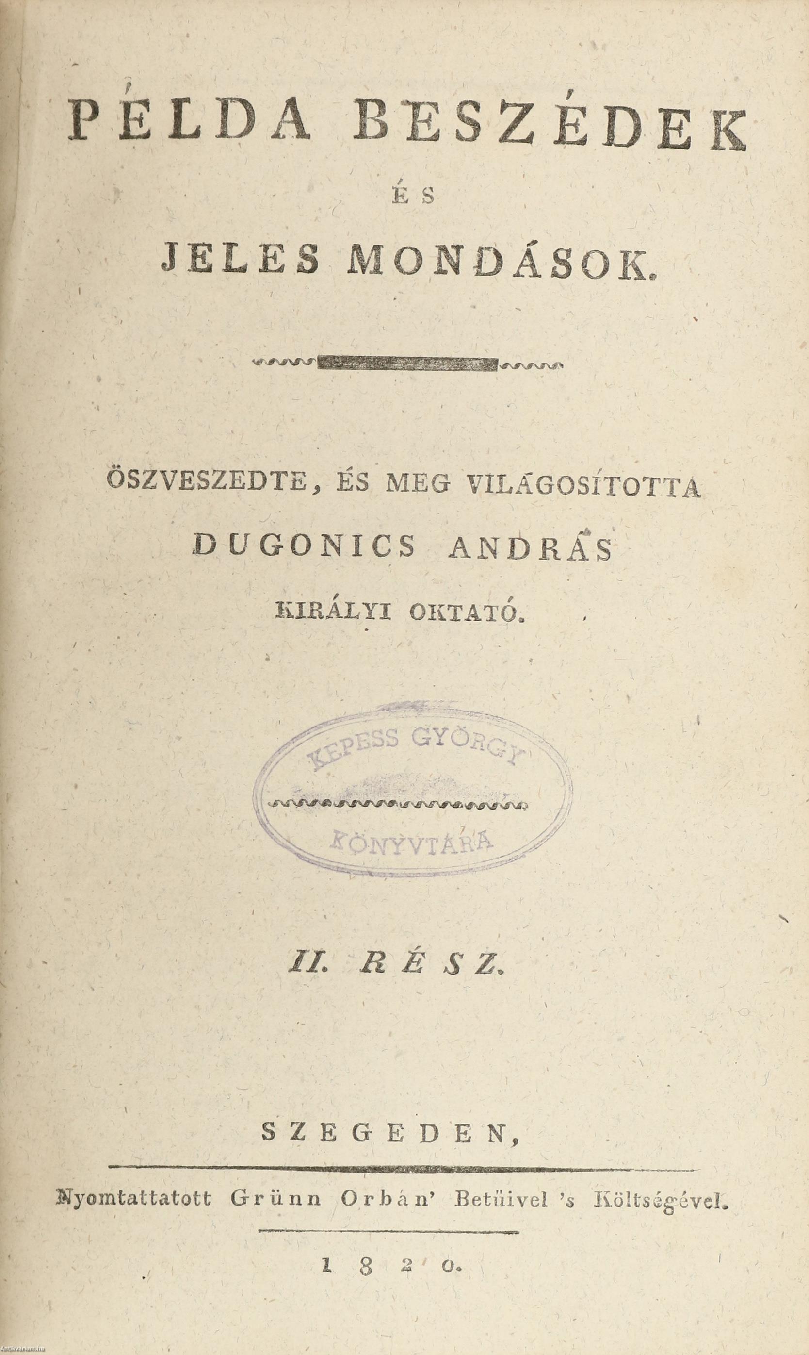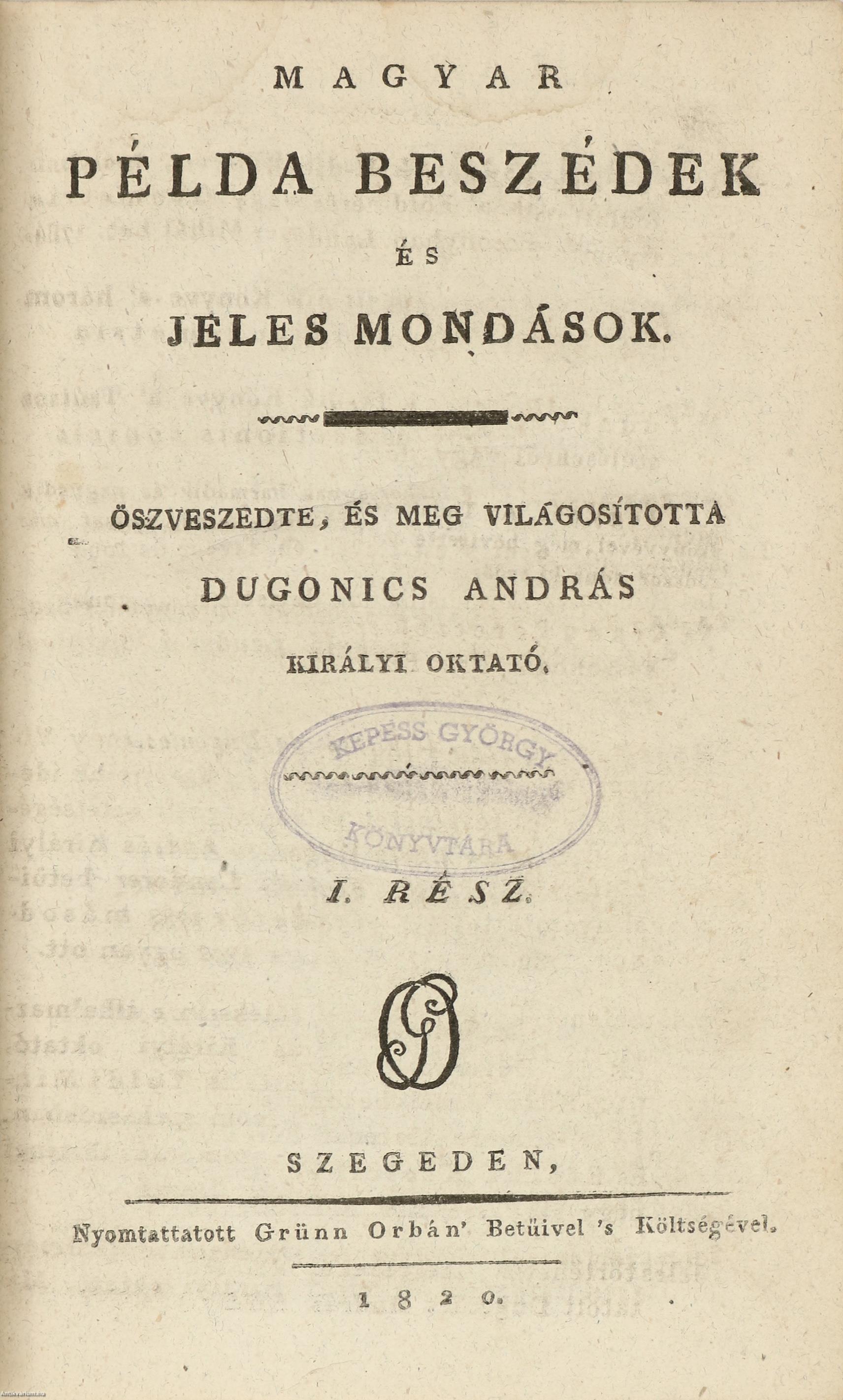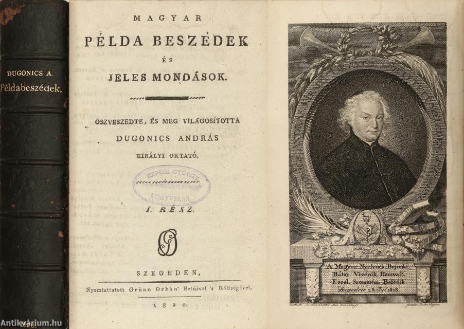 Számos munkáibul boldogúlt Dugonics András Úrnak írásban maradt és közel negyven esztendő le folyása alatt, különös szorgalommal öszve szedett MAGYAR PÉLDA BESZÉDEIT, 'S JELES MONDÁSAIT sajtó alá botsátván Szegedi Könyvnyomtató Grünn Orbán Úr, azzal akarta e' munkának betsét nevelni, hogy egyszer'smind a' tudós Szerzőnek életét némely észre vételekkel közre botsátaná.