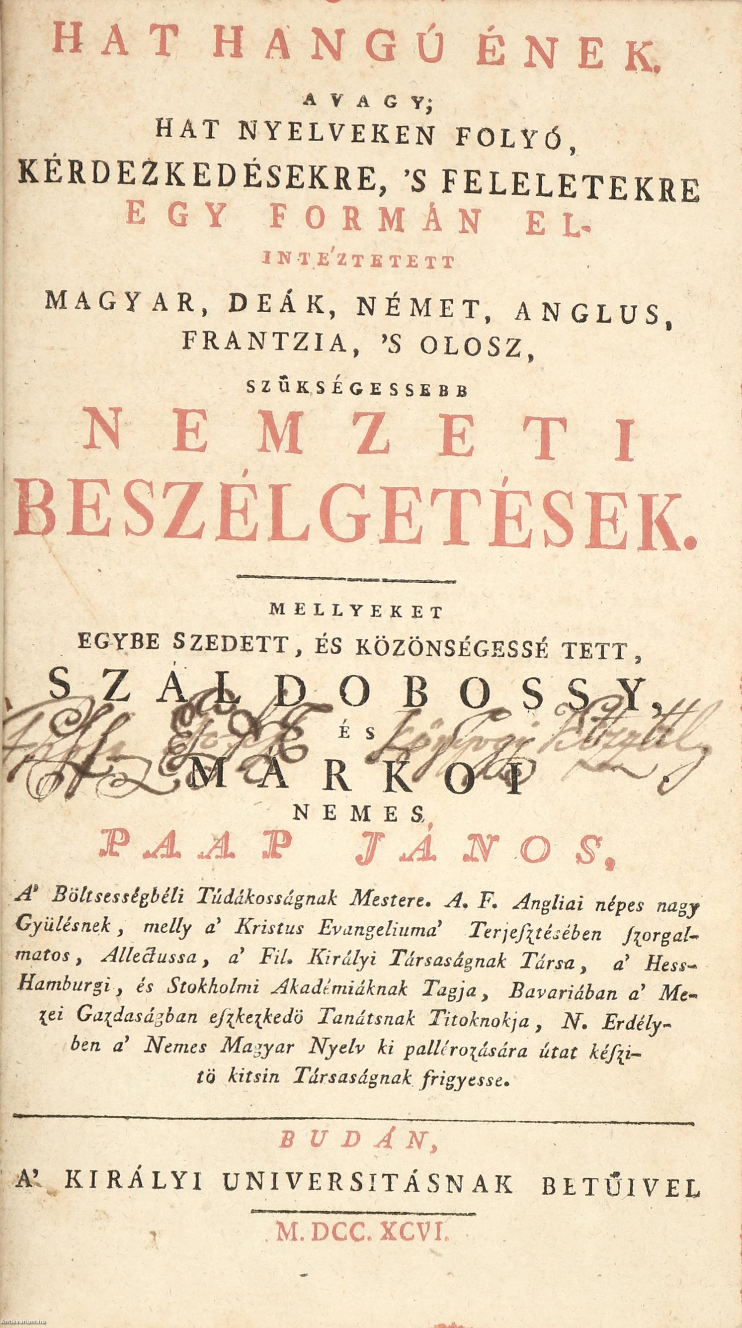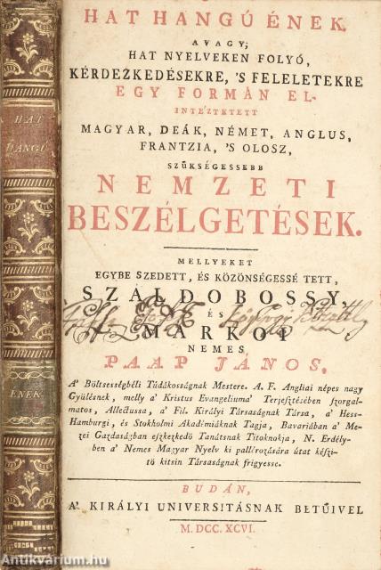 Első kiadás. Hat hangú ének avagy; hat nyelveken folyó, kérdezkedésekre, 's feleletekre egy formán elintéztetett magyar, deák, német, anglus, frantzia, 's olosz, szükségessebb nemzeti beszélgetések mellyeket egybe szedett, és közönségessé tett, száldobossy, és márkoi nemes Paap János. A' Böltsességbéli Túdákosságnak Mestere. A. F. Angliai népes nagy Gyülésnek, melly a' Kristus Evangeliuma' Terjesztésében szorgalmatos, Alleclussa, a' Fil. Királyi Társaságnak Társa, a' Hess-Hamburgi, és Stokholmi Akadémiáknak Tagja, Bavariában a' Mezei Gazdaságban eszkezkedö Tanátsnak Titoknokja, N. Erdélyben a' Nemes Magyar Nyelv ki pallérozására útat készitö kitsin Társaságnak frigyesse. Magyar, latin, német (gótbetűs), angol, francia és olasz nyelvű kötet. Cicero mottójával és előre botsátott beszéddel kiegészített olvasmány. Az előlapon és a címlapon tollal írt tulajdonosi bejegyzés látható. Nyomatott A' Királyi Universitás betűivel, Budán. Korabeli félbőr kötésben lévő példány feliratozatlan, mintás, foltos címfedéllel, aranyozott feliratozású, gazdagon díszített könyvgerinccel, színes, mintázott előzéklapokkal, színezett lapélekkel, feliratozatlan, mintás, hátlappal, hiánytalan állapotban. "...Budán megjelent egy újabb társalgási könyv, Paap János Hat hangú éneke, amelynek különös címe arra vonatkozik, hogy a mű hat oszlopban »magyar, deák, német, anglus, frantzia és olosz« nyelven közli a beszélgetéseket, abból az ötletből kiindulva, hogy segítségükkel két vagy több nyelvet lehet egyszerre megtanulni..." - (Vörös Imre: A francia nyelv oktatása Magyarországon a XVIII. században. - Magyar Pedagógia 1976./1-2. szám/95. p.). A kötet szerzője, Száldobosi és Márkói Paap János tudós. Sokat utazott, Európa majdnem minden tartományát bejárta. A Hessen-Hamburgi, majd a stockholmi tudós társaság tagja, valamint a Bajor Gazdasági Társaság titkára volt.