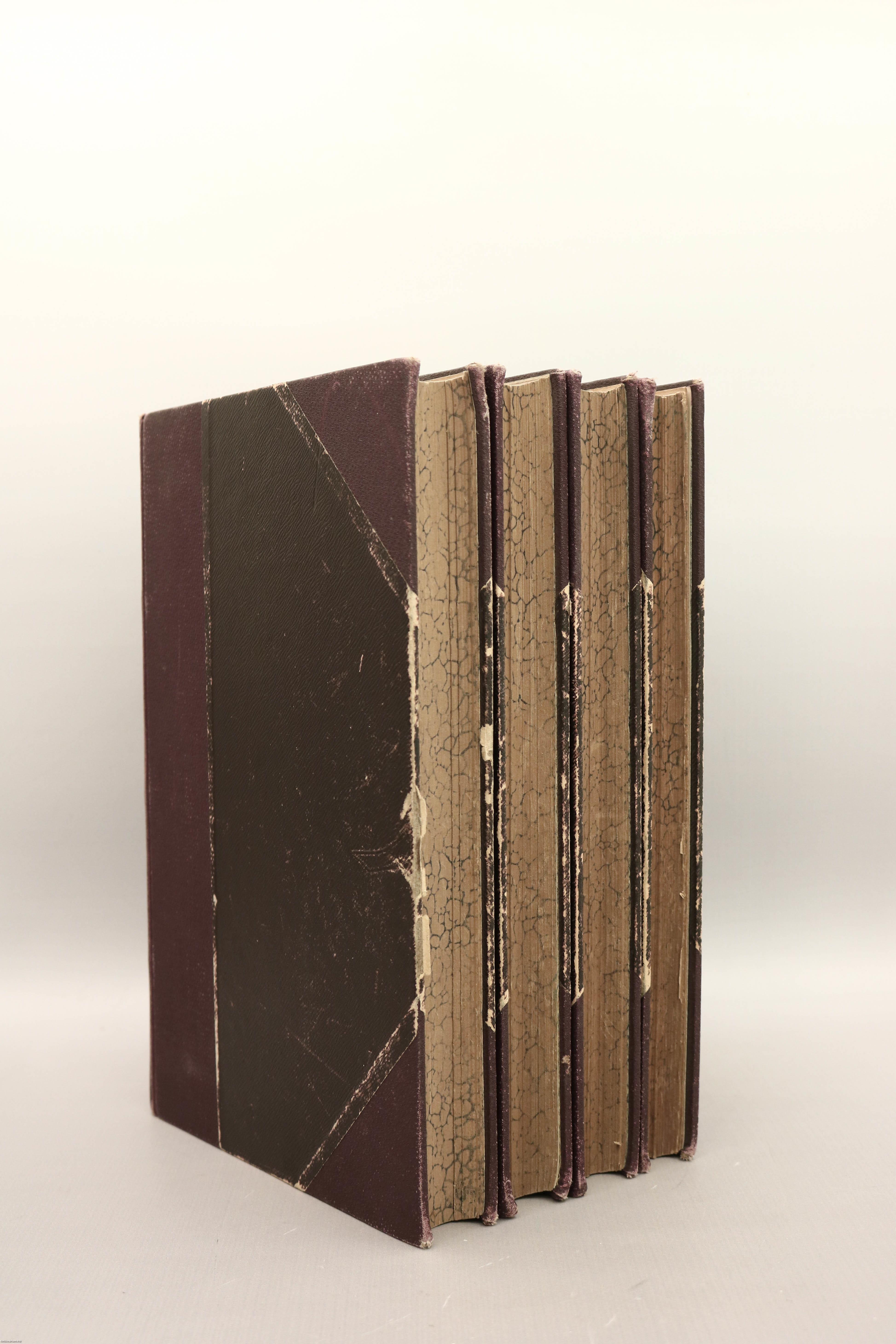 Korabeli félvászon kötésben lévő kötetek feliratozatlan címfedéllel és hátlappal, aranyozott feliratozású könyvgerinccel, színes, levélmintás előzéklapokkal, néhány oldalon ceruzás jelöléssel, aláhúzással és bejegyzéssel, mintázott lapélekkel, szép, hiánytalan állapotban.