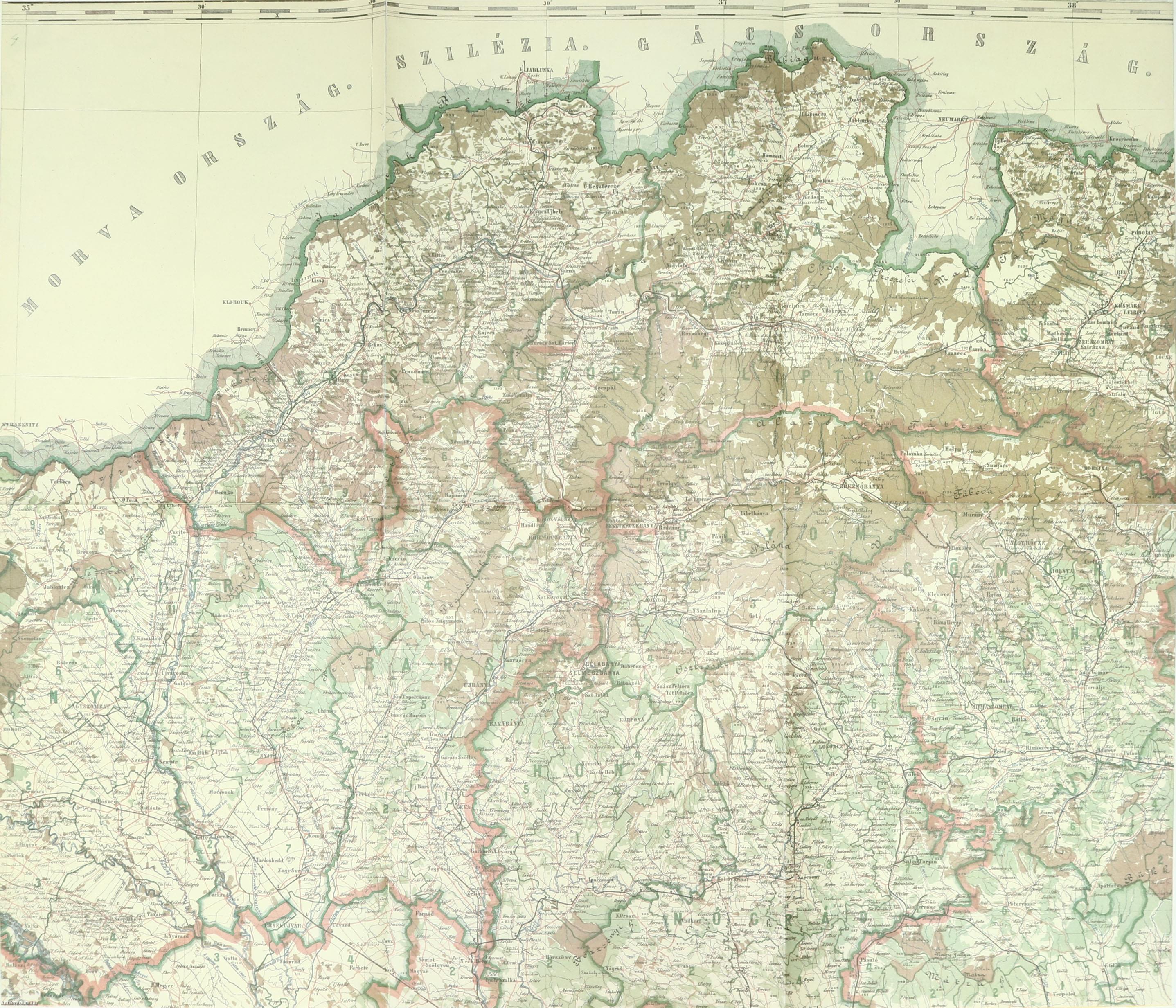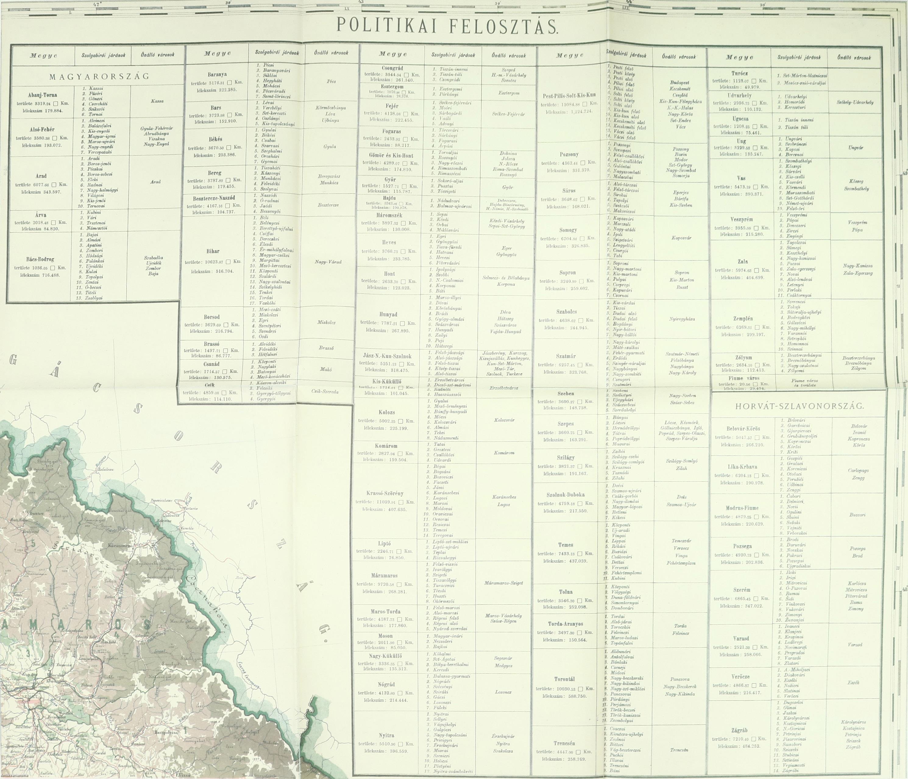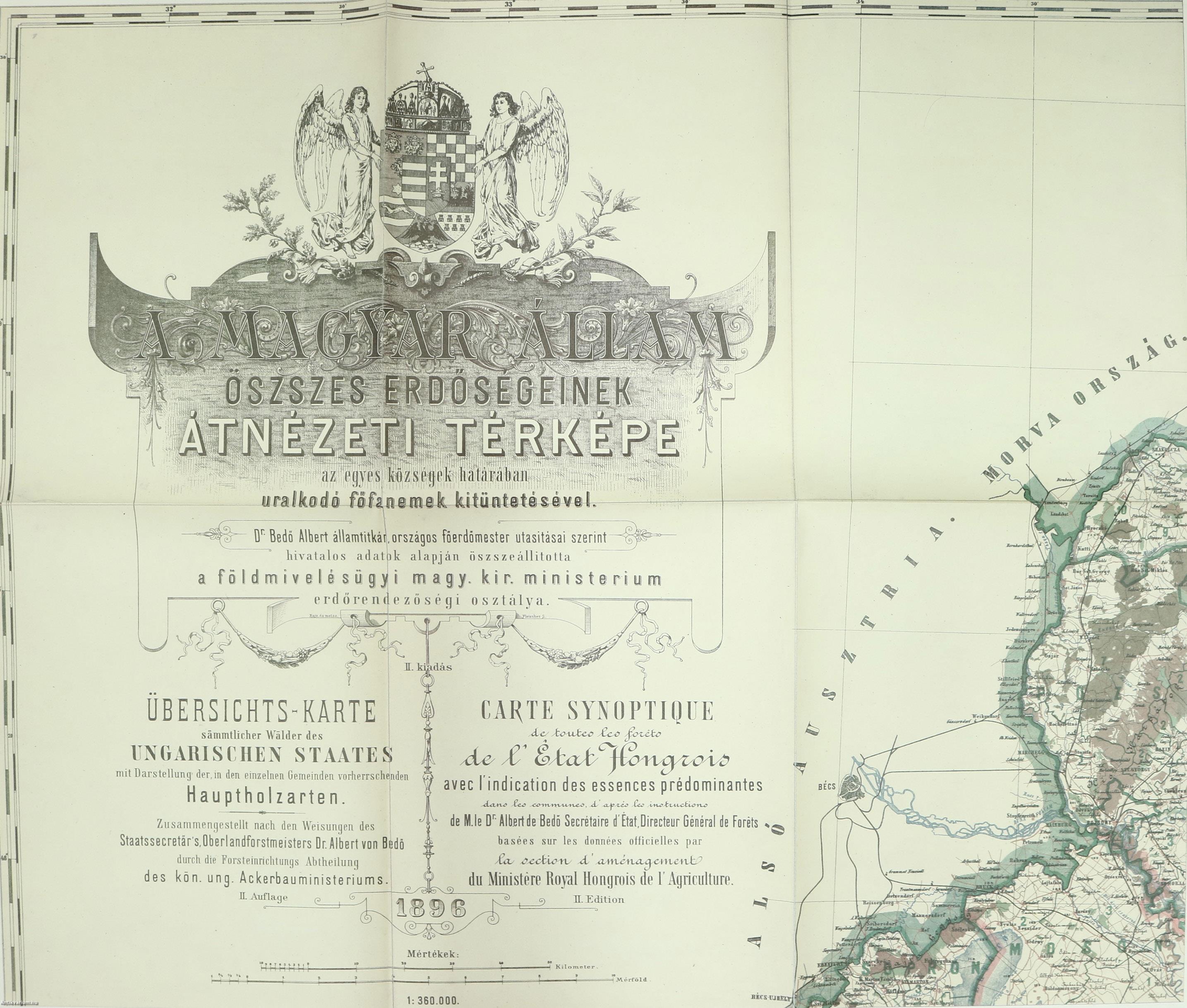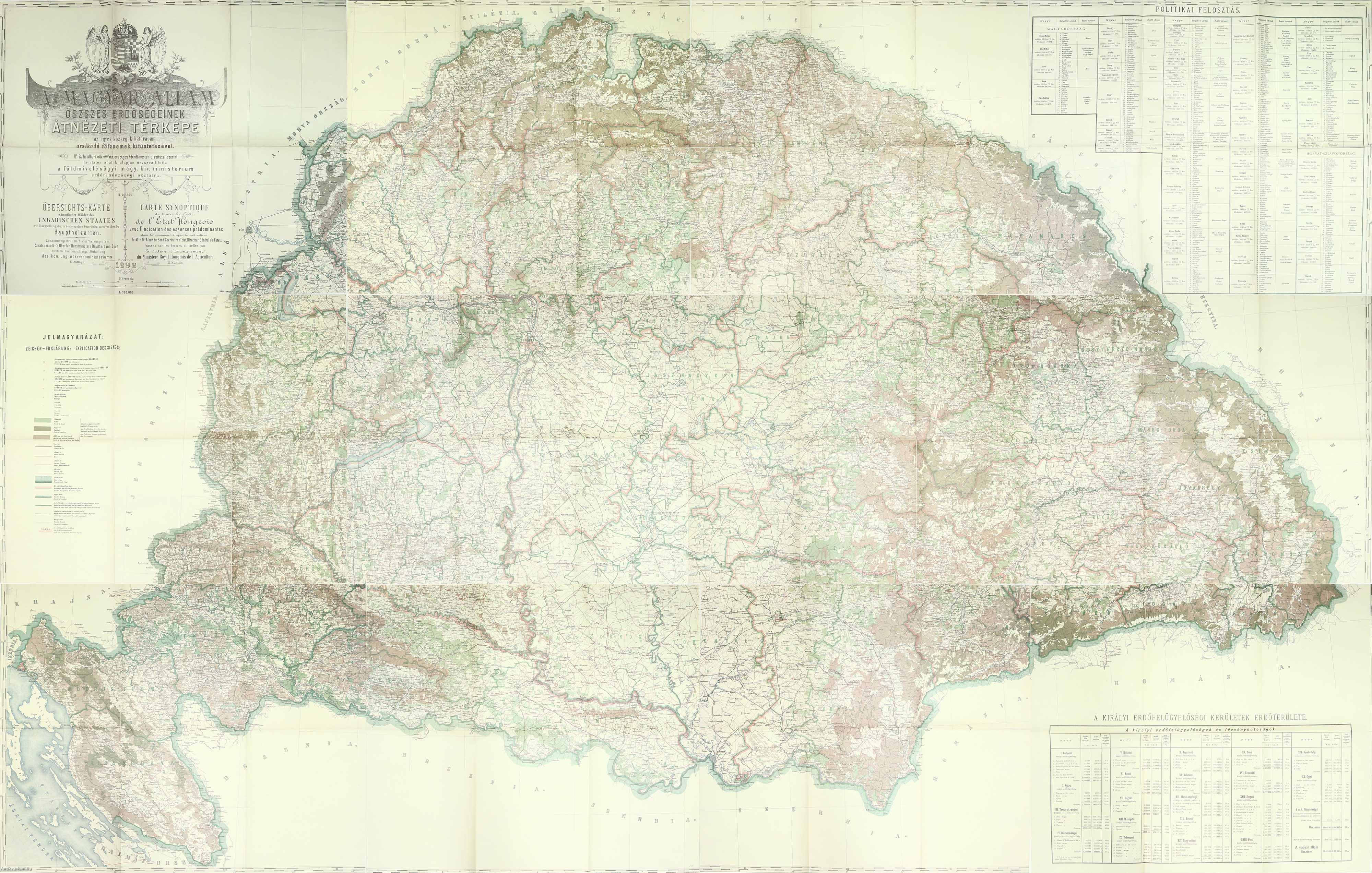 A Magyar Állam összes erdőségeinek átnézeti térképe az egyes községek határában uralkodó főfanem kitüntetésével [reprint]/ Übersichts-Karte sämmtlicher Wälder des ungarischen Staates mit Darstellung der, in den einzelnen Gemeinden vorherrschenden Hauptholzarten. / Carte Synoptique de toutes les foréts de l’Etat Hongrois avec l’indication des essence prédominante dans les communes d’aprés les instructions. (erdőtérkép).