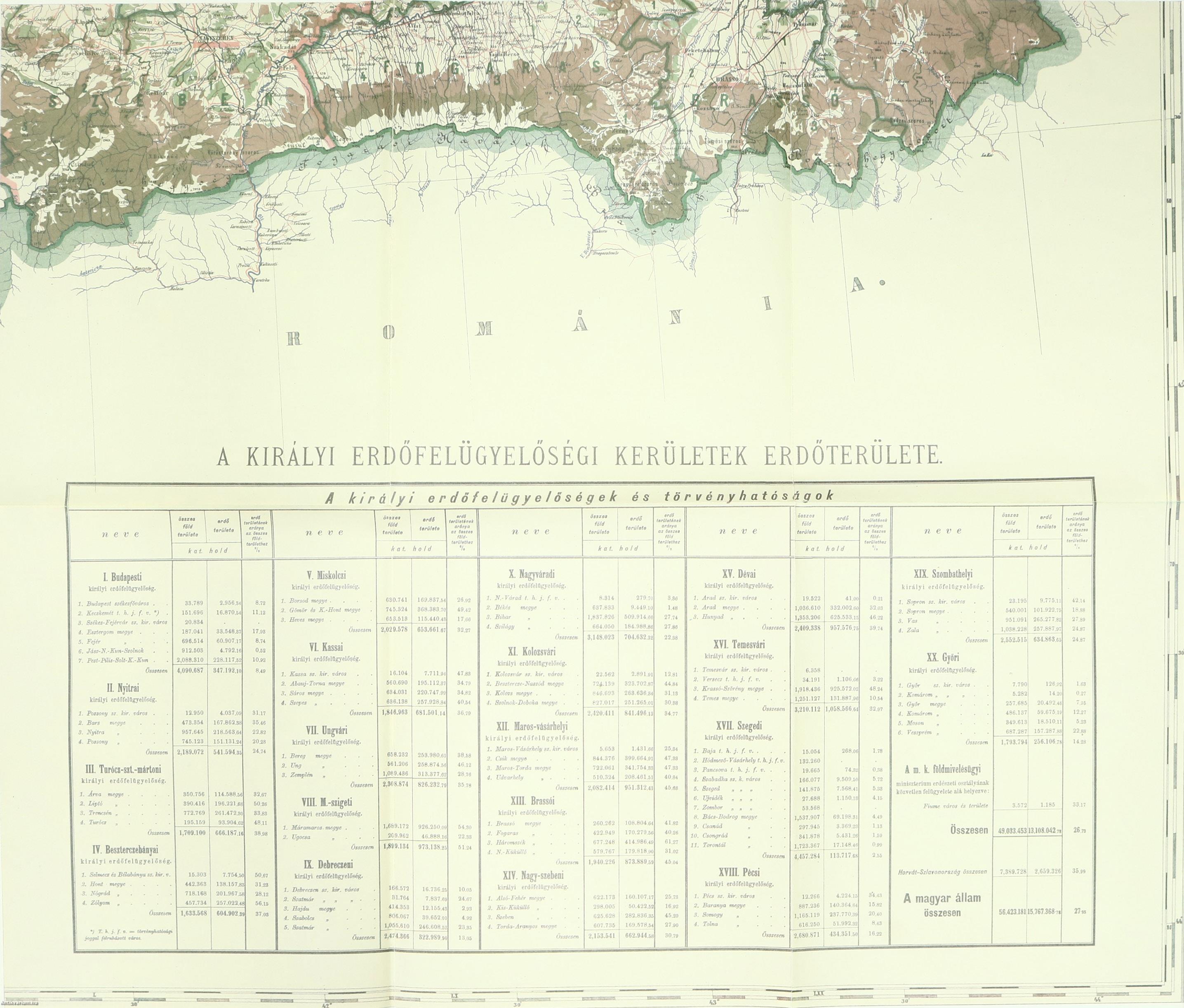 Dr. Bedő Albert államtitkár, országos főerdőmester utasításai szerint hivatalos adatok alapján összeállította a földmívelésügyi magy. kir. ministerium erdőrendezőségi osztálya. Rajzolta és metszette: Fleischer S. Készült az MH Tóth Ágoston Térképészeti Intézetében.