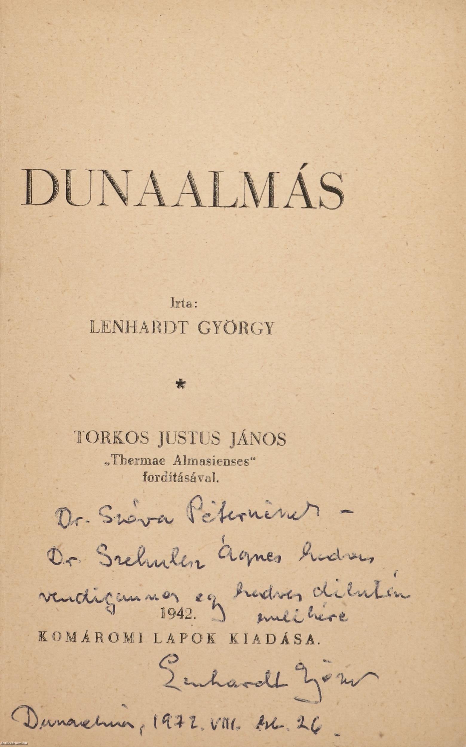 Szerző által dedikált példány. Első kiadás. Dunaalmás. Torkos Justus János "Thermae Almasienses" fordításával. Írta: Lenhardt György. A címlapon a szerző, Lenhardt György tollal beírt, névre szóló dedikációja olvasható: "Dr. Sz. P.-nének - Dr. Sz. Á. kedves vendégemnek egy kedves délután emlékére Lenhardt György Dunaalmás, 1972. VIII. hó. 26.". Ajánlással és befejezéssel kiegészített kötet. Nyomtatta a "Unió" Nyomda és Könyvkiadó Szövetkezet, Komáromban. Kiadói varrott papírkötésben lévő példány feliratos, illusztrált címfedéllel, tollal feliratozott könyvgerinccel, az egyik oldalon tollal készített korrekcióval, hiánytalan állapotban. A kötetet dedikálta, Lenhardt György (Komárom, 1901 - Dunaalmás, 1977) festőművész. A Magyar Iparművészeti Főiskolán tanult. Komáromban, a 30-as évektől pedig Dunaalmáson élt. A győri és a tatai múzeum restaurátoraként dolgozott. 1926-ban a Műcsarnokban volt kiállítása, ezt követően bemutatta műveit Pozsonyban, Kassán, Besztercebányán és Komáromban is. Megírta Dunaalmás történetét, valamint létrehozott egy tekintélyes régészeti magángyűjteményt. Az őskori, kőkori, Honfoglalás kori leletek feltárásával és összegyűjtésével segítette a környék történetének megismerését. Munkásságát többek között történelmi tárgyú kompozíciók, tájképek és csendéletek jellemzik.