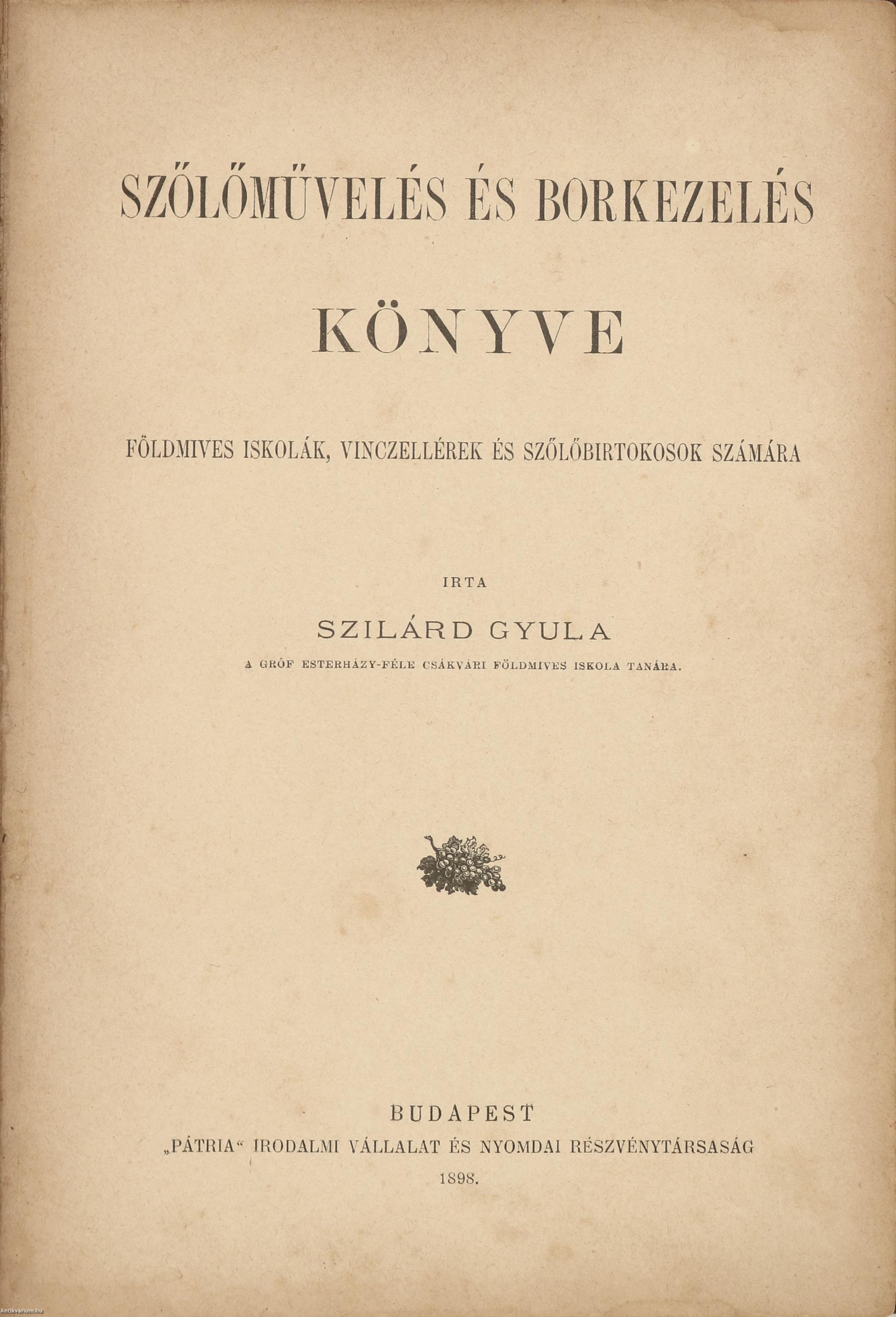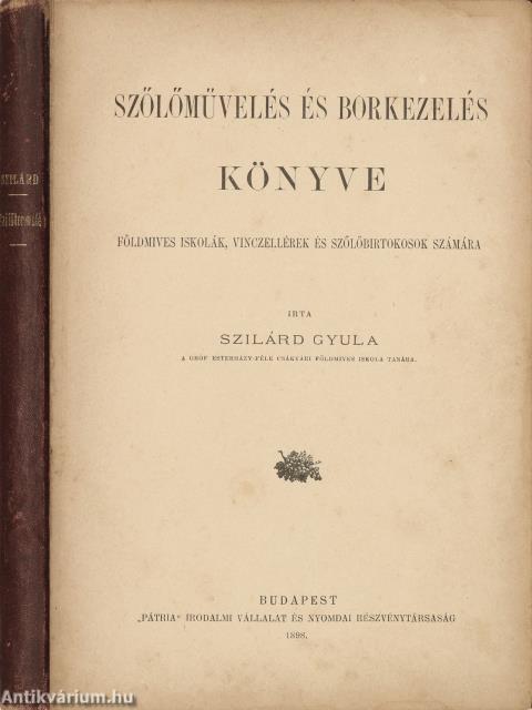 Első kiadás. Szőlőművelés és borkezelés könyve. Földmíves iskolák, vinczellérek és szőlőbirtokosok számára írta: Szilárd Gyula, a gróf Esterházy-féle Csákvári Földmíves Iskola tanára. 75 szövegközti, fekete-fehér, feliratozott és számozott ábrával illusztrált, valamint szerzői ajánlással és előszóval, függelékkel, illetve részletes tartalomjegyzékkel kiegészített kötet. Nyomtatta a "Pátria" Irodalmi Vállalat és Nyomdai Részvénytársaság, Budapesten. Korabeli félvászon kötésben lévő példány feliratozatlan, mintás, sérült címfedéllel és hátlappal, aranyozott feliratozású könyvgerinccel, néhány foltos és egy vágáshibás (157-158. p.) lappal, néhány oldalon ceruzával és tollal készített aláhúzással és kiegészítéssel, mintázott lapélekkel, hiánytalan állapotban. A kötet szerzője, Szilárd Gyula (Csenkepuszta, 1869. augusztus 13. – Csákvár, 1925. január 29.) mezőgazdasági szakember, tanár, szakíró, tankönyvíró. A csákvári Gurdi-Majorban létesített földműves iskola vezető tanára volt. Munkássága úgyszólván a mezőgazdaság minden ágát felölelte. Dolgozott a gyakorlatban, tevékeny szerepet vállalt a mezőgazdasági szakirodalomban, kiváló tanár volt, foglakozott szőlészettel és borászattal is. Több alkalommal járt külföldön, s ottani tapasztalatait mind a szakíró, mind a gyakorló szőlész eredményesen hasznosította. "Méhészet" c. könyvének első kiadása 1908-ban, a második, bővített kiadása 1915-ben jelent meg. Maga is szenvedélyes méhész volt, aki jövedelmezőségi szempontból is ajánlotta a méhészkedés gyakorlását a kisgazdaságokban. Tankönyvíróként is országos hírnévre tett szert, "Mezőgazdaságtan" c. könyve országos népszerűségnek örvendett, a magyar mezőgazdasági tankönyvírásban egyedülállóan 1930-ban már a nyolcadik kiadását érte meg.