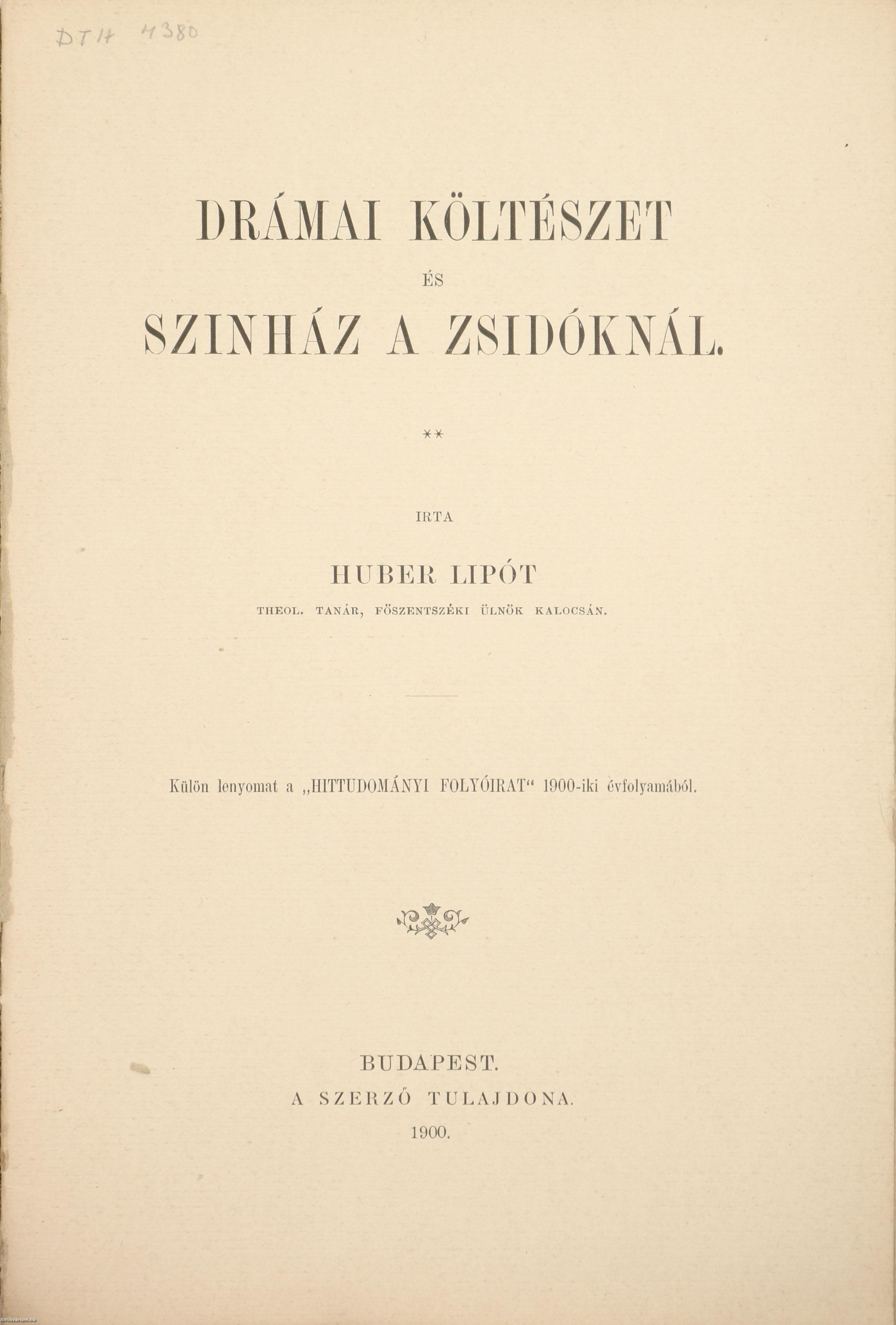 Szerző által dedikált példány. Drámai költészet és színház a zsidóknál. Írta: Huber Lipót theol. tanár, főszentszéki ülnök Kalocsán. A címfedélen a szerző, Huber Lipót tollal írt dedikációja olvasható: "Igaz tisztelete jeléül a szerző. Kalocsán, 1900. X/9." Különlenyomat a "Hittudományi Folyóirat" 1900-iki évfolyamából. Nyomtatta az Athenaeum R. T. Könyvnyomdája, Budapesten. Kiadói varrott papírkötésben lévő példány feliratozott címfedéllel, feliratozatlan, sérült könyvgerinccel, könyvhirdetéssel ellátott hátlappal, hiánytalan állapotban. A kötet szerzője, Huber Lipót (Zombor, 1861. október 23. – Kalocsa, 1946. március 7.) római katolikus pap, címzetes apát, főegyházmegyei cenzor, teológus, egyházi író. 1888-tól a kalocsai Nagyszeminárium Ó- és Újszövetségtanáraként és tanulmányi felügyelőjeként, 1890-től a kalocsai tanítóképző némettanáraként, 1907-től pedig az intézmény igazgatójaként tevékenykedett. 1927-ben megválasztották a nagyszeminárium igazgatójának, majd az idős és beteg papok intézetének felügyelője lett. Később kinevezték az Egyházművészeti Bizottság, valamint a főegyházmegyei takarékpénztár alelnökének. Továbbá tagja volt a Budapesti Filológiai Társaságnak és a Szent István Társulat tudományos és irodalmi osztályának.