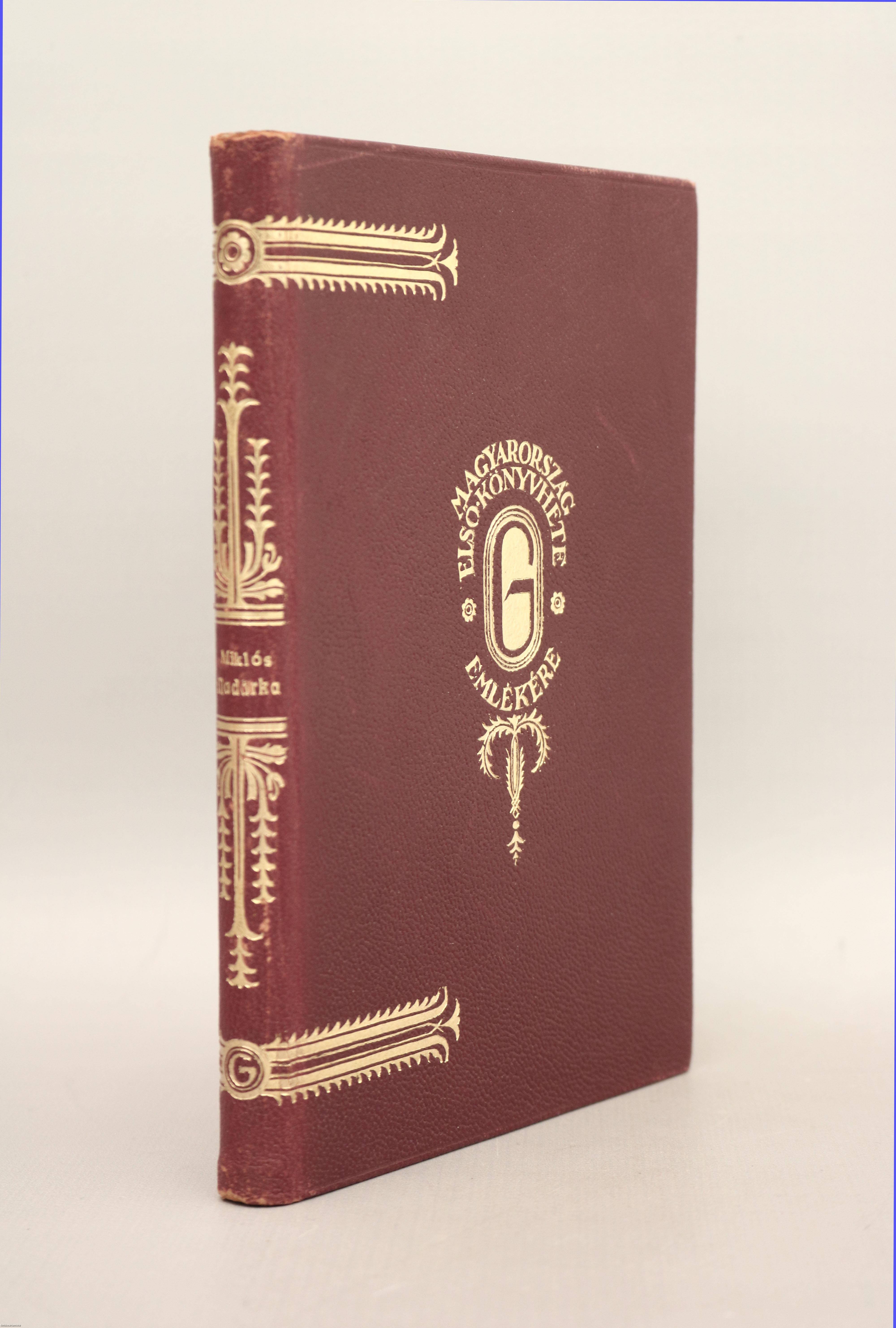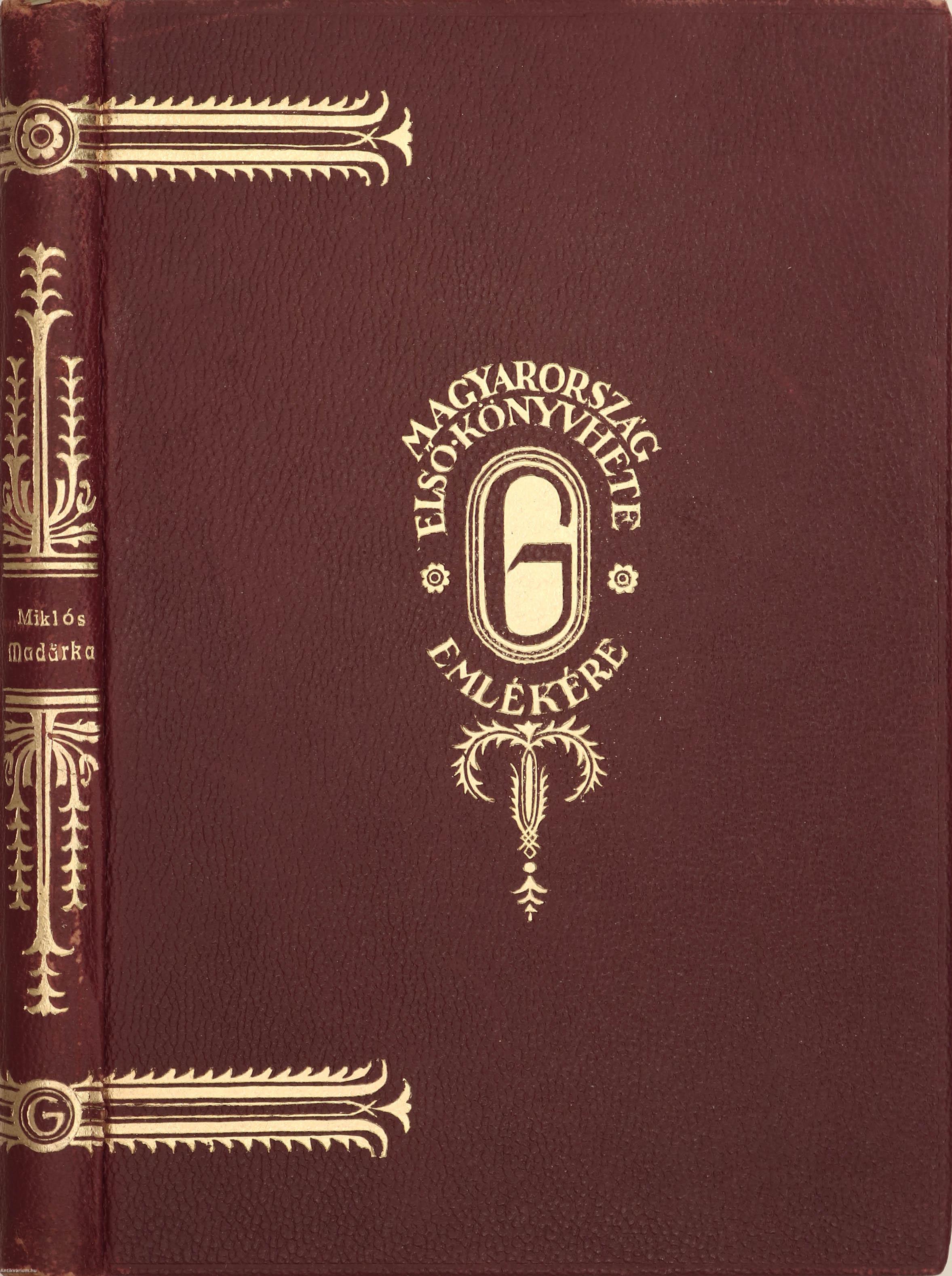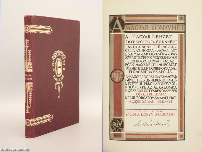 "A Magyar Könyvhét a Magyar Nemzet értelmiségének ünnepe. Ennek a nemzeti ünnepnek célja az, hogy a magyar írót és a magyar olvasót a könyv szeretetének jegyében közelebb hozva egymáshoz, az egész magyar értelmiség széttörhetetlen egybeforrását előmozdítsa és ápolja. A magyar irodalom és magyar műveltség ünnepének emlékezetéül ebből a könyvből külön erre az alkalomra egészbőrkötésben összesen ötven példány kerül forgalomba, amelyből a 19. számú példányt ... [kitöltetlen] úrhölgynek, úrnak küldi a könyv szerzője: Miklós Jenő. 1929 május."