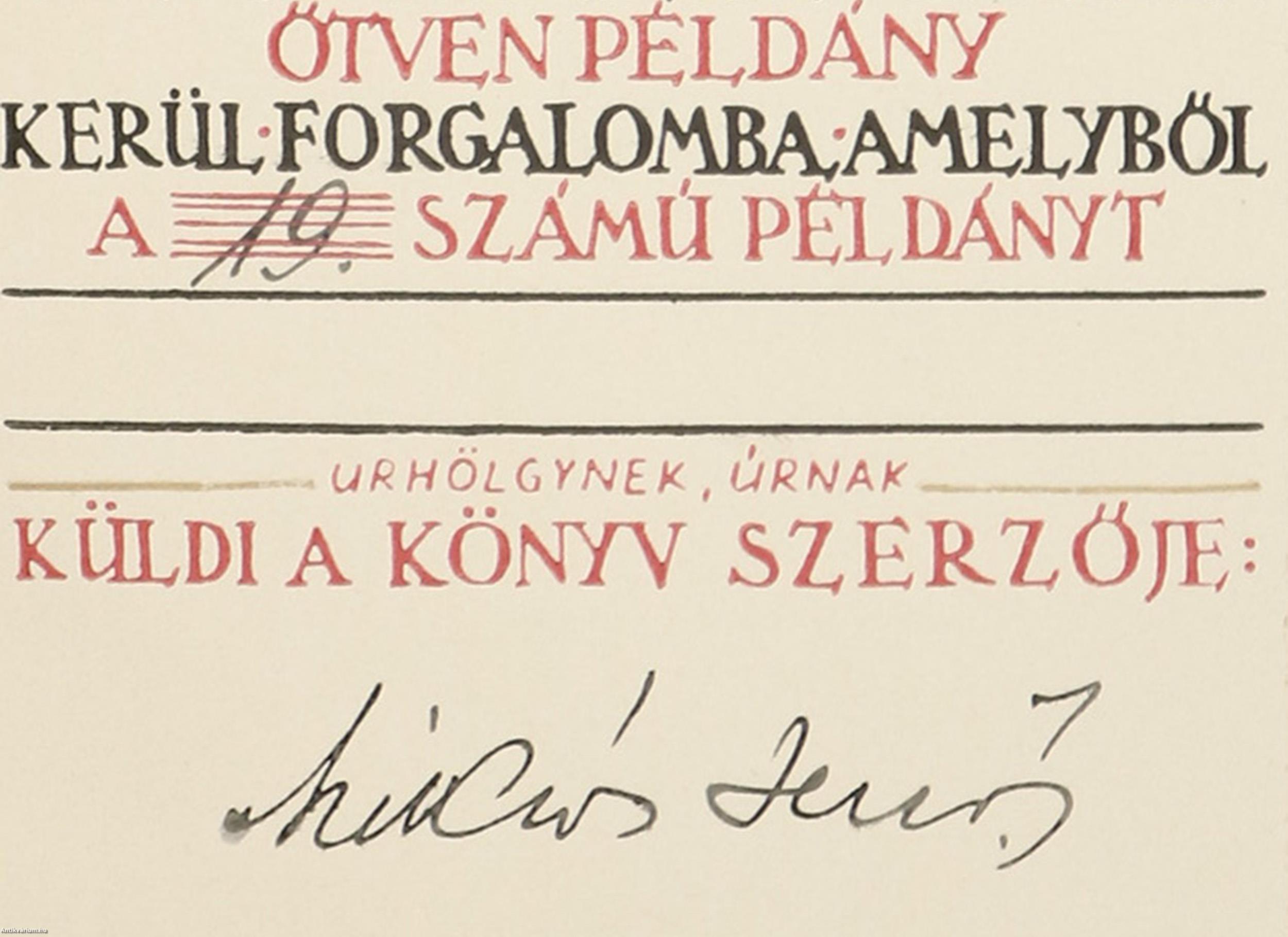 Szerző által aláírt, számozott, bibliofil, Magyarország első könyvhete emlékére kiadott példány.