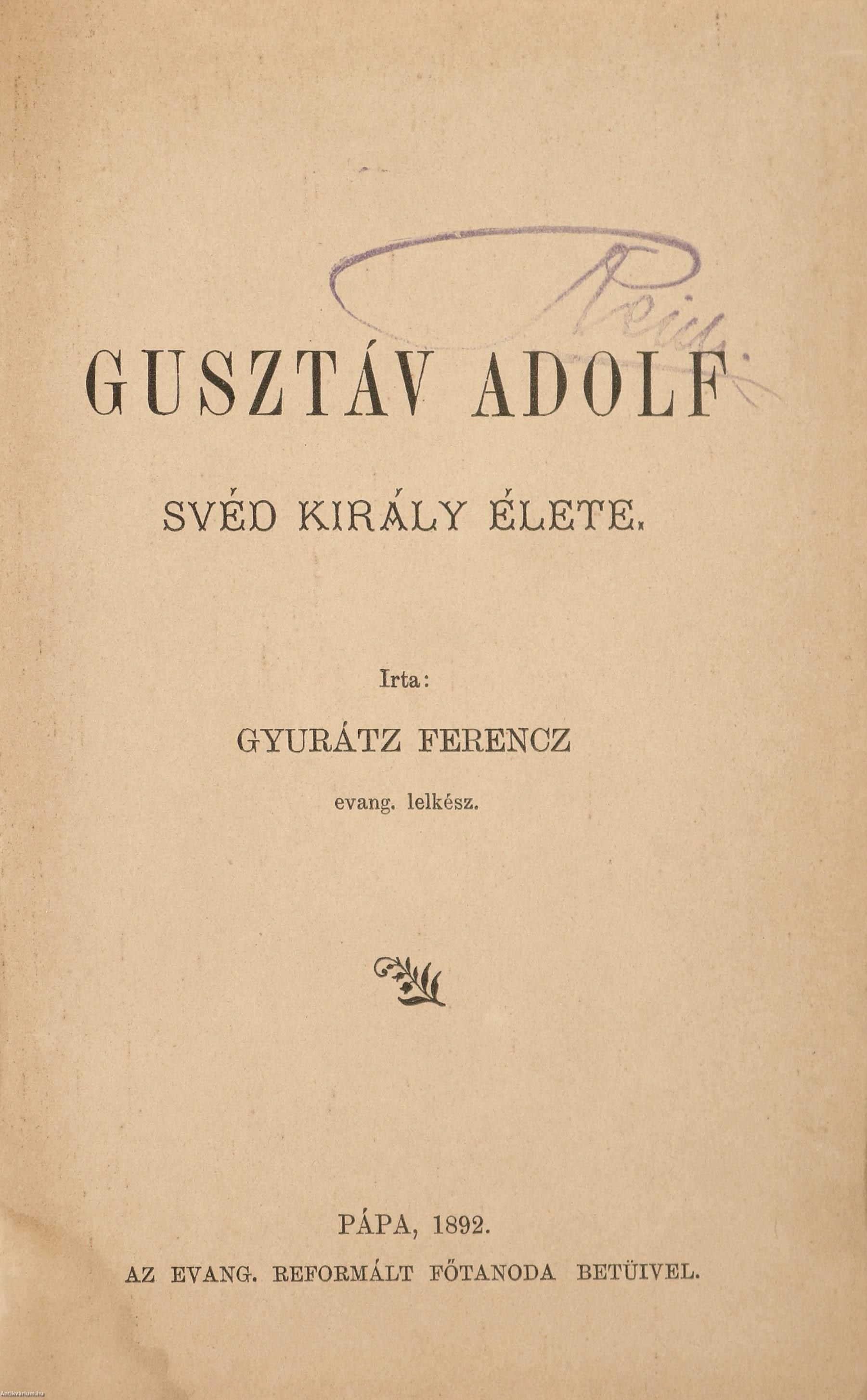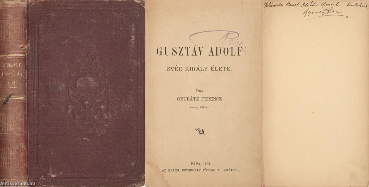 Szerző által dedikált példány. Első kiadás. Gusztáv Adolf svéd király élete. Írta: Gyurátz Ferencz evang. lelkész.