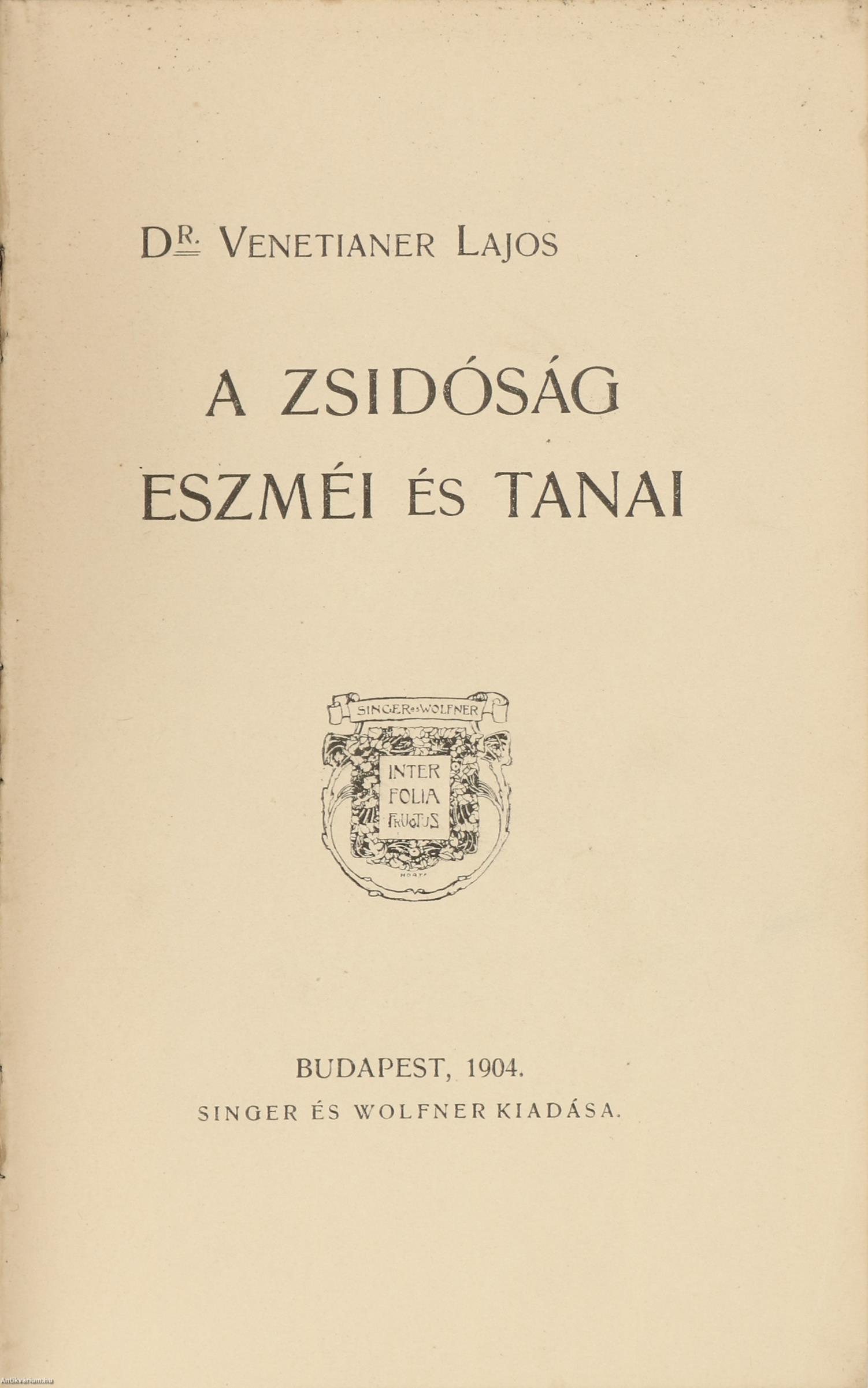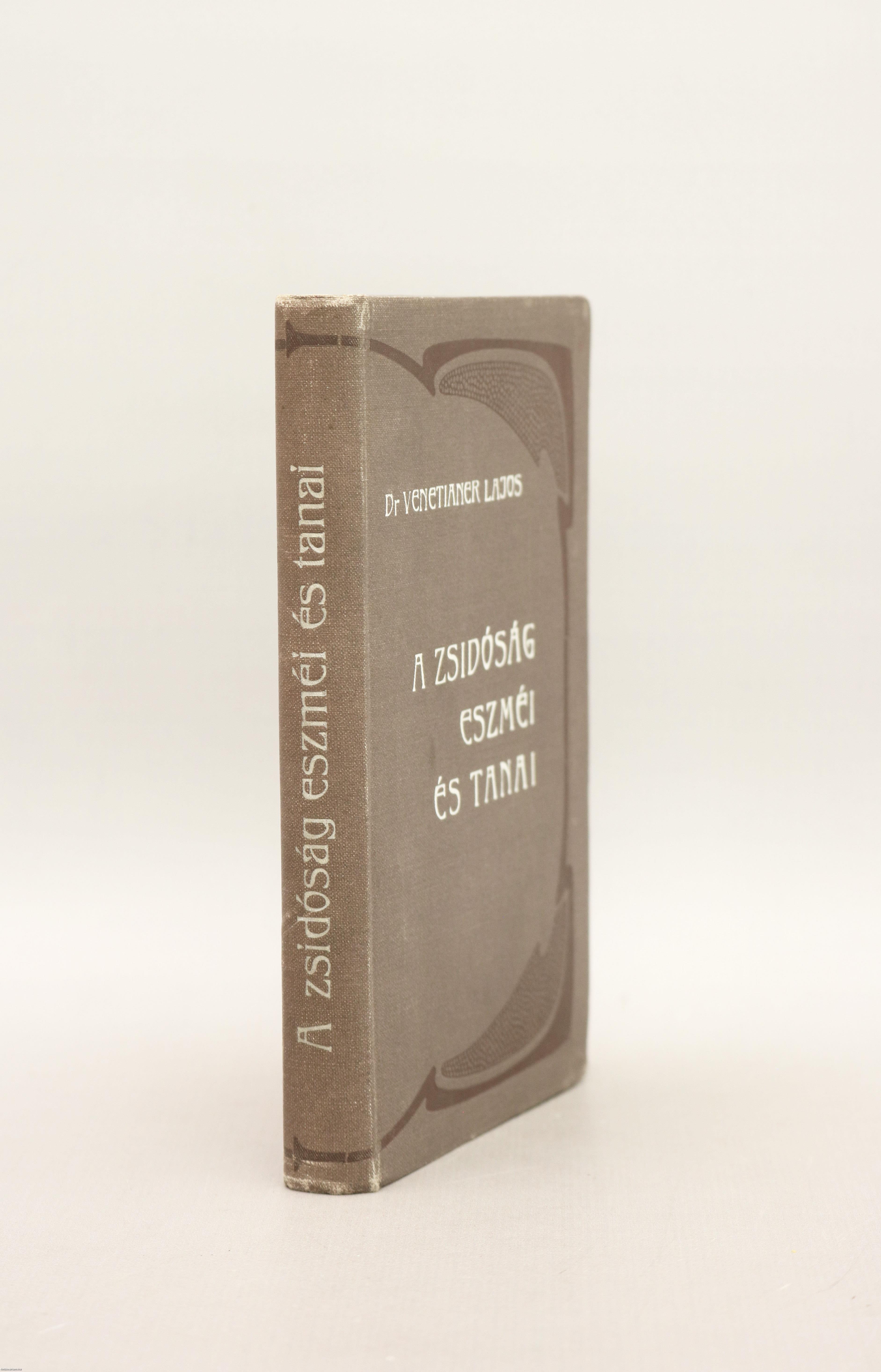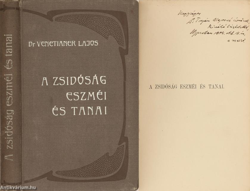 Szerző által dedikált példány. Első kiadás. A zsidóság eszméi és tanai. Írta: Dr. Venetianer Lajos. Az előlapon a szerző, Dr. Venetianer Lajos tollal beírt, névre szóló dedikációja olvasható: "Nagyságos Dr. T. A.-né úrnőnek kiváló tisztelettel, Ujpesten 1904. okt. 18.án, a szerző". Bevezetéssel és tartalomjegyzékkel kiegészített kötet. Nyomtatta Márkus Samu Könyvnyomdája, Budapesten. Kiadói egészvászon kötésben lévő példány feliratozott, díszes címfedéllel, feliratos könyvgerinccel, mintázott, sérült előzéklapokkal, hiánytalan állapotban. A szerző nagy szakértelemmel és alapossággal megírt kis könyvében esszenciális, átfogó összefoglalóját adja a zsidóság eszméinek és tanainak. A kötet szerzője, Venetianer Lajos (1867–1922) főrabbi, történész. 1892-ben avatták rabbivá, ezt követően Csurgón, utána Lugoson, majd Újpesten volt főrabbi. Később az Országos Rabbiegyesület alelnökeként, valamint a Ferenc József Országos Rabbiképző Intézet tanáraként tevékenykedett. Számos teológiai tanulmányt és a zsidóság történetét tárgyaló művet írt.