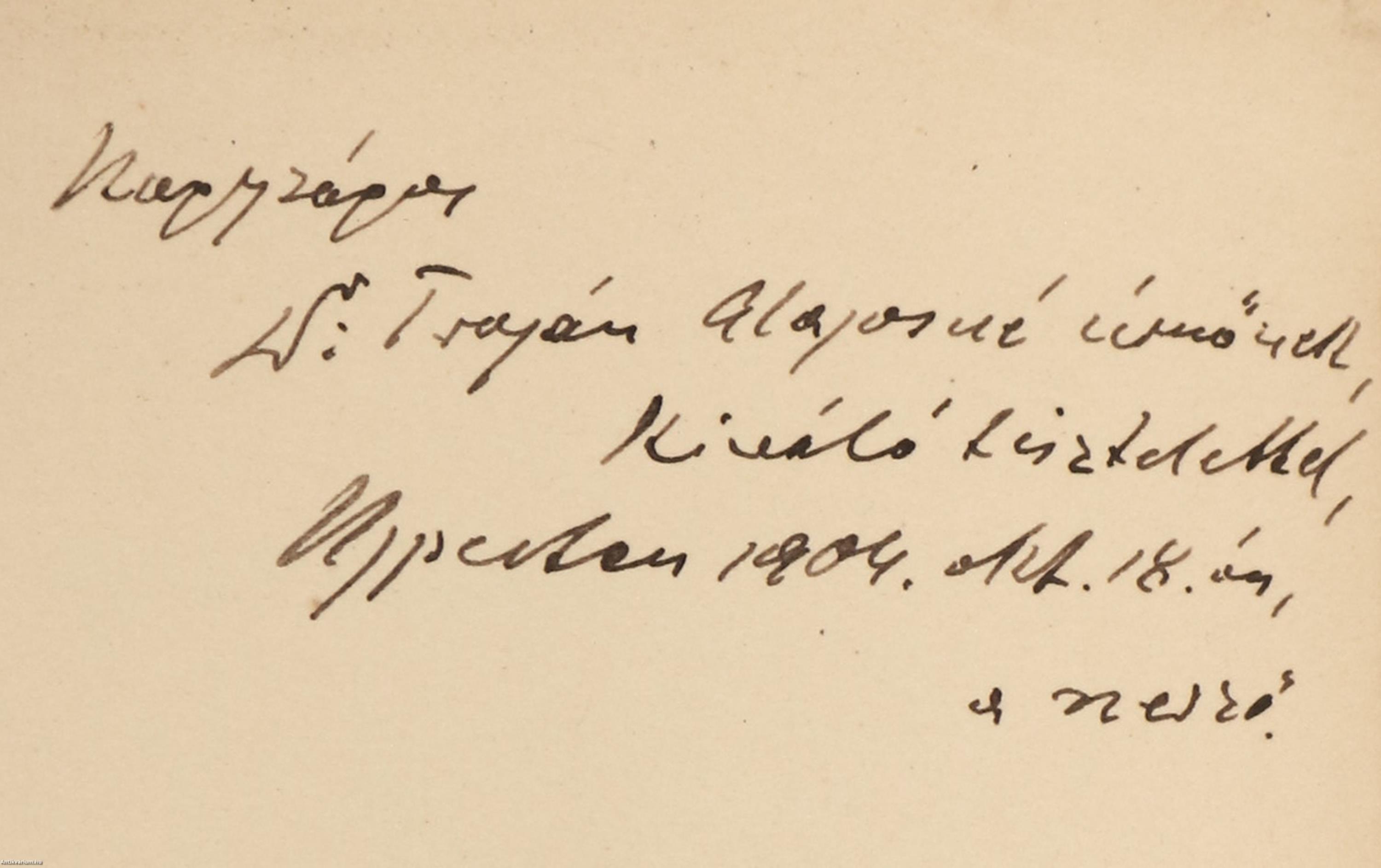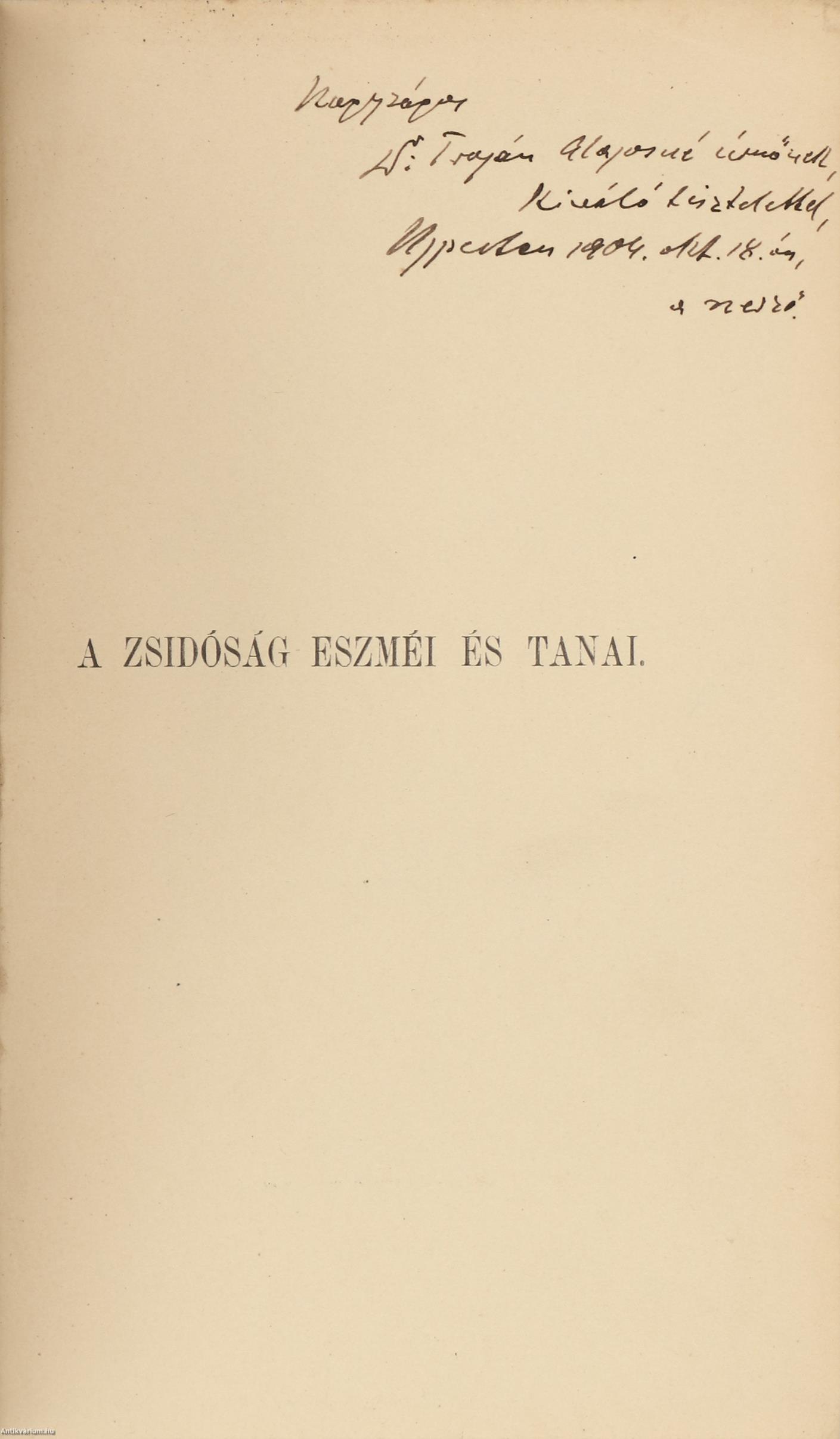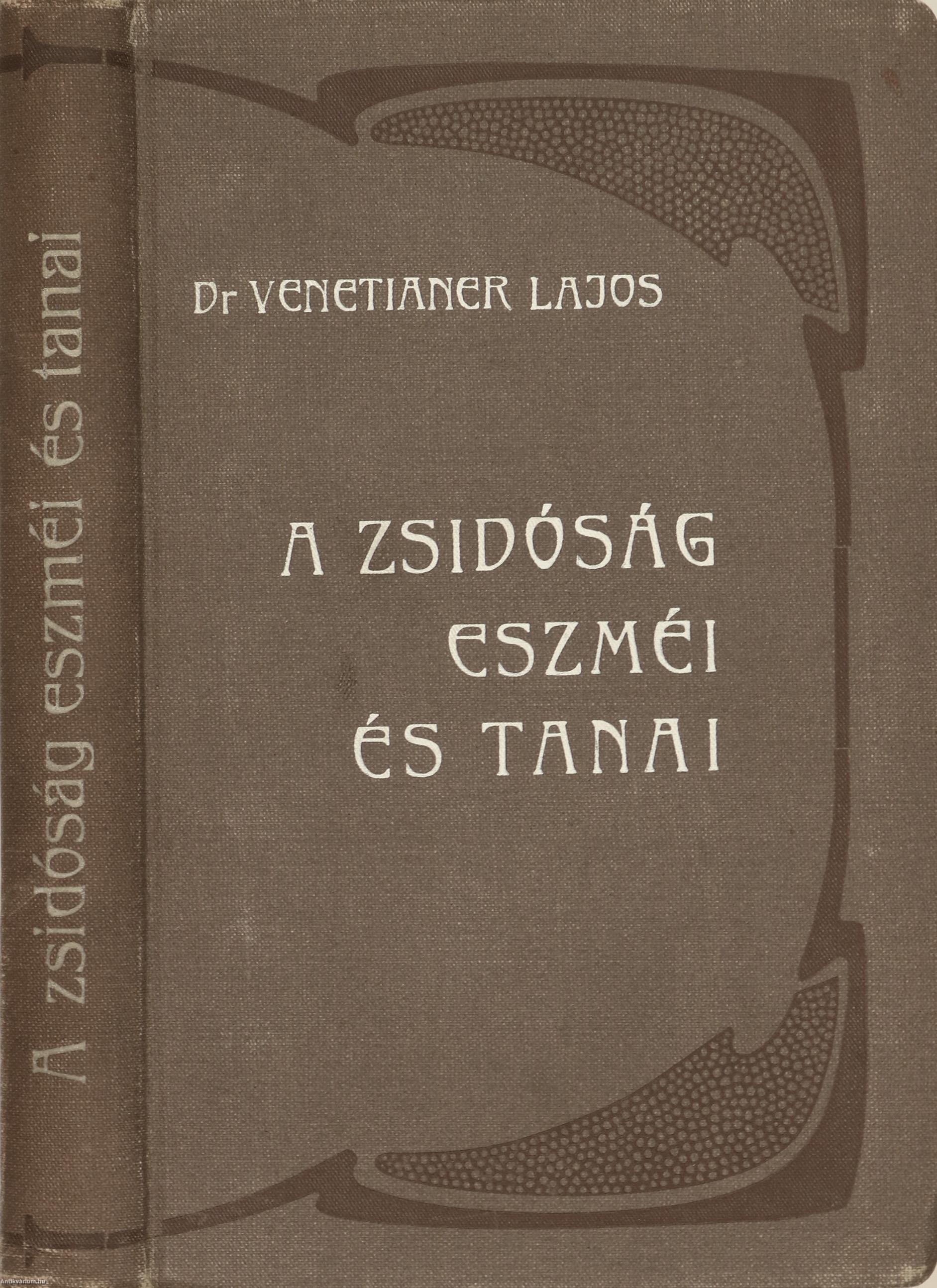 Szerző által dedikált példány. Első kiadás. A zsidóság eszméi és tanai. Írta: Dr. Venetianer Lajos. Az előlapon a szerző, Dr. Venetianer Lajos tollal beírt, névre szóló dedikációja olvasható: "Nagyságos Dr. T. A.-né úrnőnek kiváló tisztelettel, Ujpesten 1904. okt. 18.án, a szerző". Bevezetéssel és tartalomjegyzékkel kiegészített kötet. Nyomtatta Márkus Samu Könyvnyomdája, Budapesten. Kiadói egészvászon kötésben lévő példány feliratozott, díszes címfedéllel, feliratos könyvgerinccel, mintázott, sérült előzéklapokkal, hiánytalan állapotban. A szerző nagy szakértelemmel és alapossággal megírt kis könyvében esszenciális, átfogó összefoglalóját adja a zsidóság eszméinek és tanainak. A kötet szerzője, Venetianer Lajos (1867–1922) főrabbi, történész. 1892-ben avatták rabbivá, ezt követően Csurgón, utána Lugoson, majd Újpesten volt főrabbi. Később az Országos Rabbiegyesület alelnökeként, valamint a Ferenc József Országos Rabbiképző Intézet tanáraként tevékenykedett. Számos teológiai tanulmányt és a zsidóság történetét tárgyaló művet írt.
