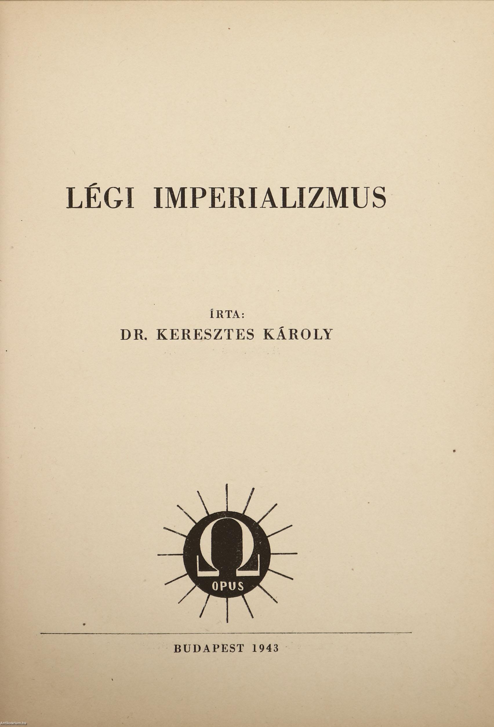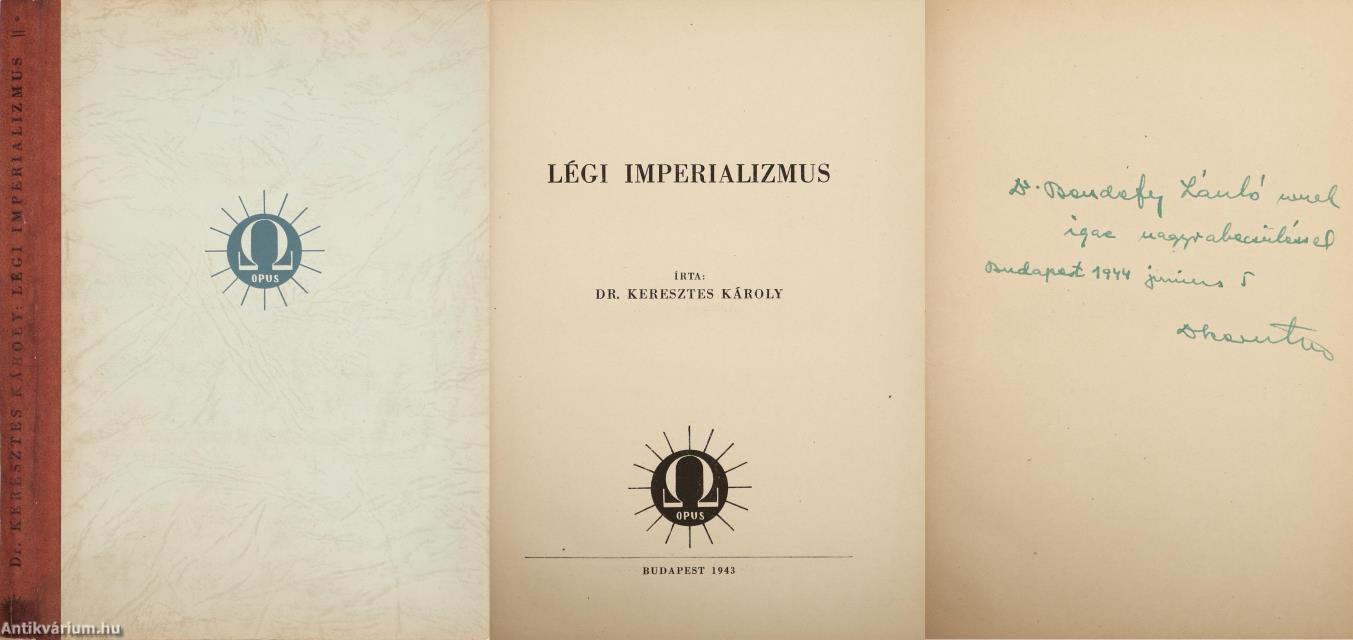 Szerző által dedikált példány. Első kiadás. Légi imperializmus. Írta: Dr. Keresztes Károly. Az előlapon a szerző, Dr. Keresztes Károly tollal beírt, névre szóló dedikációja olvasható: "Dr. Bendefy László urnak igaz nagyrabecsüléssel. Budapest, 1944. junius 5. Dr. Keresztes".