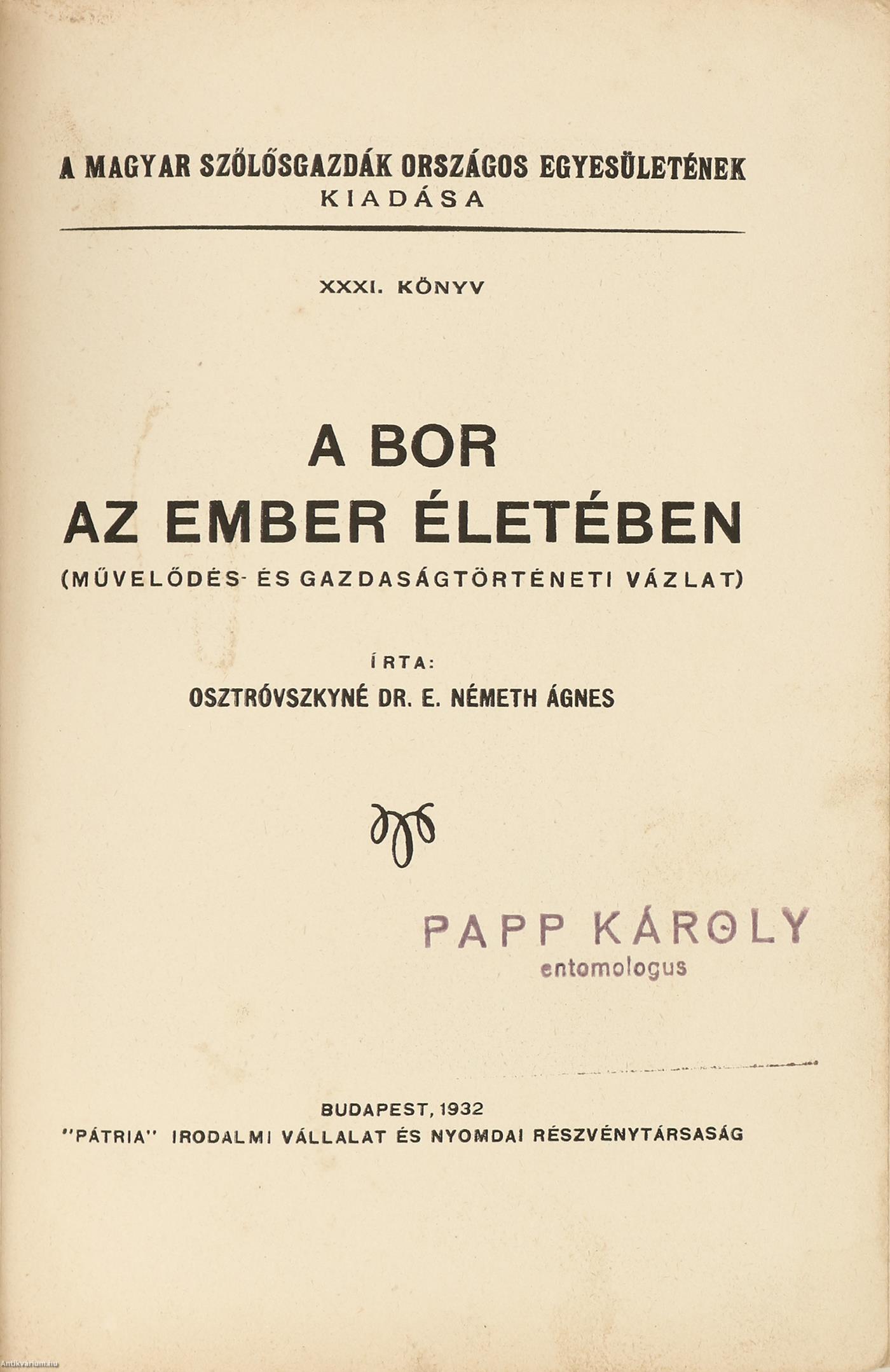 Első kiadás. A Magyar Szőlősgazdák Országos Egyesületének Kiadása. No.: XXXI. könyv. A bor az ember életében. Írta: Osztrovszkyné Dr. E. Németh Ágnes. Négy fekete-fehér, feliratozott képtáblával és néhány szövegközti, fekete-fehér képpel illusztrált, valamint szerzői előszóval és tartalomjegyzékkel kiegészített kötet. A címfedélen, a hátlapon, az előlapon és a címlapon tulajdonosi bélyegzés látható. Nyomtatta a Pátria-nyomda R.-T., Budapesten. Kiadói fűzött papírkötésben lévő példány feliratozott, tollal írt számjelzéssel ellátott (belső oldalán is) címfedéllel, feliratozatlan könyvgerinccel (rajta apróbb sérülésekkel), néhány foltos lappal, hátlapon a kiadó feltüntetésével, hiánytalan állapotban. "...Osztrovszkyné dr Németh Ágnes nem kis fáradtsággal állította össze könyvét, megismertetve a bornak a szerepét az emberi élet összes vonatkozásaiban. Ismerteti könyvében a régi idők szőlőművelési módjait, ugyanakkor kitér a borfogyasztásnak általános szokásaira is. Érdekes része a könyvnek az a fejezet, amely az emberiség vallásos életével kapcsolatosan vezeti le a bor döntő szerepét az emberi életben. [...] A könyv áttekinthetően és érdekesen világít bele abba a kérdésbe is, hogy a következő fejezetben a bornak közgazdasági, illetőleg kereskedelmi fontosságát ismertesse a régmúlt időktől kezdve a mai napig. Döntő fontosságú és érdekességű fejezet a könyvben a bornak, mint orvosságnak és tápszernek ismertetése, amely fejezetben nemcsak külföldi orvosok véleményét közli, nemcsak az ókori orvosi és gyógyító módokat, hanem a magyar orvosi kar kiválóságainak véleményét is ismerteti a bor jótékony hatását illetőleg. Az irodalom és művészetnek borral kapcsolatos megnyilvánulásai képezik a következő fejezetnek tartalmát, amelynek során úgy klasszikus, mint pedig újkori költőinknek bordalait és a borral foglalkozó költeményeit közli, hogy végül a magyar borgazdaságnak vázlatos történetét adja." - (Somogyi Ujsag, 1932. április 02./14. évfolyam/74. szám).