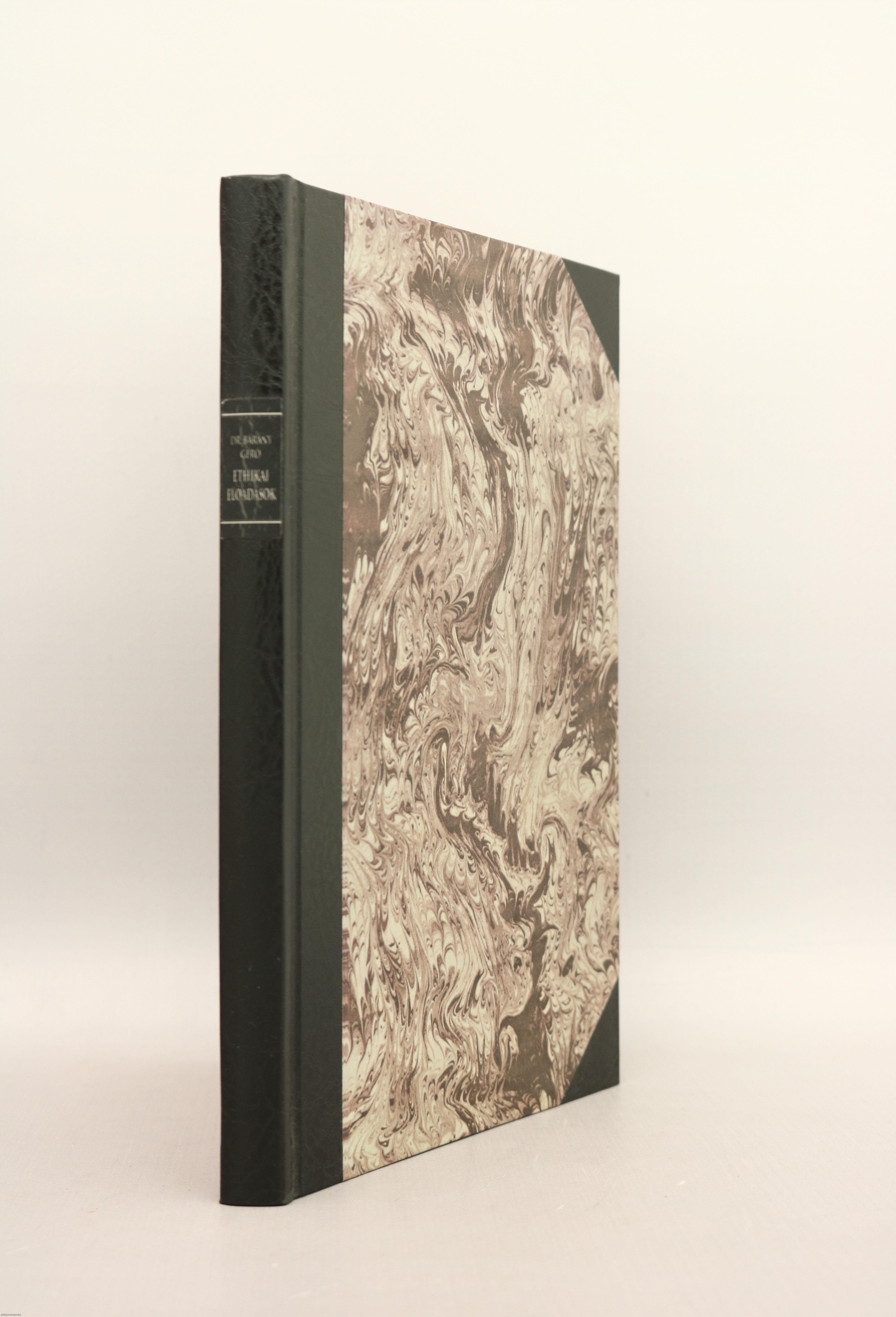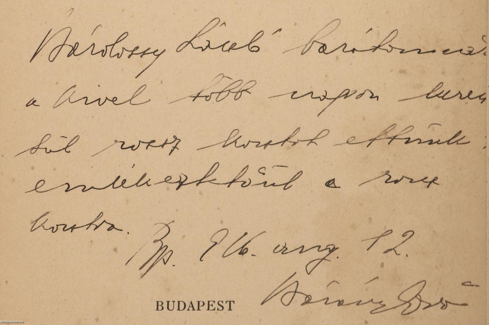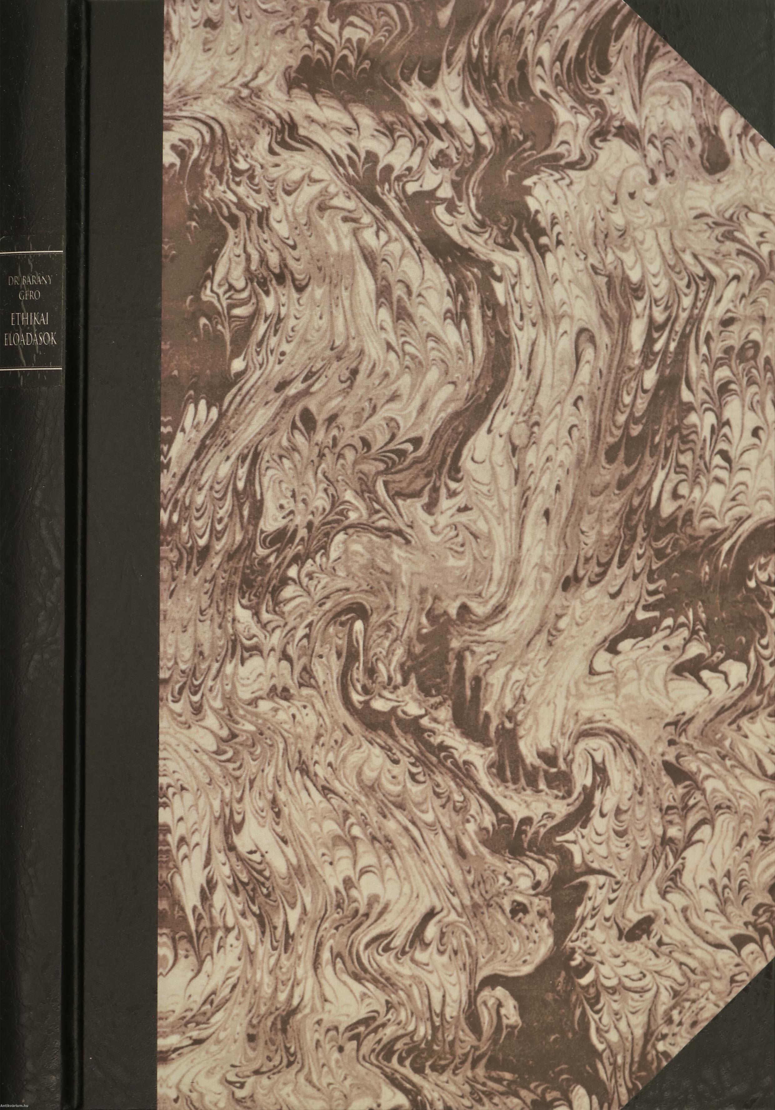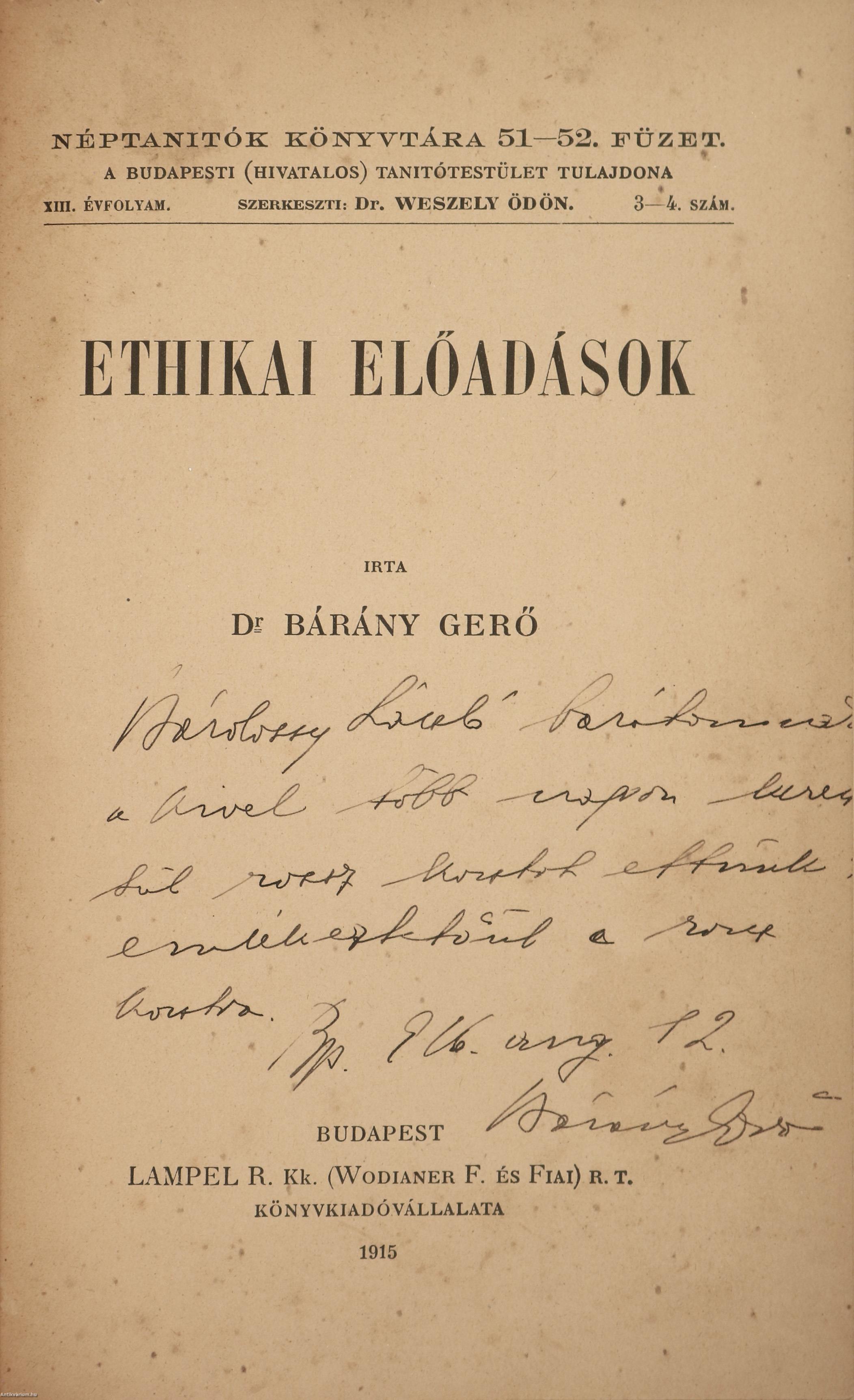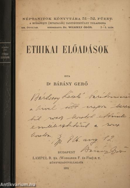 Szerző által dedikált példány. Első kiadás. Néptanítók Könyvtára. 51-52. füzet. XIII. évfolyam. 3-4. szám. Szerkeszti: Dr. Weszely Ödön. Ethikai előadások. Írta: Dr. Bárány Gerő. A címlapon a szerző, Dr. Bárány Gerő tollal beírt, névre szóló dedikációja olvasható: "Bárdossy László barátomnak akivel több napon keresztül rossz kosztot ettünk, emlékeztetőül a rossz kosztra. Bp. 916. aug. 12. Bárány Gerő". A dedikáció címzettje, Bárdossy László (Szombathely, 1890. december 10. – Budapest, 1946. január 10.) diplomata, politikus. 1924-től a Külügyminisztérium sajtóosztályának kinevezett vezetője volt. 1941. február 4-én kinevezték külügyminiszternek, majd gróf Teleki Pál öngyilkosságát követően miniszterelnöknek. Miniszterelnöksége alatt történt a kamenyec-podolszkiji mészárlás és ekkor fogadták el a „harmadik zsidótörvény”-t, továbbá 1941-ben javasolta a Szovjetunióval szembeni hadiállapot kinyilvánítását és hadat üzent az Amerikai Egyesült Államoknak. Később a népbíróság háborús bűnök miatt halálra ítélte. Az ítéletet 1946. január 10-én hajtották végre. Előszóval, bevezetéssel és részletes tartalomjegyzékkel kiegészített kötet. Nyomtatta a Franklin-Társulat Nyomdája. Könyvkötői műbőr kötésben lévő példány feliratozatlan, mintás címfedéllel és hátlappal, a könyvgerincre kasírozott eredeti, feliratozott, kiadói könyvgerinc részlettel, új, mintás előzéklapokkal, hiánytalan állapotban. A kötet szerzője, Bárány Gerő (Dés, 1878. január 9. – Budapest, 1939. május 2.) jogász, jogbölcseleti író. 1900-tól a Közoktatásügyi Minisztériumban dolgozott, mint helyettes államtitkár ment nyugdíjba. Ezenkívül 1926-tól a Budapesti Tudományegyetem Közgazdasági Karán a filozófia meghívott előadója volt. Mint jogbölcseleti szakíró szubjektív idealista álláspontot képviselt.