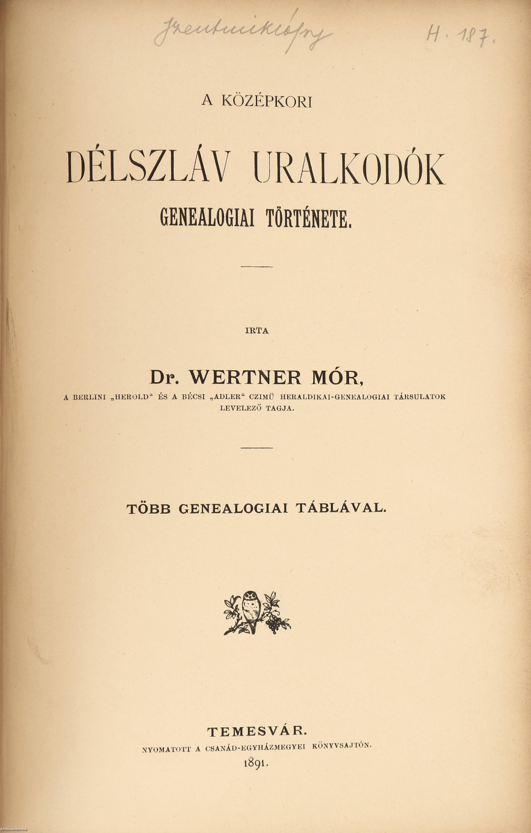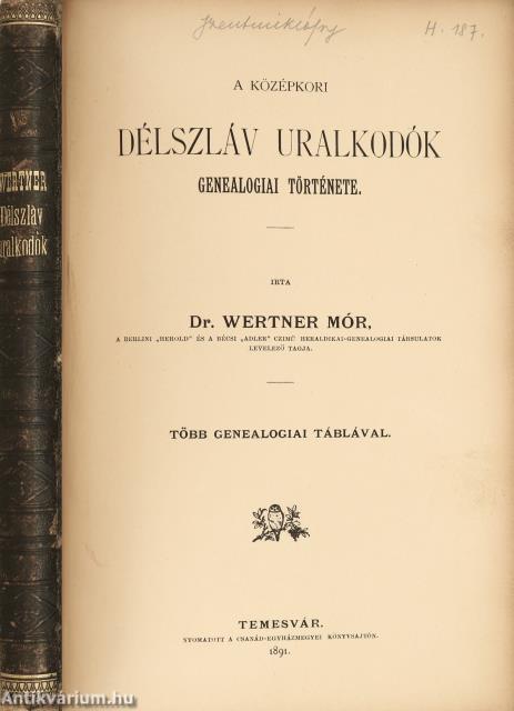 A középkori délszláv uralkodók genealógiai története. Írta: Dr. Wertner Mór, a berlini "Herold" és a bécsi "Adler" című heraldikai-genealógiai társulatok levelező tagja.