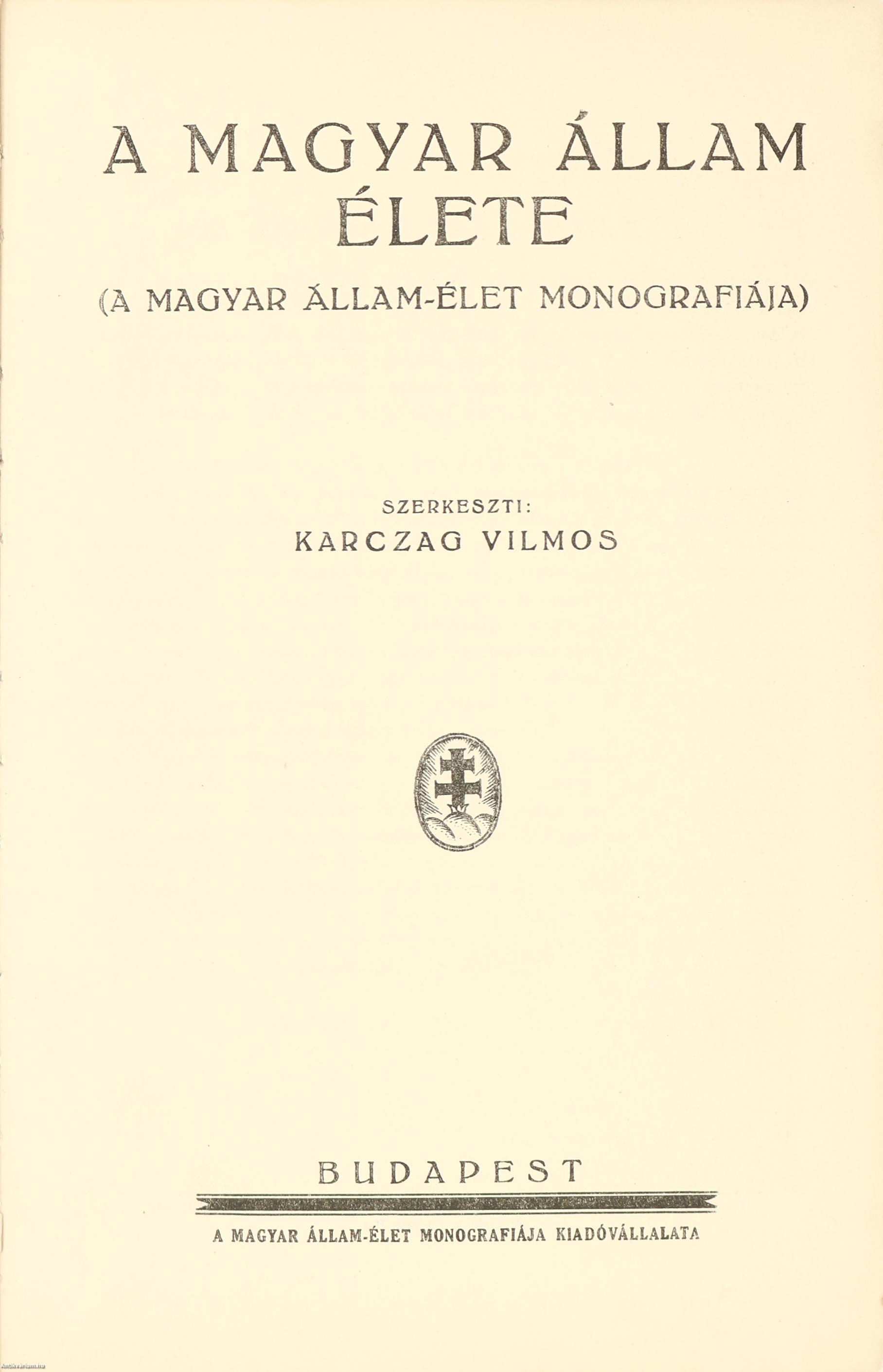 Első kiadás. A magyar állam élete. (A magyar állam-élet monográfiája.) Szerkeszti: Karczag Vilmos.