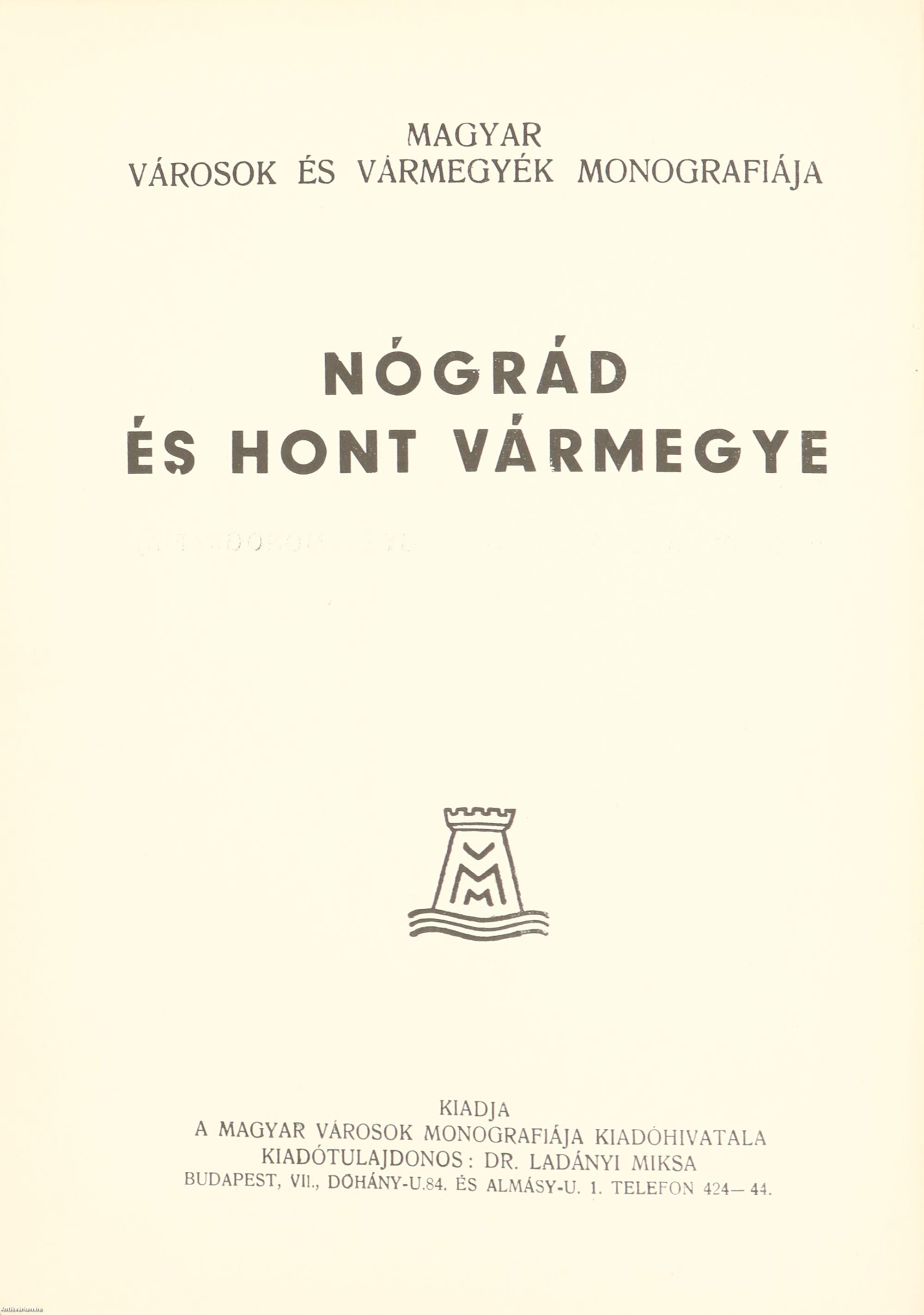 Első kiadás. Magyar Városok és Vármegyék Monográfiája. No.: XVI. sz. Nógrád és Hont vármegye. Sajtó alá rendezte Dr. Ladányi Miksa felelős szerkesztő. Szövegközti, fekete-fehér, feliratozott fotókkal, ábrákkal gazdagon illusztrált, valamint előszóval, tartalomjegyzékkel, Nógrád és Hont Vármegyék községeinek betűrendes jegyzékével, vonatkozó személyes adattárral és a rövidítések magyarázatával kiegészített kötet. A kötet kliséi Wottitz Vilmos budapesti Műintézetében készültek, a kötés a Popper és Csasznik budapesti cég munkája. A címfedél belső oldalán fekete-fehér illusztrációval ellátott Ex-libris címke látható. Nyomtatta Sárik Gyula és Géza Könyvnyomdai Műintézete, Budapest-Cegléd. Kiadói egészvászon sorozatkötésben lévő példány aranyozott feliratos, a vármegyék aranyozott, dombornyomott címereivel illusztrált címfedéllel, színes, mintás, sérült, kiadói előzéklapokkal, egy sérült lappal (209-210. p.), színezett felső lapélekkel, hiánytalan állapotban. A kötet szerkesztője, Dr. Ladányi Miksa monográfus, helytörténész, vármegye-kutató, statisztikus. Nógrád és Hont Vármegyék adattárának összeállítója. Részlet a könyvből: "...Hont és Nógrád megye (2149.83 és 4132.80=67.83 km-nyi) területén őshegységek maradványai, középkorú hegységek, régibb és fiatal vulkáni takarók maradékai, a tűznek, víznek, szélnek képződményei sűrűn váltakoznak egymással. Sőt délen a Nagyalföld, nyugaton pedig a Kisalföld sülyedékei is beléjük nyúlnak valamennyire. Így e földdarab geológiai tekintetben egyike a - nemcsak mai csonka hazánkat, hanem az egész történeti Nagymagyarországot véve is - a legérdekesebb, legváltozatosabb felépítésű és a földi élettörténeti emlékek tekintetében is leggazdagabb, még világviszonylatokban is nevezetes részeknek, földterületeknek..."
