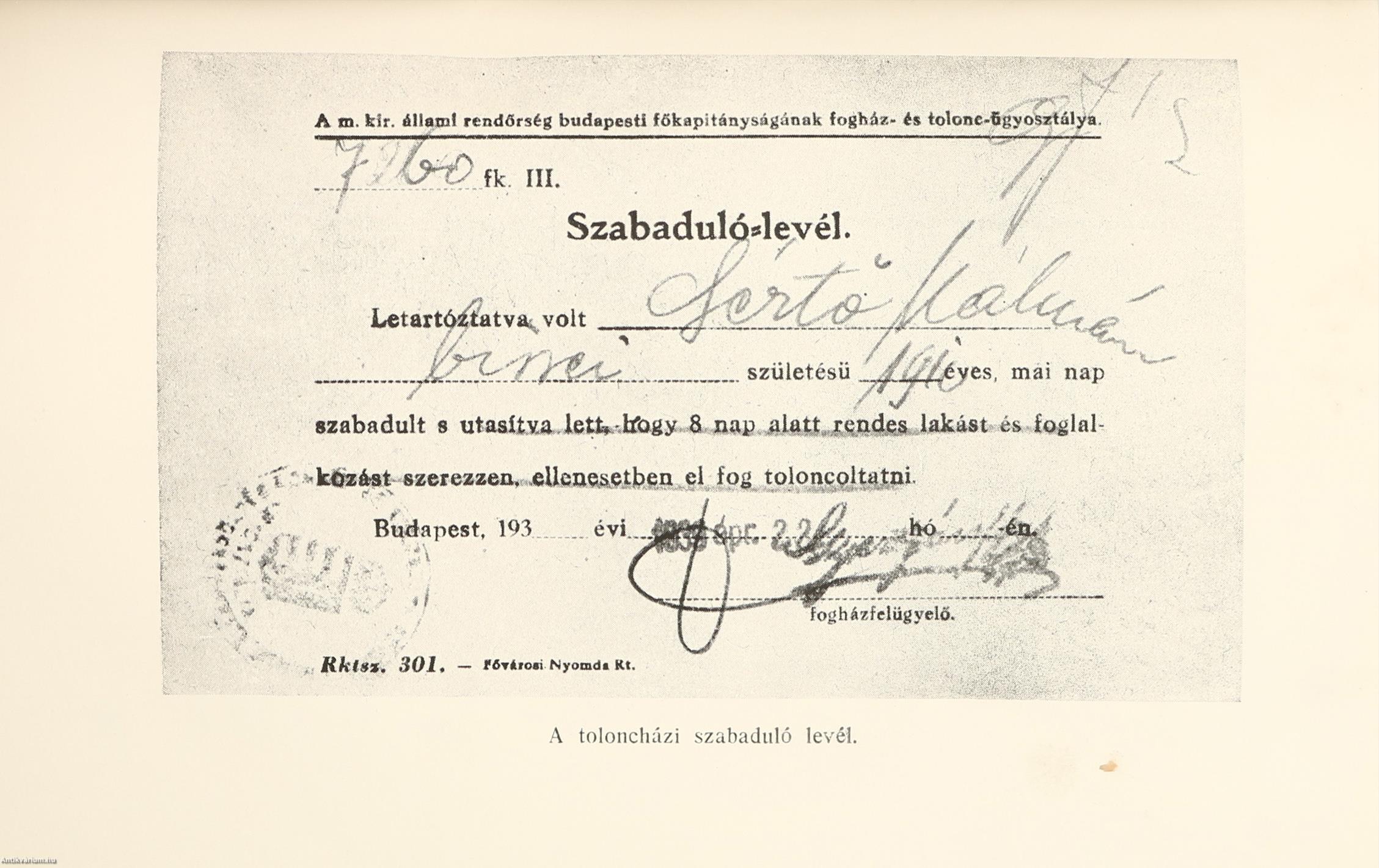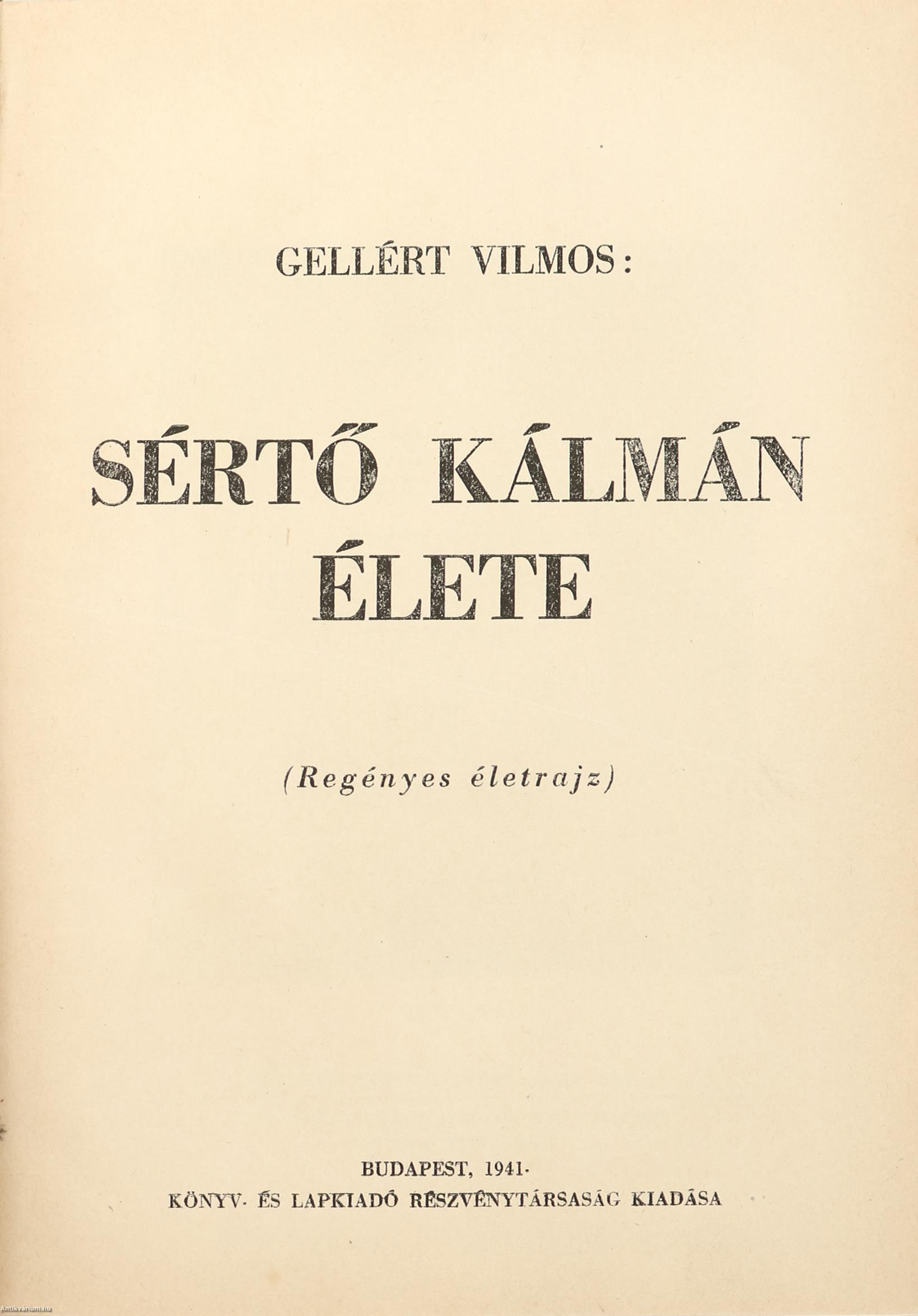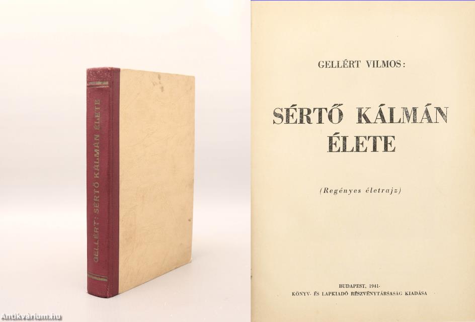 Első kiadás. Sértő Kálmán élete. Regényes életrajz. Írta: Gellért Vilmos. Sértő Kálmán fekete-fehér portréjával, további 23 fekete-fehér, feliratozott képtáblával és néhány szövegközti, dokumentummásolattal illusztrált, valamint szerzői ajánlással, Fiala Ferenc előszavával és bevezetéssel kiegészített kötet. Nyomtatta a Szeged Városi Nyomda és Könyvkiadó Rt. Kiadói félvászon kötésben lévő példány feliratozatlan, mintás, foltos címfedéllel, aranyozott feliratozású könyvgerinccel, feliratozatlan, mintás hátlappal, hiánytalan állapotban, kiadói borítófedél nélkül. Sértő Kálmán (1910-1941) költő, író, újságíró. Leginkább szélsőjobboldali, hungarista eszméket propagáló és a hazai nemzetiszocialista mozgalmat "megéneklő" verseiről ismert szerző, az Összetartás c. nyilas lap munkatársa. Gruber Vilmos /írói álneve: Gellért Vilmos/ (szül.: Eszék, 1909. február 4.) költő, író, lapszerkesztő, hírlapíró. Tanulmányai befejeztével hírlapíróként kezdett dolgozni. A Somogyi Újság munkatársa, azt követően pedig a kaposvári Riport Újság felelős szerkesztője volt. Írásai a helyi lapokban, valamint Tatár János: Dunántúli antológia c. gyűjteményes kötetben jelentek meg.