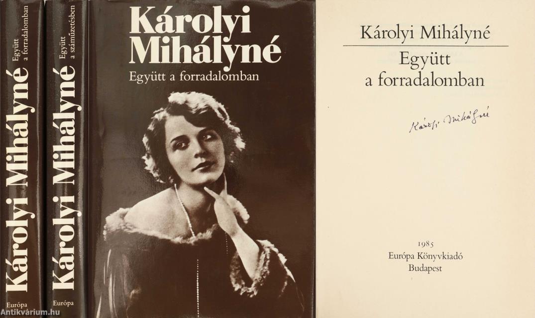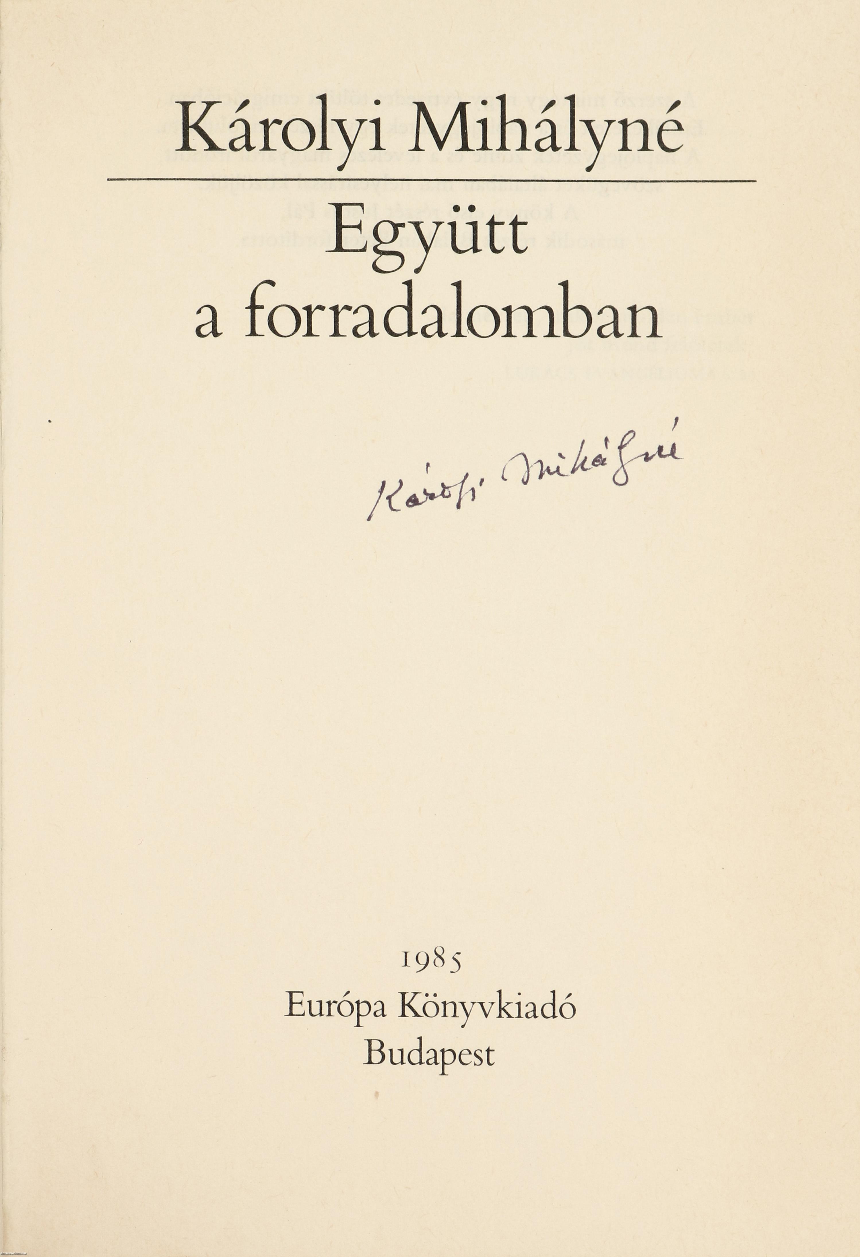 Szerző által aláírt példány. Együtt a forradalomban / Együtt a száműzetésben. (egységes külön kötetekben). Írta: Károlyi Mihályné. Az "Együtt a forradalomban" c. kötet címlapján a szerző, Károlyi Mihályné tollal beírt, jól olvasható aláírása látható. "A szerző mintegy négy évtizedet töltött emigrációban. Emlékezéseit és a naplójegyzetek egy részét angolul írta. A naplójegyzetek zöme és a levelezés magyarul íródott, szövegüket általában mai helyesírással közöljük". Negyedik kiadás. Az "Együtt a forradalomban" c. kötet első részét Justus Pál, második részét Balabán Péter, a "Együtt a száműzetésben" c. kötetet Balabán Péter fordította. A névmutatót Varga István készítette. A verseket Tótfalusi István fordította. A védőborító és a kötésterv Urai Erika munkája. A védőborítók a szerző fiatalkori és az 1930-as években készült arcképének felhasználásával készült. Összesen 32 fekete-fehér képtáblával (kötetenként 16) illusztrált kötetek. Az első kötetben két képtábla duplán lett bekötve (177. p.). Nyomattak az Alföldi Nyomdában Debrecenben. Kiadói egészvászon kötésben lévő kötetek, két színnel feliratozott címfedéllel és könyvgerinccel, hiánytalan állapotban, feliratos, fekete-fehér fényképpel illusztrált, fülszöveges, kiadói borítófedélben. A kötet szerzője, Gróf csíkszentkirályi és krasznahorkai Andrássy Katinka /Károlyi Mihályné/ (Tiszadob, 1892. szeptember 21. – Antibes, 1985. június 12.) Károlyi Mihálynak, a Magyar Népköztársaság első miniszterelnökének, majd köztársasági elnökének a felesége, Andrássy Gyulának, a dualizmus első miniszterelnökének az unokája. "...Károlyi Mihályné Andrássy Katinka emlékirata [...] egy tanulságos kordokumentum, melyen keresztül az arisztokrata emlékirat sajátosságai fedezhetőek fel. Visszaemlékezése először egy kötetben - 1966-ban Londonban, angol nyelven - jelent meg. Ebből készült a kétkötetes magyar fordítás: Együtt a forradalomban (1968) és Együtt a száműzetésben (1969) címmel. Az első kötet gyermekkorától 1919-ig tekinti át az eseményeket. Itt kaptak helyet a világháborús gondolatok. A második kötetben már az emigráció időszakát dolgozta fel..." - (Nagy Adrienn: A „Nagy Háború" az egyéni emlékezetek tükrében, Pro Minoritate, 2017./3. szám).
