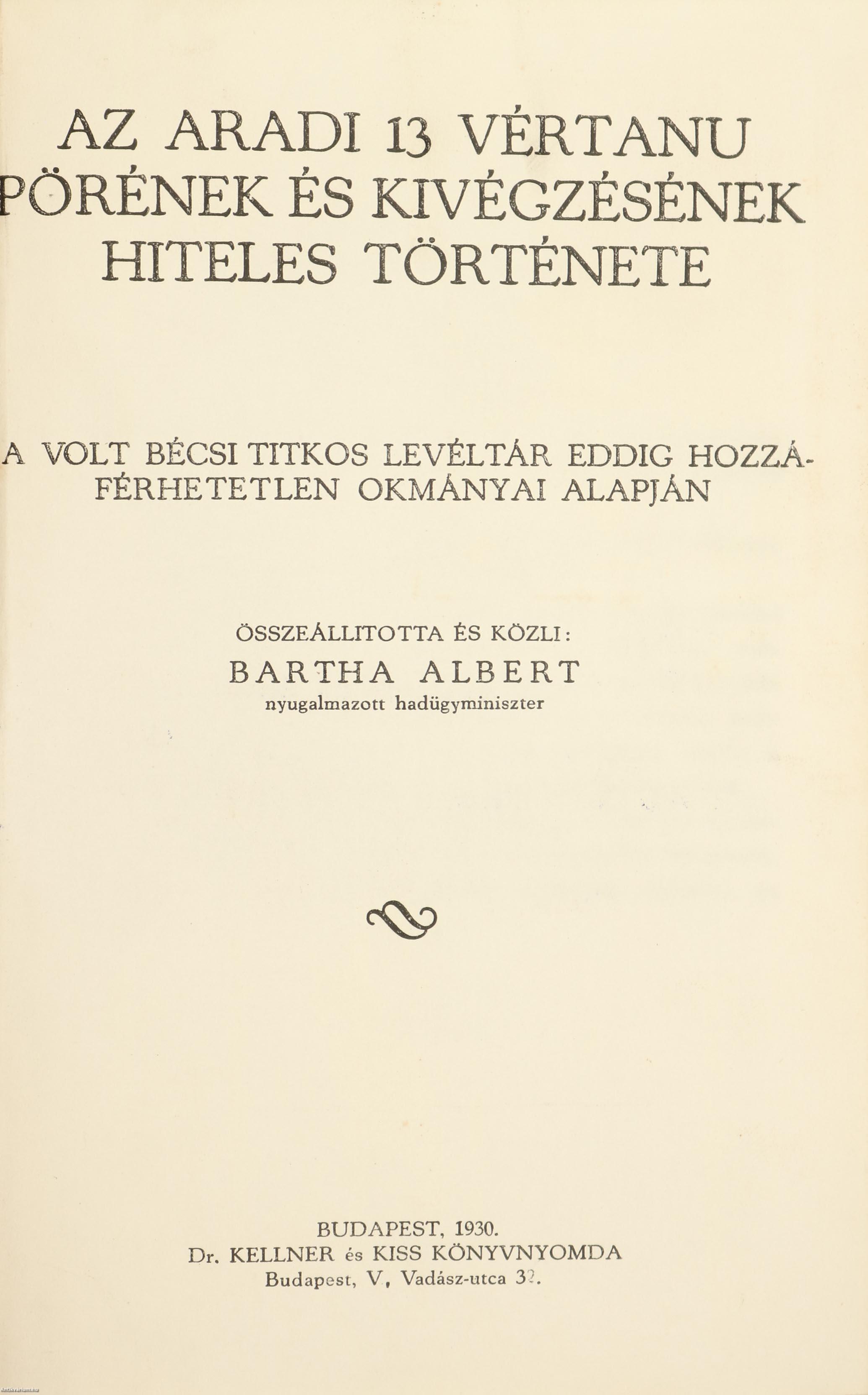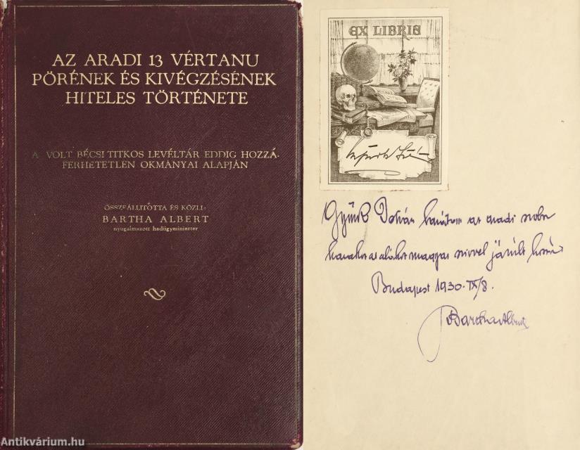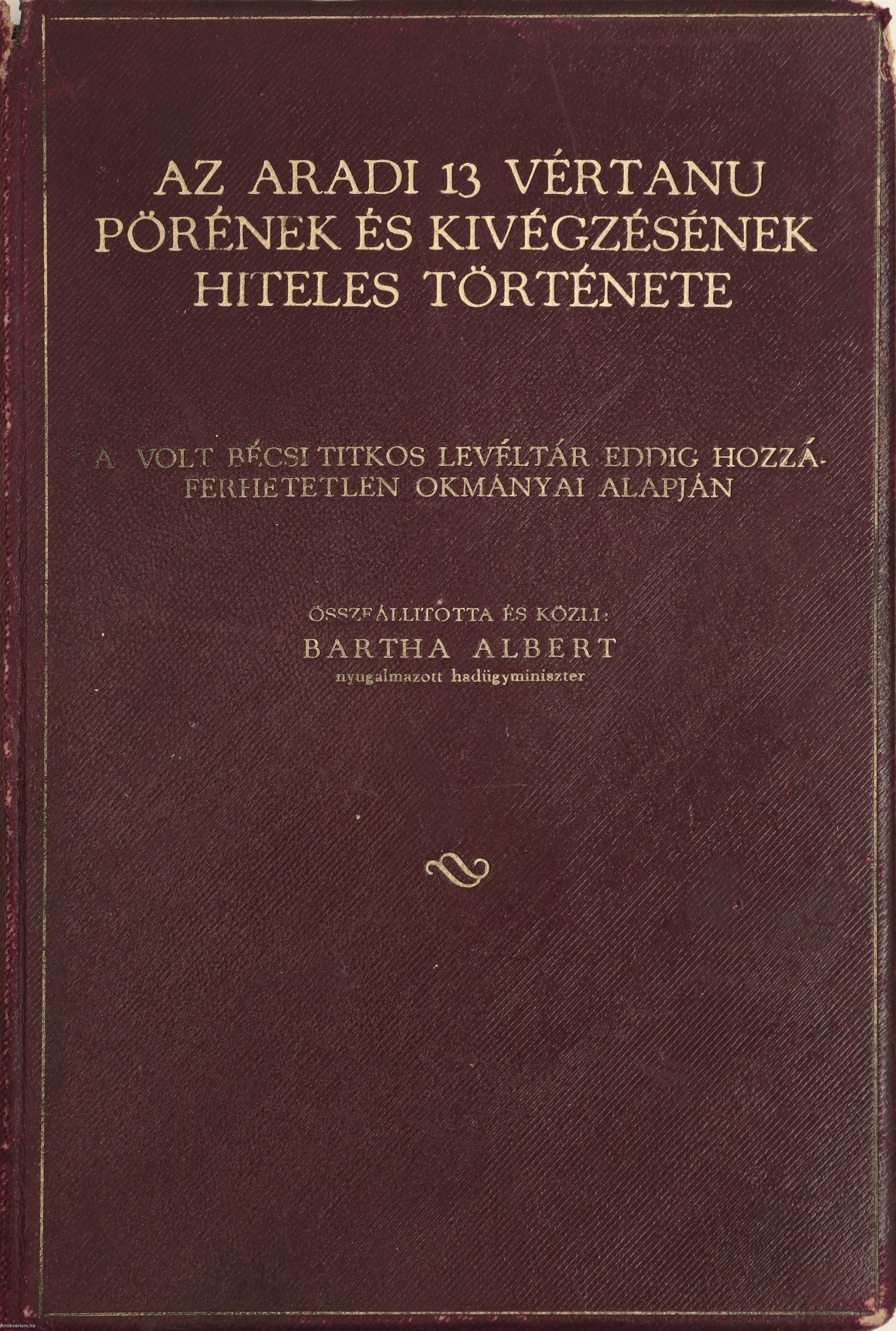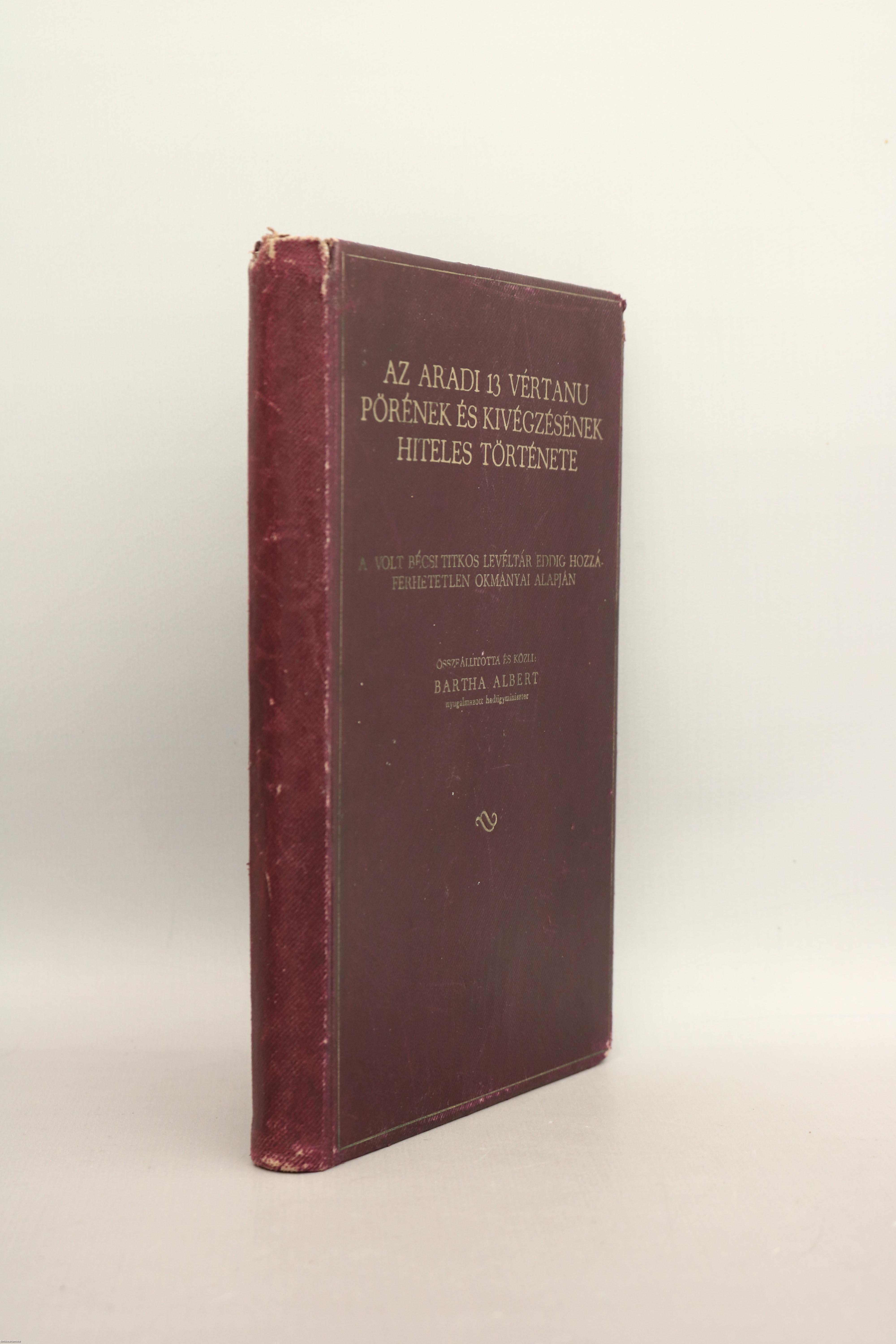 Szerző által dedikált példány. Első kiadás. Az aradi 13 vértanu pörének és kivégzésének hiteles története. A volt bécsi titkos levéltár eddig hozzáférhetetlen okmányai alapján. Összeállította és közli: Bartha Albert nyugalmazott hadügyminiszter.