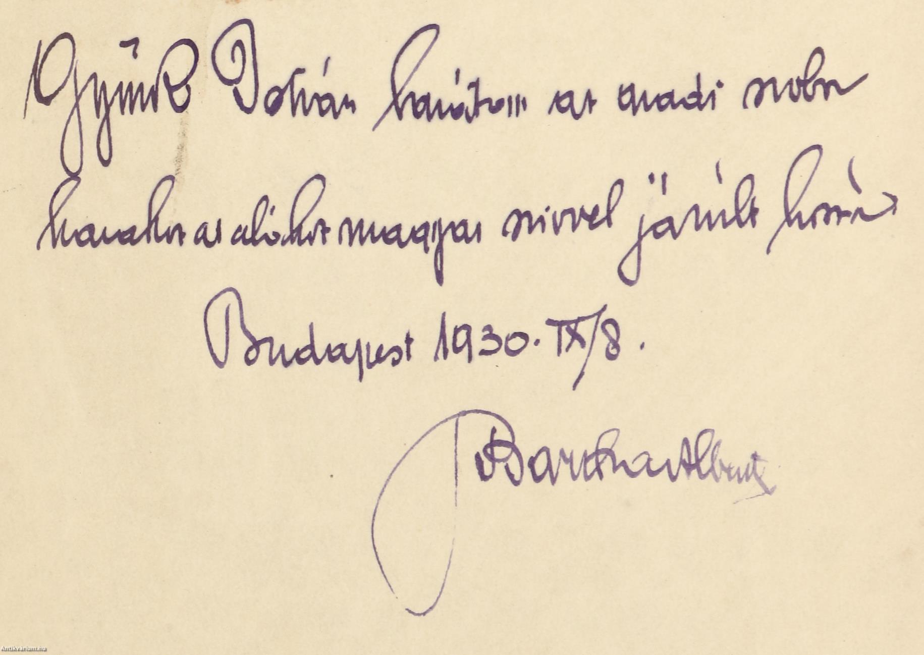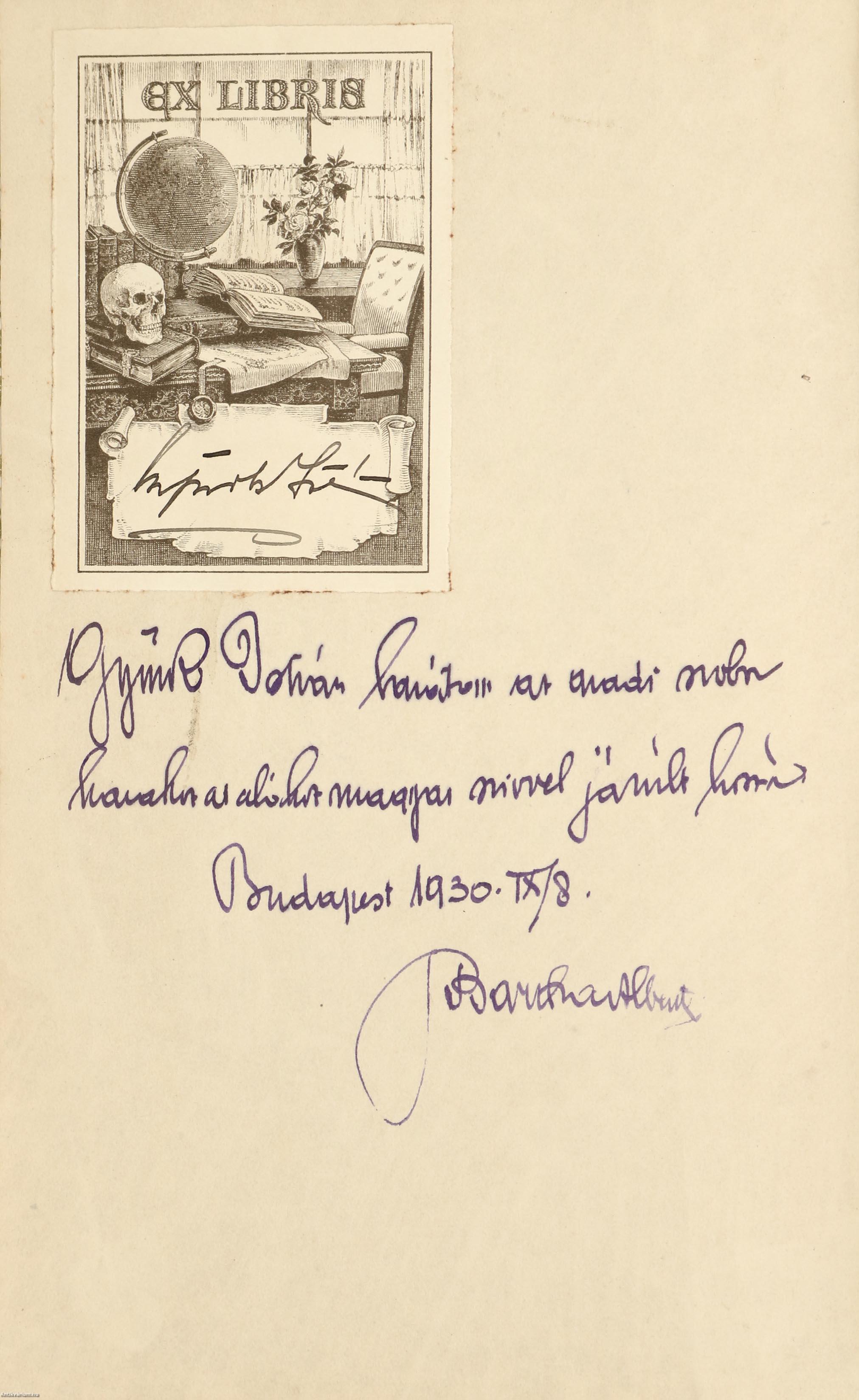Az első előzéklap hátoldalán a szerző, Bartha Albert tollal beírt, névre szóló dedikációja olvasható: "Gy. I. barátom az aradi szobor hazahozatalához magyar szivvel járult hozzá. Budapest 1930. IX/8. Bartha Albert"