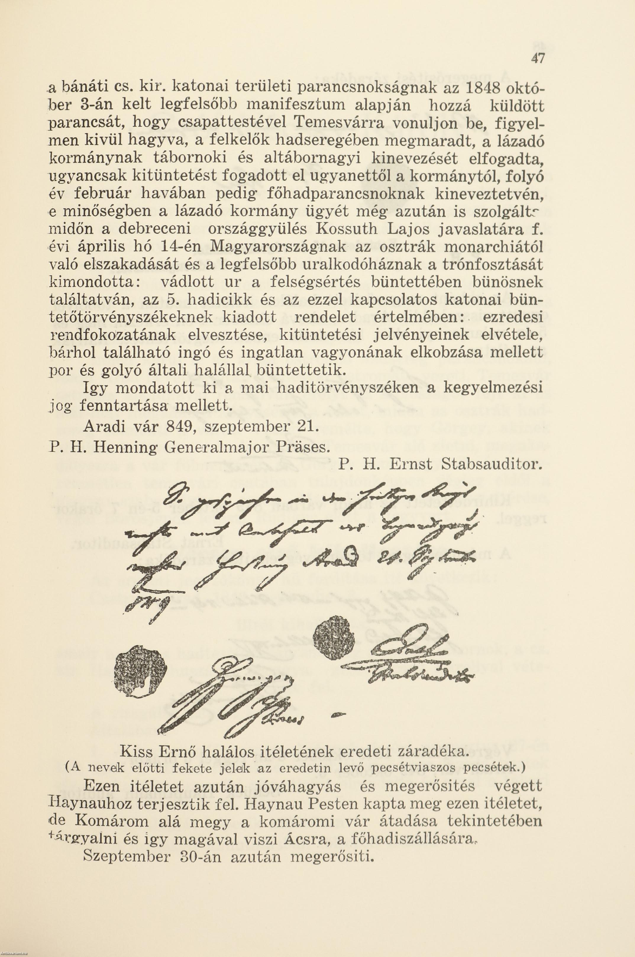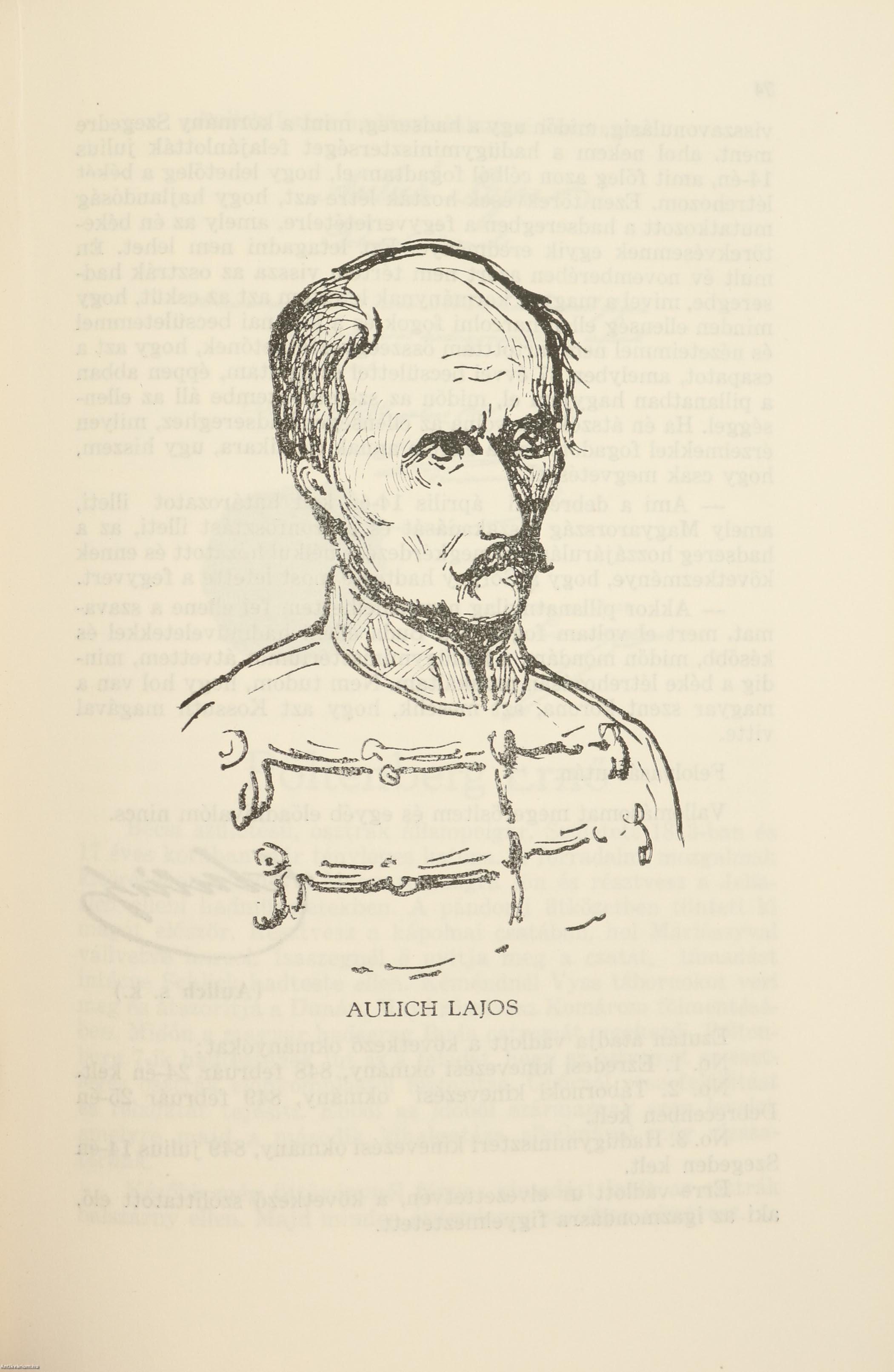 Ez indított arra, hogy az aradi várbörtön titkos aktáit fölkutassam és közzétegyem. De meg kell jegyeznem a következőket. E törvényszéki aktákban nem szabad szenzációt keresni, nem szabad a vértanukat hetvenkedő, cinikus bűnösökként elképzelni, - akik reklám vagy demagógiából komolytalanul viselkednének a hadbiróság előtt. Nem. Ezek mindenike komoly, megfontolt katona, csaknem mindenki katonai nevelésben részesült, huzamosabb időt töltött annak az osztrák hadseregnek a szolgálatában, amellyel azután a magyar alkotmányra letett esküje által szembekerült és amely eskünek létezéséről az osztrák hadbiró sohasem vett tudomást, annak tárgyalásába soha sem bocsájtkozik, mert hiszen neki jól-rosszul, de meg kell teremteni azt a törvényes alapot, amelynek alapján kimondhatja azt a halálos itéletet, ami neki - mint már mostan a kutatásokból pontosan megállapitható - Haynau által meg volt parancsolva.