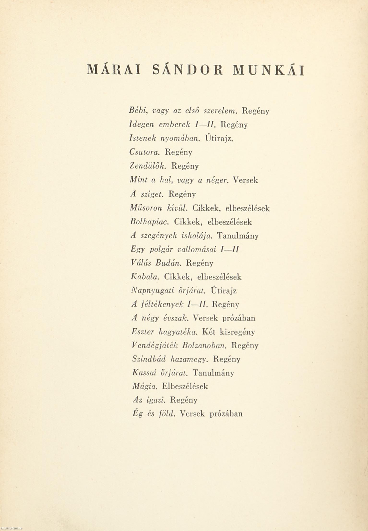 A címlapon a szerző, Márai Sándor tollal beírt, névre szóló dedikációja olvasható: "K. G-nak barátsággal Márai Sándor 1942."