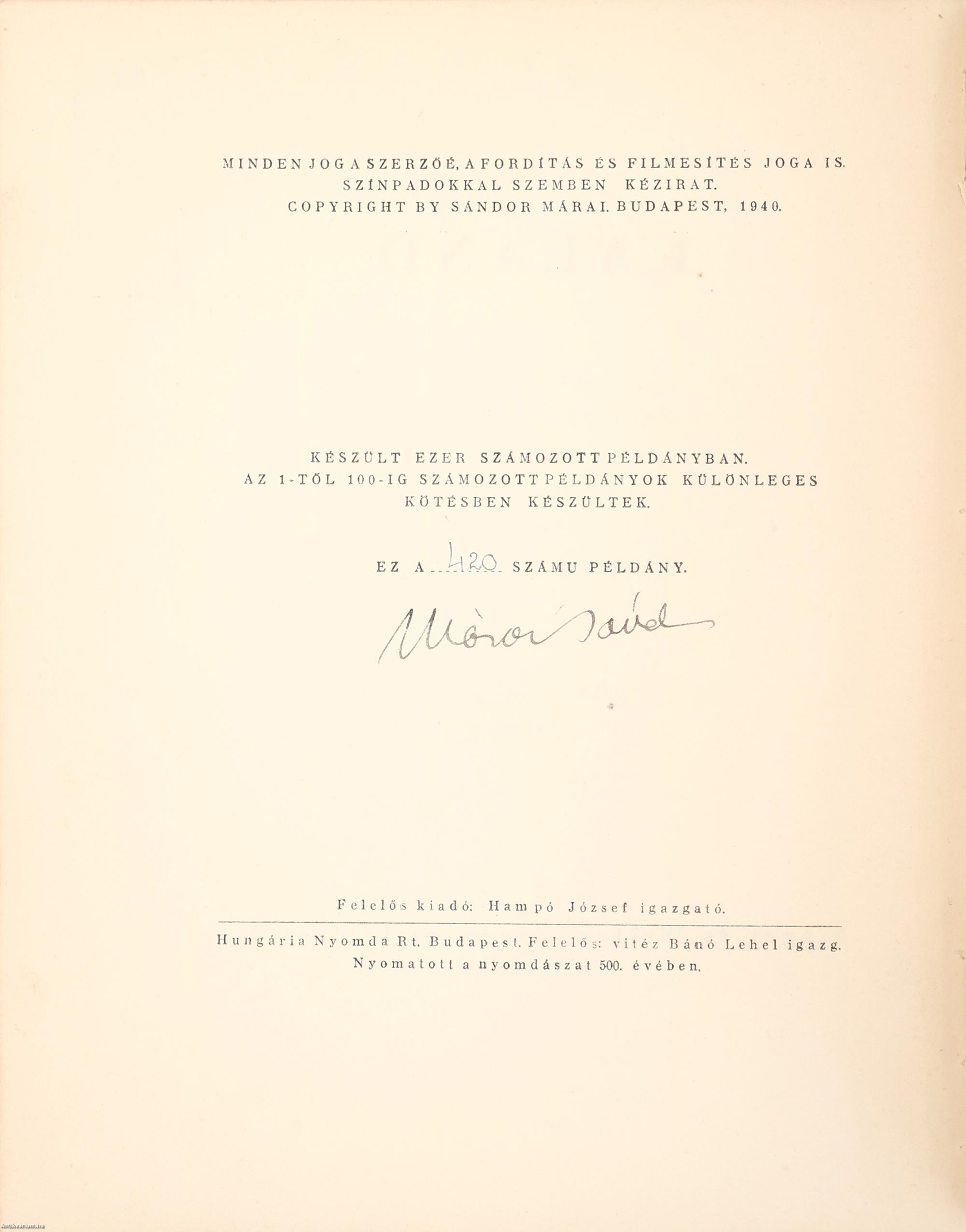 A címlap hátoldalán a szerző, Márai Sándor tollal beírt, jól olvasható aláírása látható.