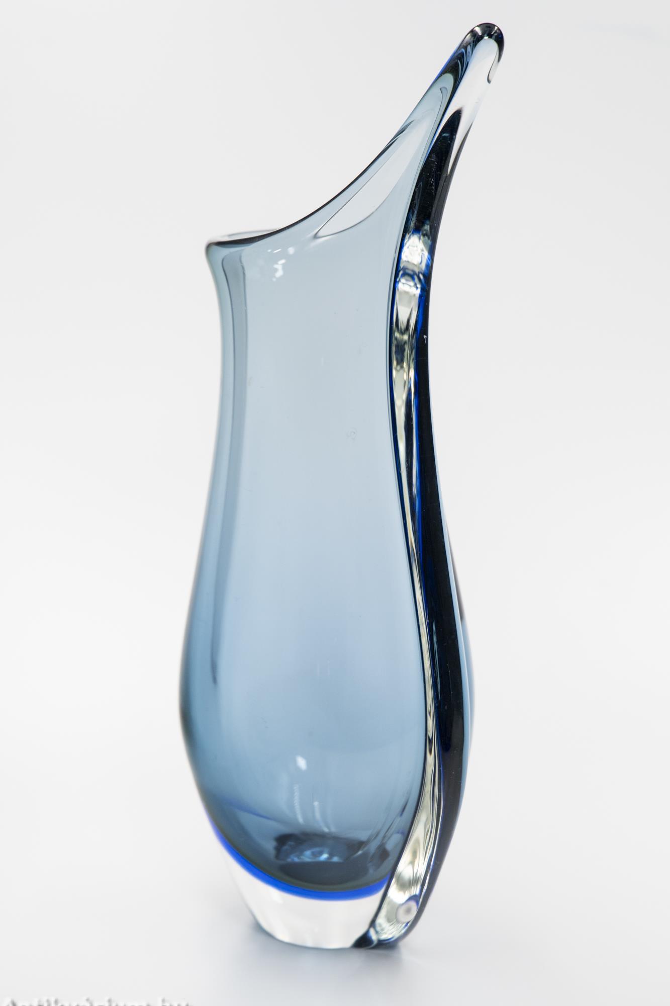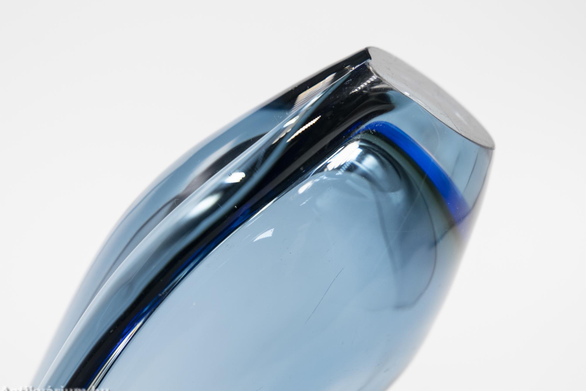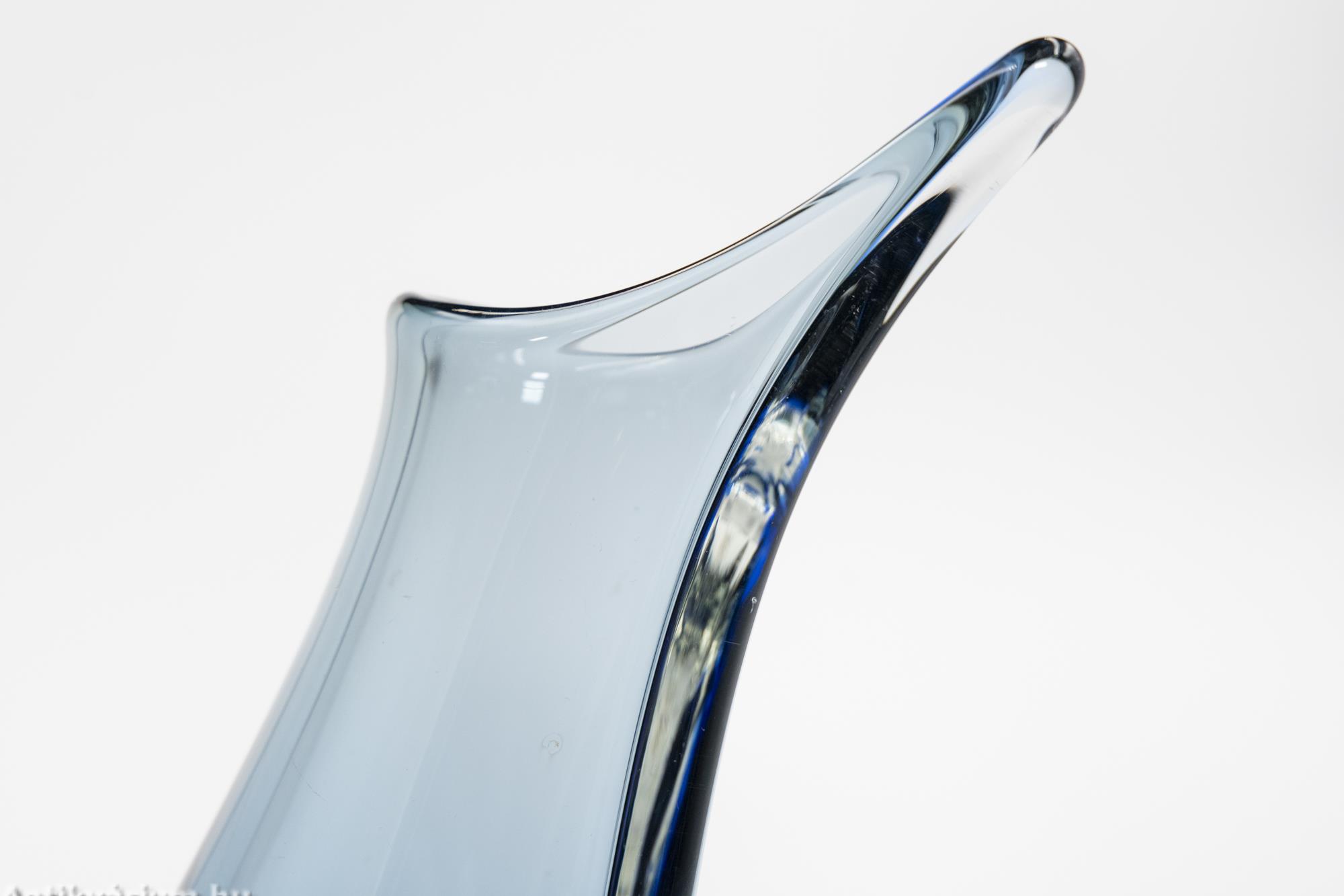 Hibátlan állapotú, fújt és kézzel készített Flavio Poli által tervezett üveg váza a Seguso számára az 1950-es évekből. Organikus, szinte folyékony víz állapotot formázó, kék tónusú kristályváza sommerso technikával készült kétszínű üvegréteggel. A sommerso üvegkészítési eljárás során a fújt üvegtárgyak több réteget kapnak. Ezek a rétegek általában különböző színűek. Ezt a hatást úgy érik el, hogy a tárgyat többször mártják különböző színű olvadt üvegbe. Ez nagyon vastag és nehéz üvegtárgyakat eredményez. A Sommerso szó szerint azt jelenti, hogy „elmerült”. Letisztult, elegáns, modern formavilágú művészi üveg váza.