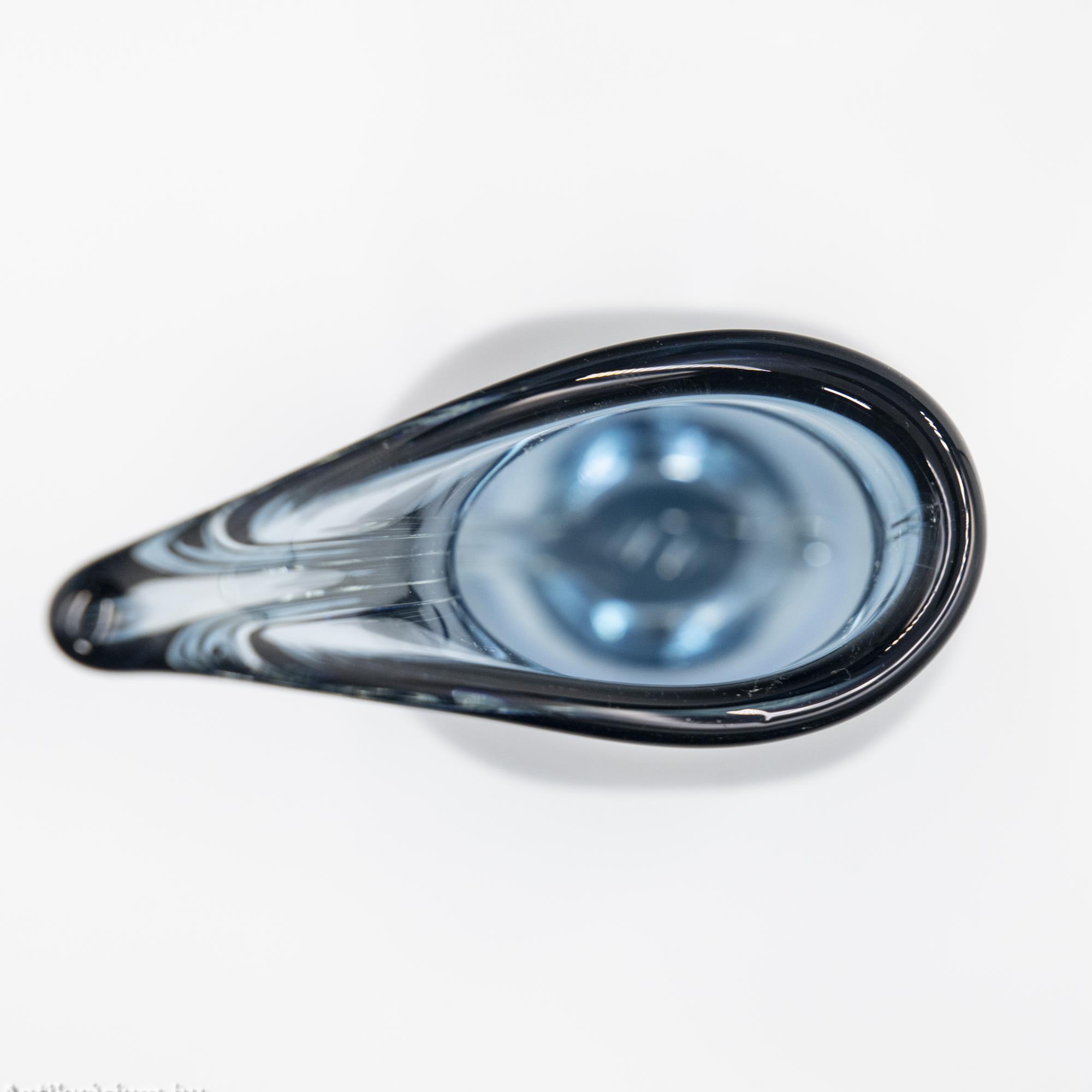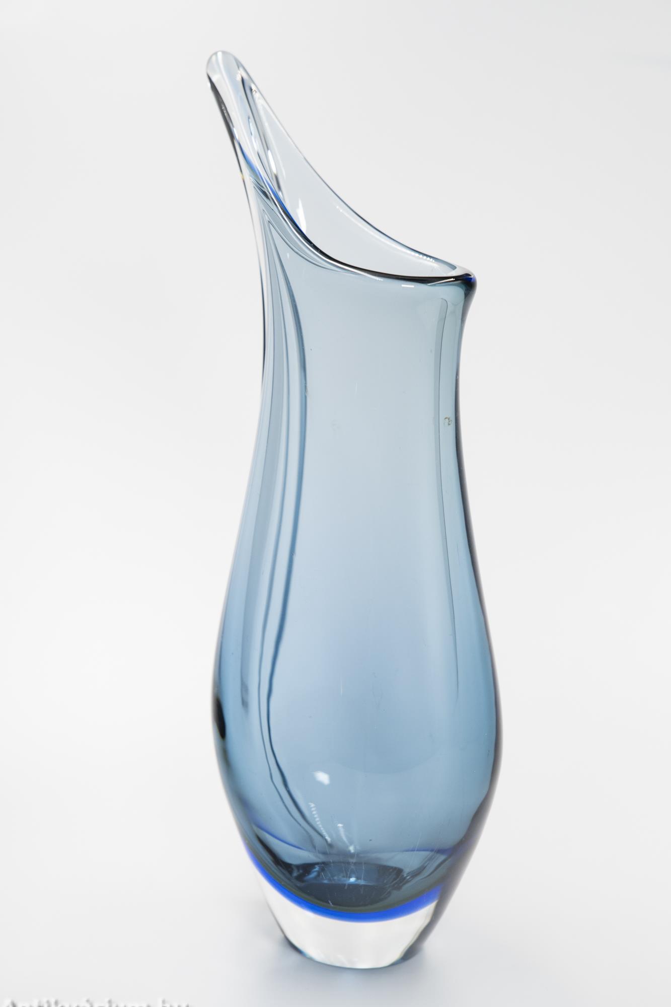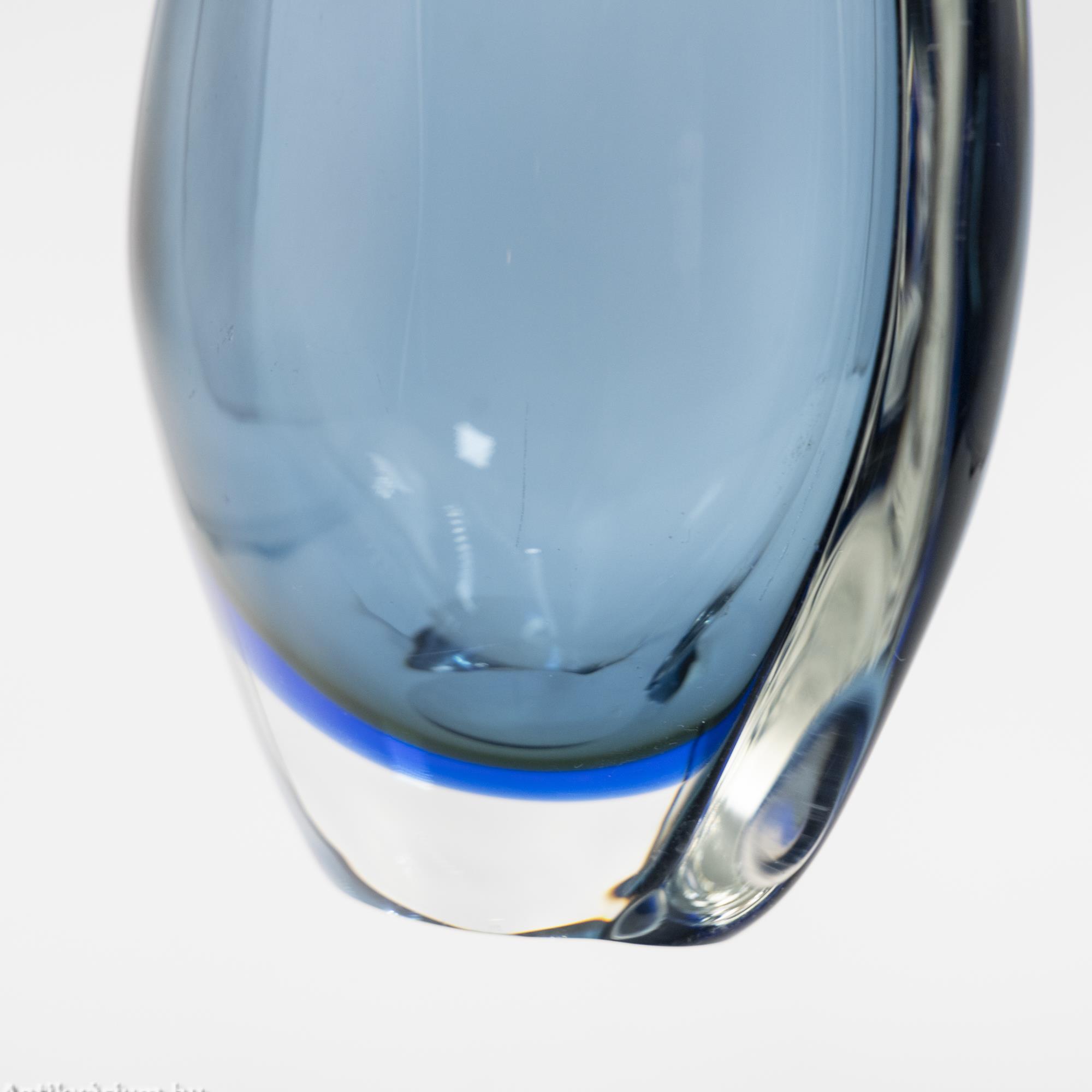 Hibátlan állapotú, fújt és kézzel készített Flavio Poli által tervezett üveg váza a Seguso számára az 1950-es évekből. Organikus, szinte folyékony víz állapotot formázó, kék tónusú kristályváza sommerso technikával készült kétszínű üvegréteggel. A sommerso üvegkészítési eljárás során a fújt üvegtárgyak több réteget kapnak. Ezek a rétegek általában különböző színűek. Ezt a hatást úgy érik el, hogy a tárgyat többször mártják különböző színű olvadt üvegbe. Ez nagyon vastag és nehéz üvegtárgyakat eredményez. A Sommerso szó szerint azt jelenti, hogy „elmerült”. Letisztult, elegáns, modern formavilágú művészi üveg váza.
