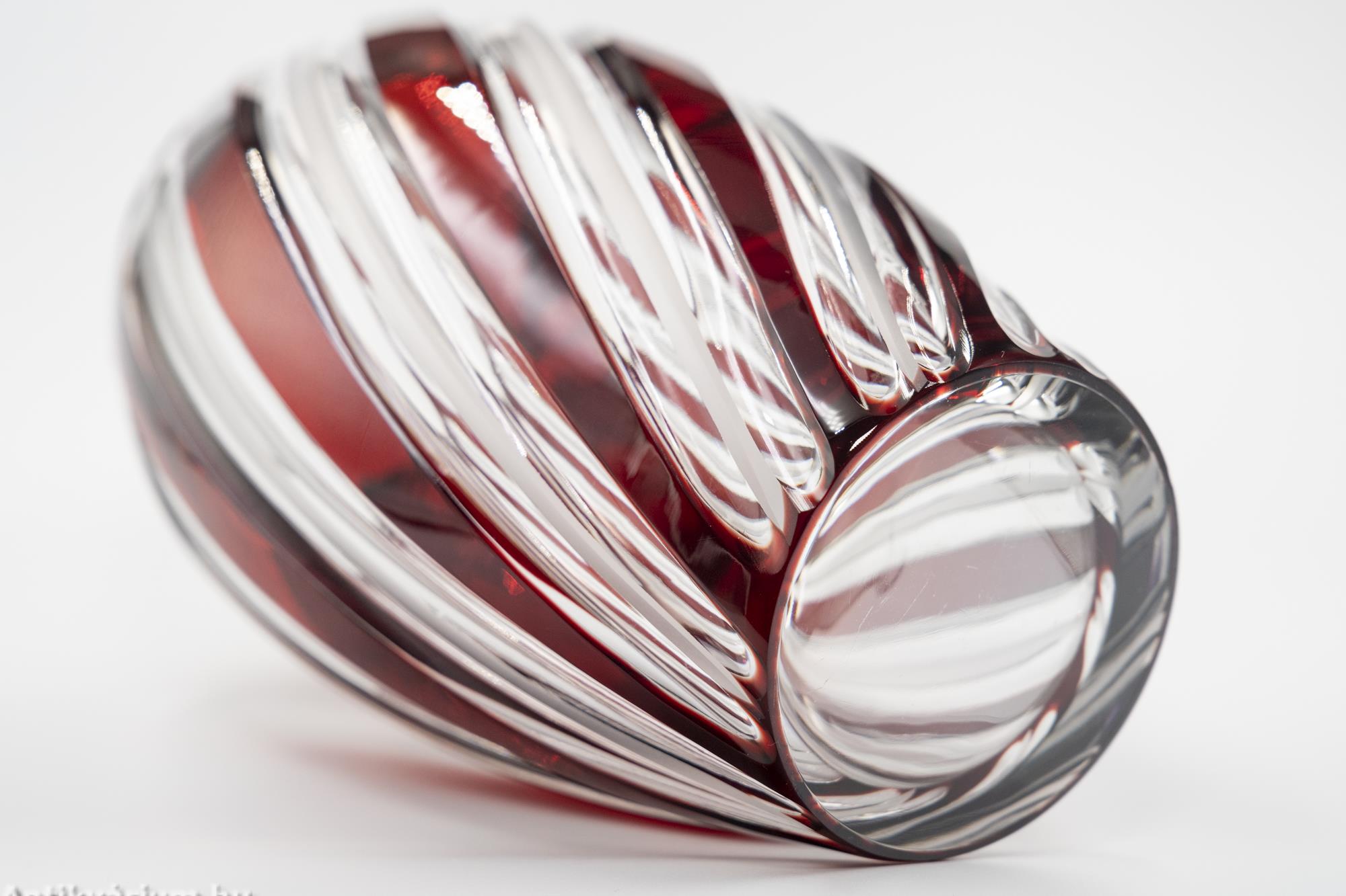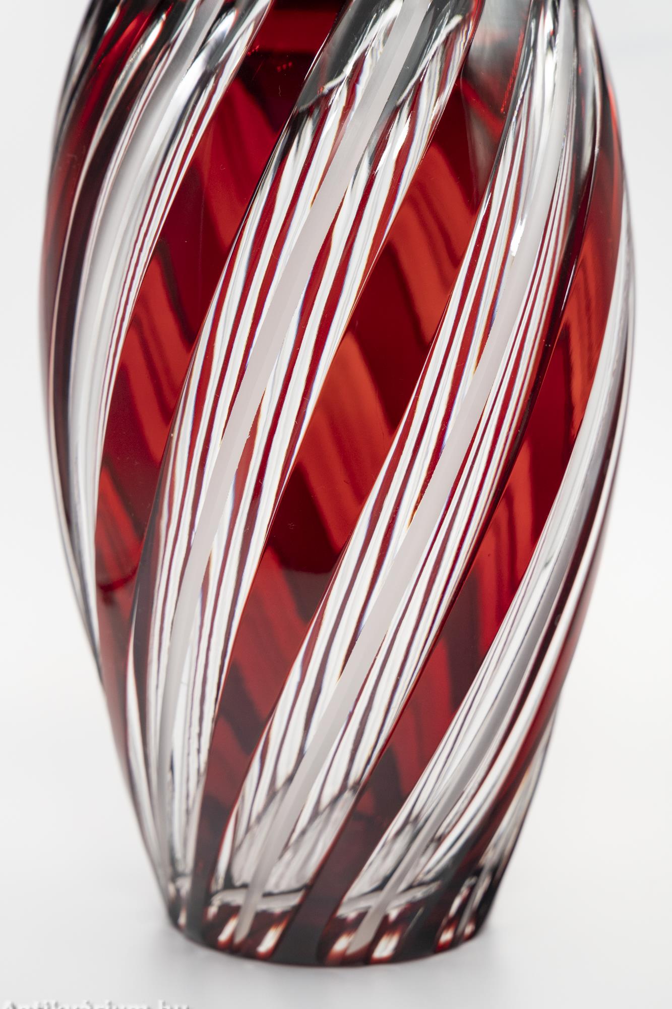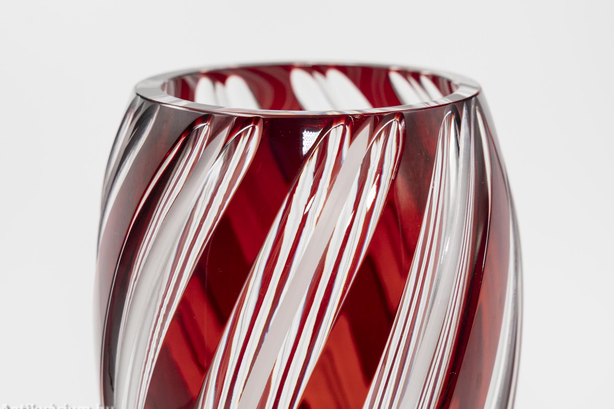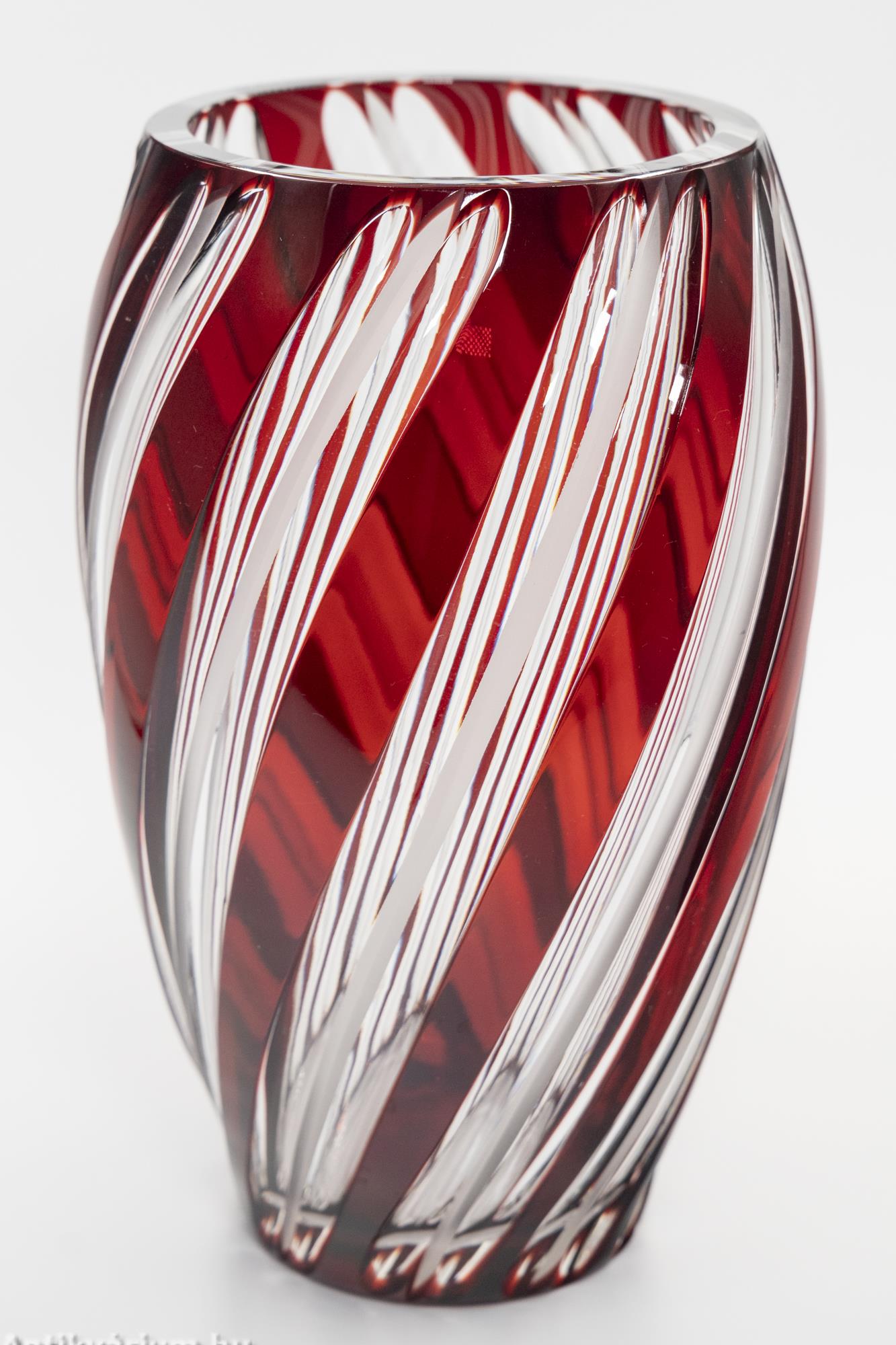 Hibátlan állapotú, fújt és kézzel formázott Val Saint Lambert art deco stílusú, überfang üveg váza a 20. század első feléből. Tömör, nagysúlyú, vastagfalú, kétrétegű váza, amely színtelen kristályüvegből (ólomüveg) készült piros rátéttel. Hámozott csiszolása teljes felületen megjelenő spirál minta, amely a többszörös fénytörés miatt különleges optikai hatás kelt. Pereme polírozott, talpa lapracsiszolt. A kristály ragyogásáról ismert anyag, amely vegyületeinek tisztaságáról, fénytörési minőségéről és vastagságáról különböztethető meg. Különleges jellemzője a csiszolás, amikor a vágó a mintadarabra húzott mintát belevágja az üveg felületébe. Minden vágástípus egy adott motívumot hoz létre, például ferde vágást, könnycseppeket, geometrikus paneleket és az ikonikus gyémántvágást.