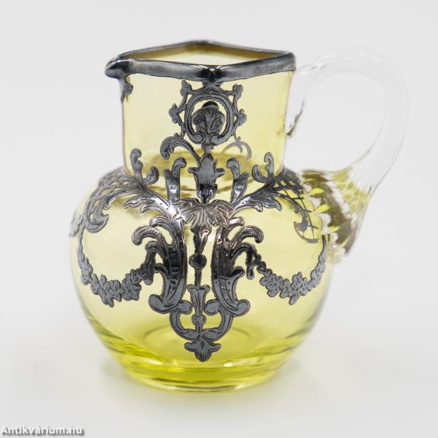 Hibátlan állapotú, fújt és kézzel formázott Loetz ezüst rátétes szecessziós mini kancsó a 20. század elejéről. Különleges uránzöld üvegfelülete és négyszögletes kiöntős pereme ezüst lemezből mintára vágott applikációval díszített, amely részletgazdagon kidolgozott füzérszerű növény ornamentikát jelenít meg. A színtelen, henger formájú, több üvegszálból húzott fogantyú a kancsó részeként formázott, és a darab tetejétől lefelé csillag alakban kapcsolódik a gömbformájú alsó részéhez. Ez egy ritka színű és méretű gyűjtői darab, igényes művészi kidolgozással.