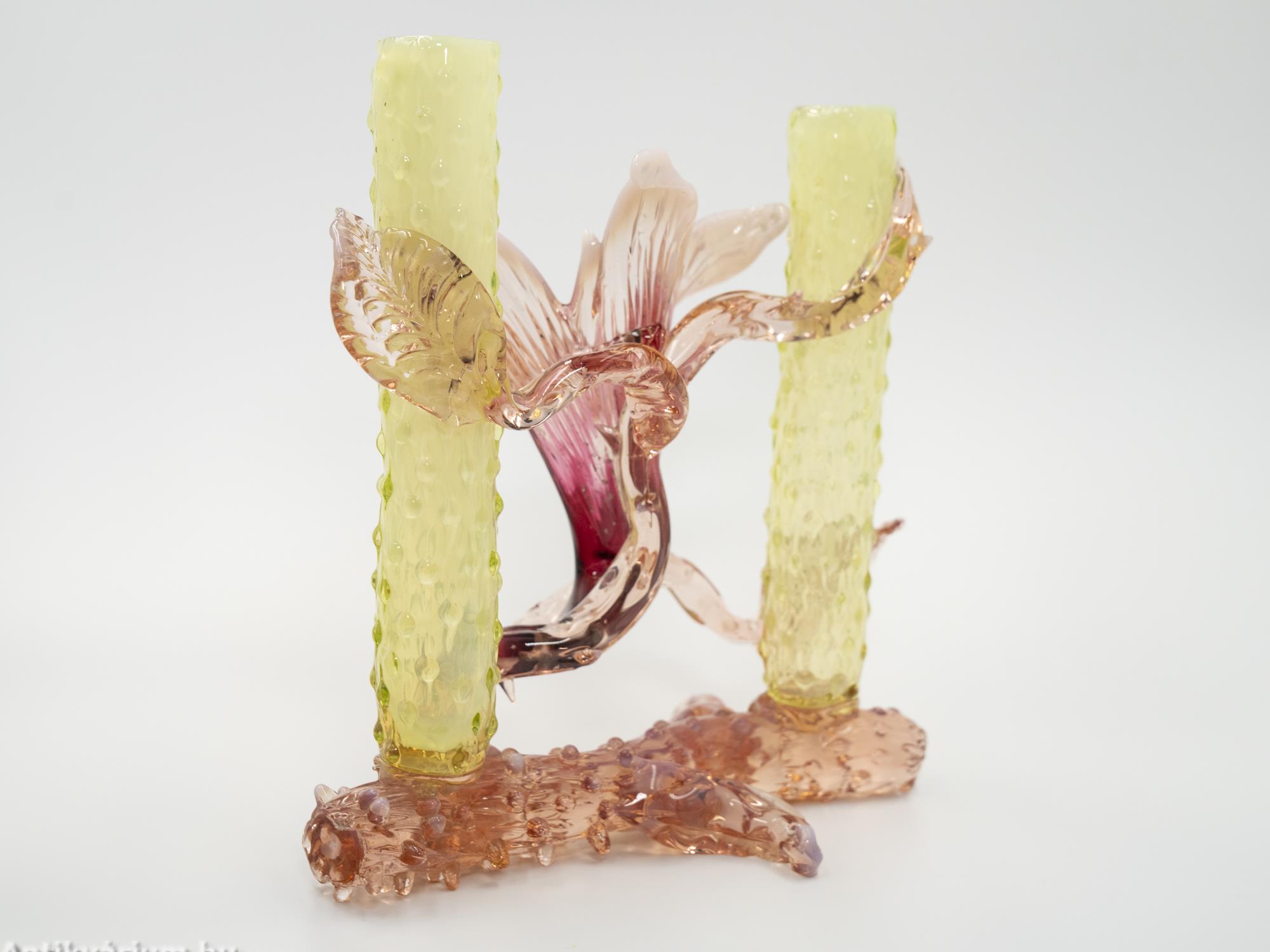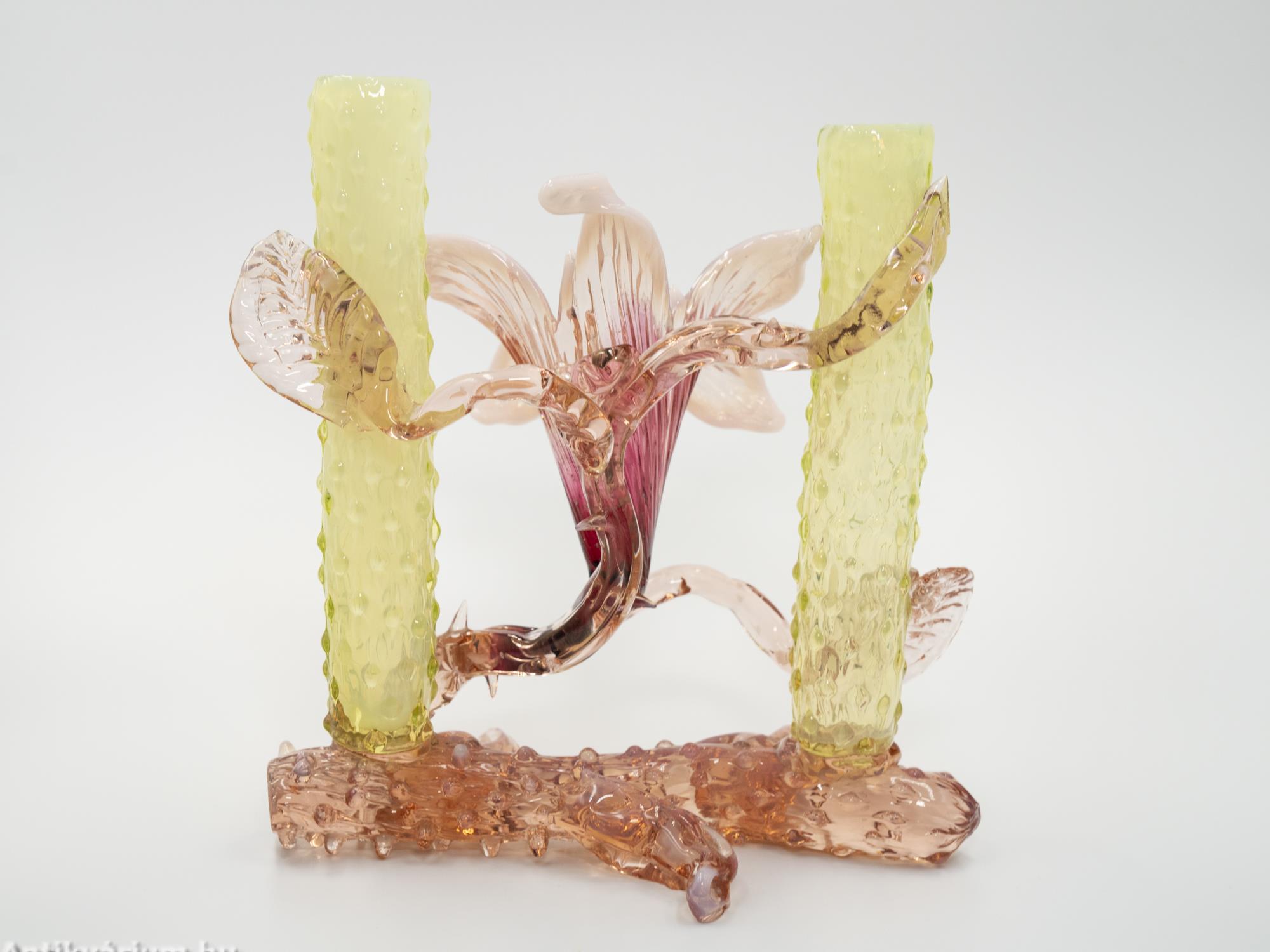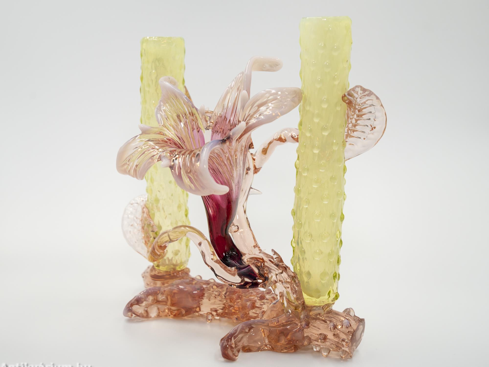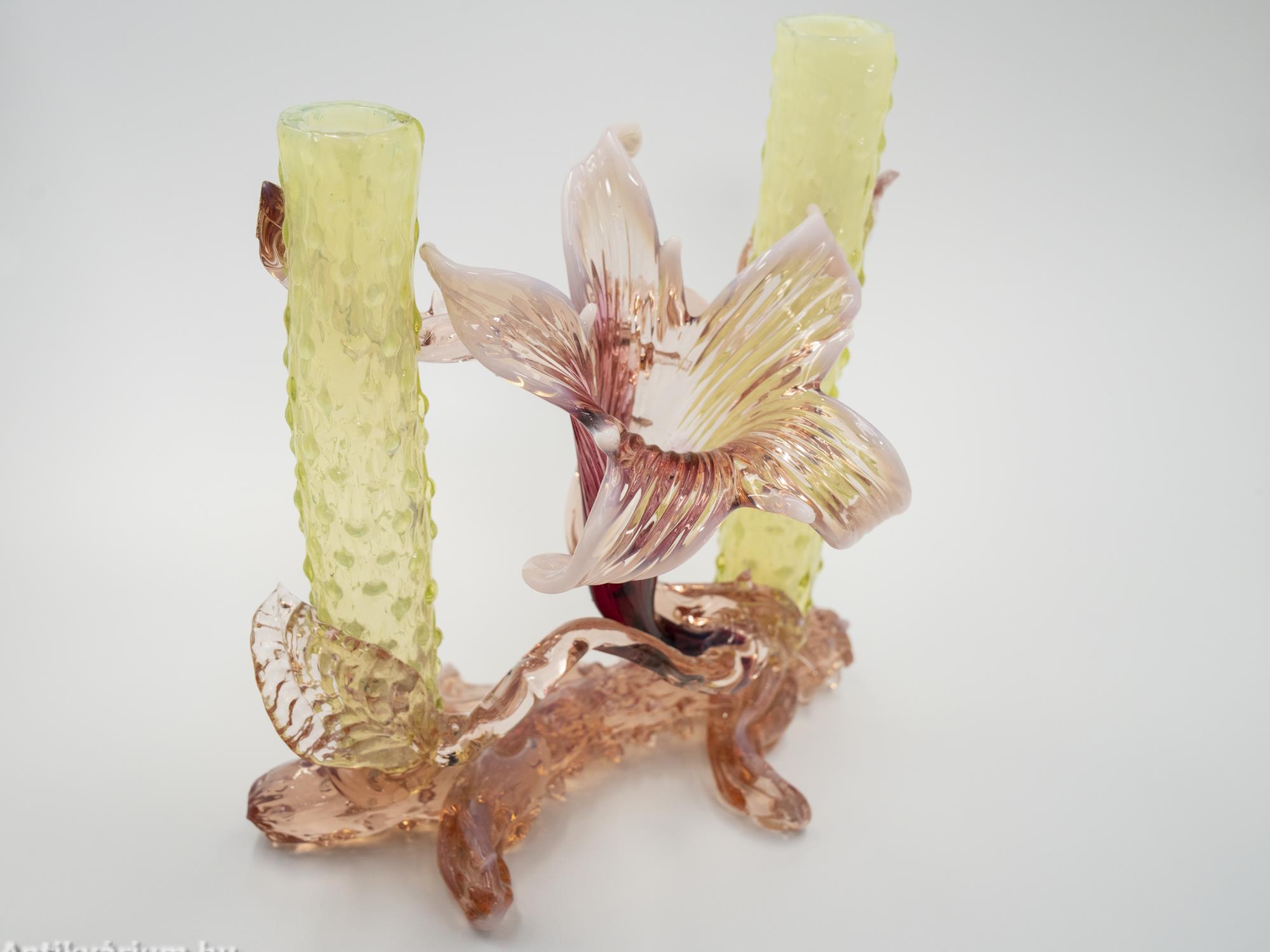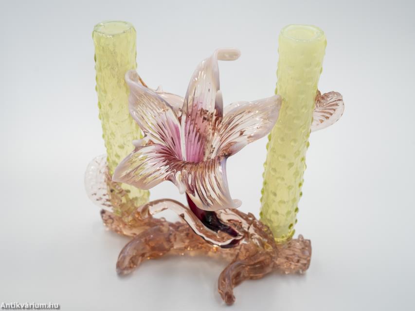 Hibátlan állapotú, fújt és kézzel formázott Kralik Floriform üveg váza - üveg dísztárgy a 19. század végéről. Pink színű virágforma opalin üvegből készített szirmokkal, amit cseppformájú üvegrátétekkel díszített, kétoldali sárga és narancssárga egyszálvirágos vázaszár fog közre. Jellegzetes alkotás a Králik Üveggyár szecessziós időszakából. Ezek a gyönyörű virágos vázák mind egyediek, mindegyik más formában és színben tündököl.
